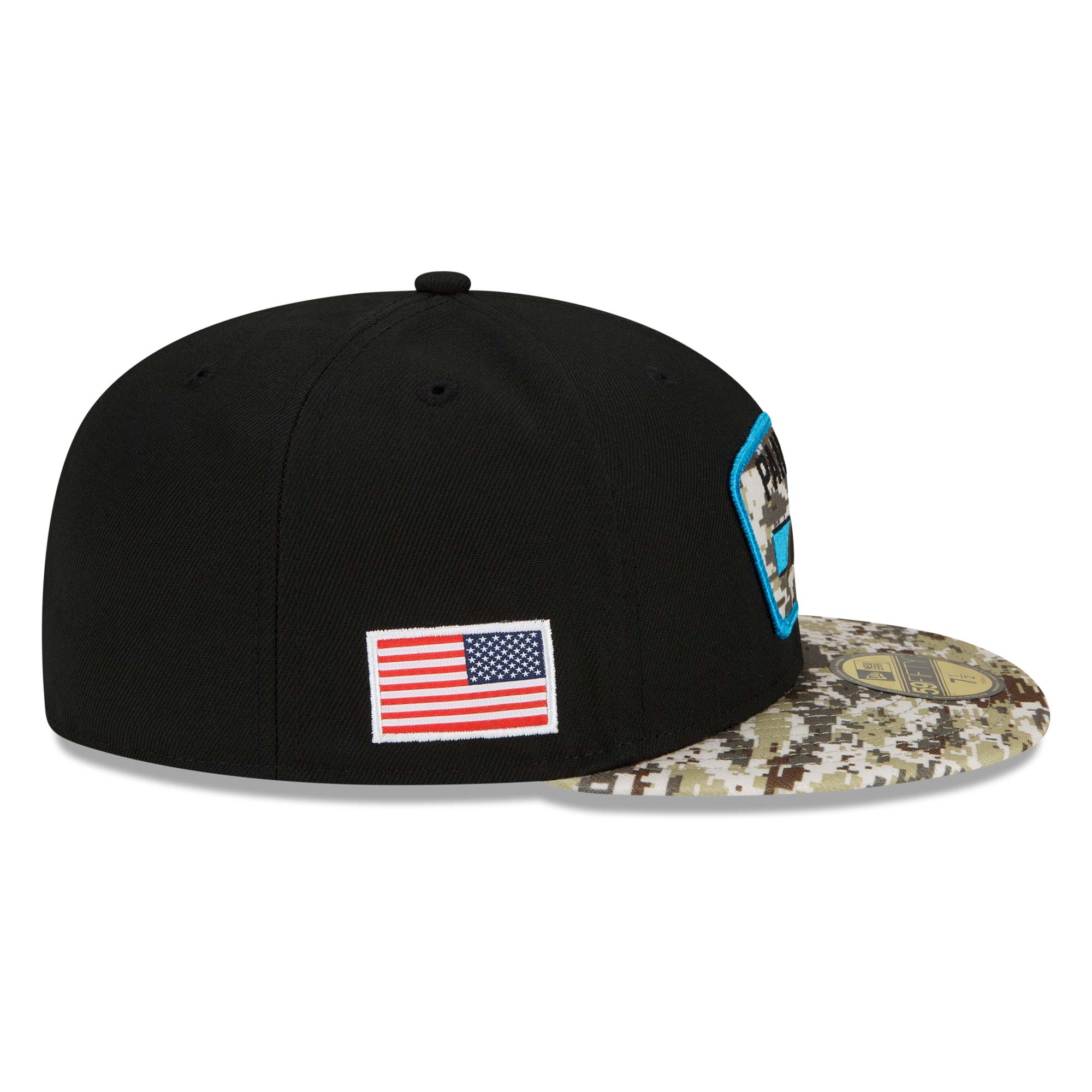 This 2021 NFL Salute to Service fitted hat is designed to support the American military branches. It features Carolina Panthers camo team patch on front and American state flag patch embroidered on right side. Rear decoration features NFL Salute to Service ribbon. Additional details include a digital camo visor.