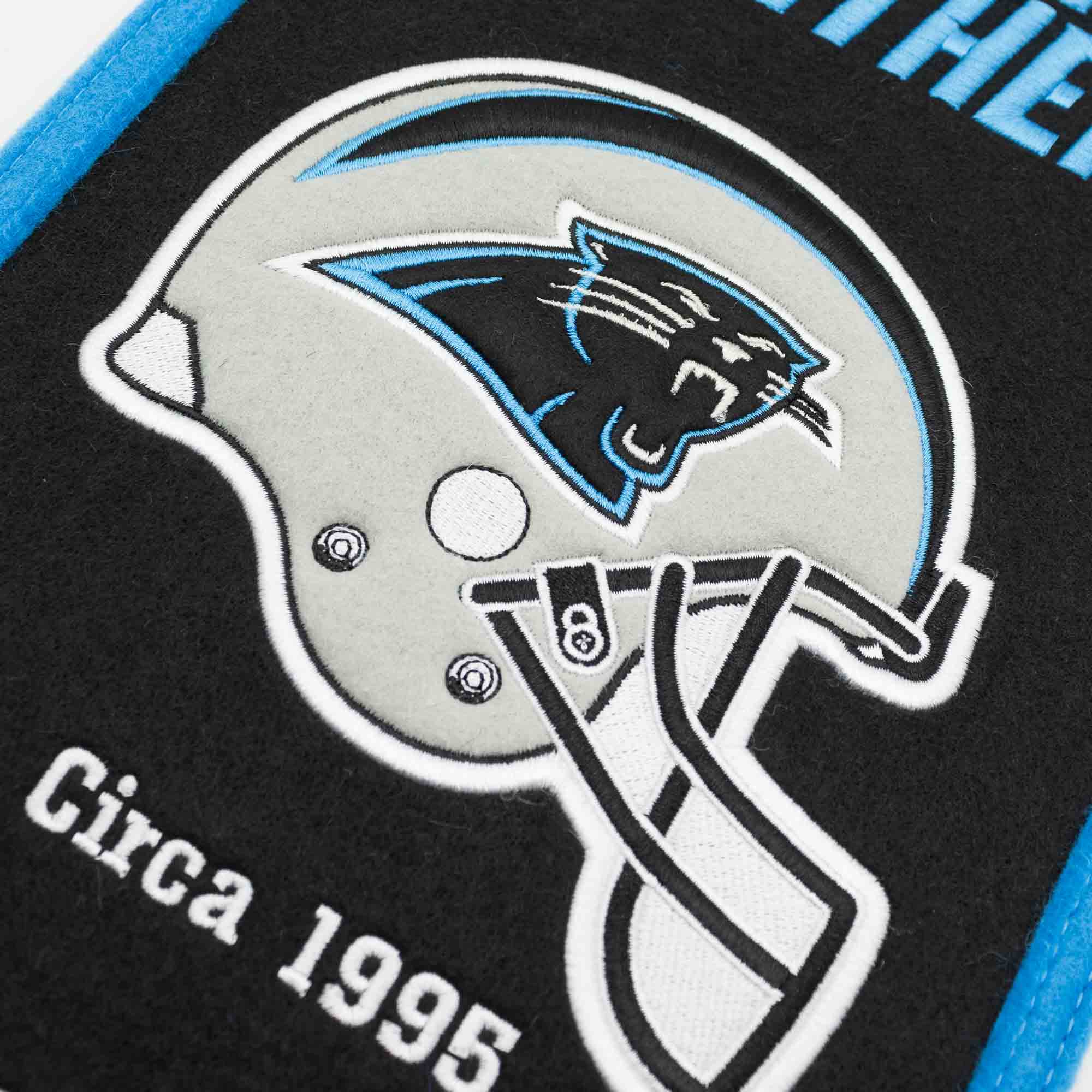 Genuine wool felt. Constructed with high-quality embroidery and applique detail. The banner depicts the evolution of the Carolina Panthers' logo. Team name on top.