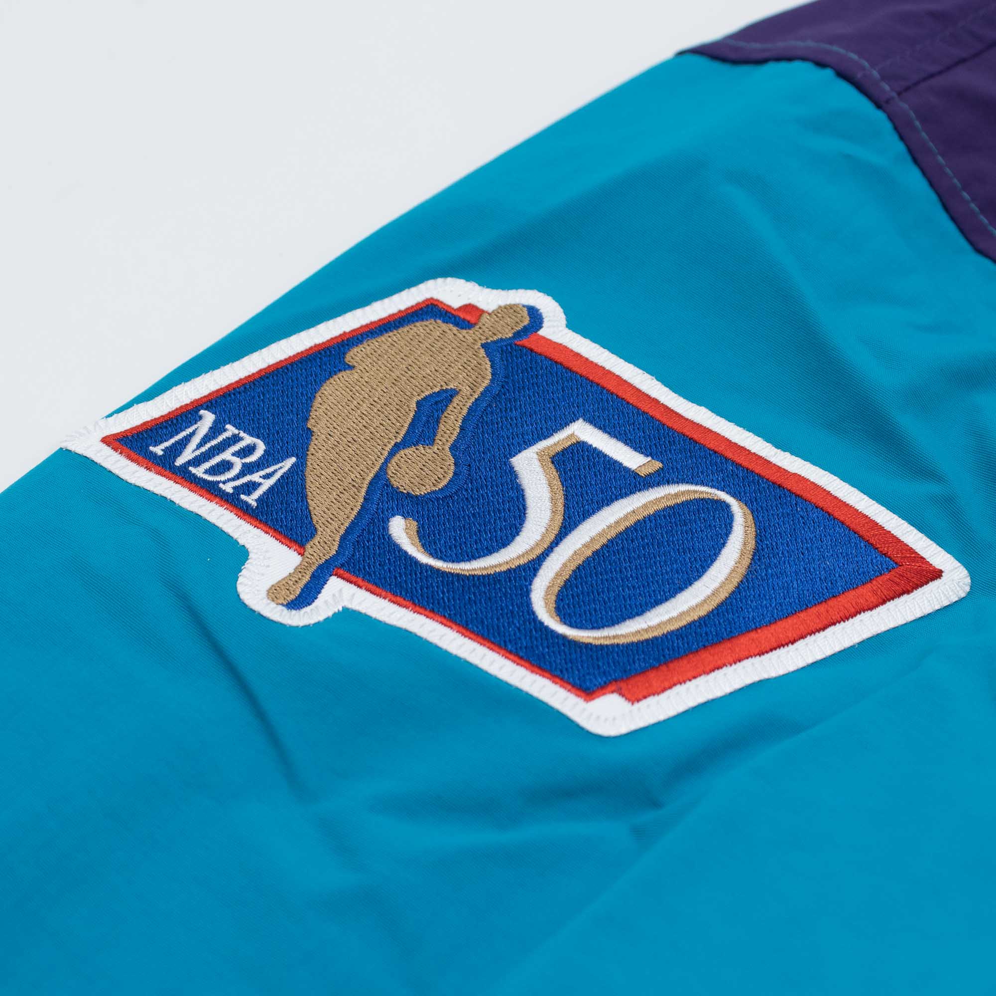 The basketball jacket features mesh lining to keep you cool and feeling fresh. An embroidered NBA league logo is found on the upper right chest, while the team name and year ID tag is sewn into the back waistband. Large Charlotte Hornets retro team graphics embroidered on back. Charlotte wordmark on left sleeve and 50th Anniversary NBA logo on right sleeve. Other features include 1×1 rib trim on the collar, sleeves and waistband, side pockets, as well as a center snap closure. Mitchell & Ness lettering embroidered on right cuff. This jacket is tailored fit, meaning it fits slimmer in the body.