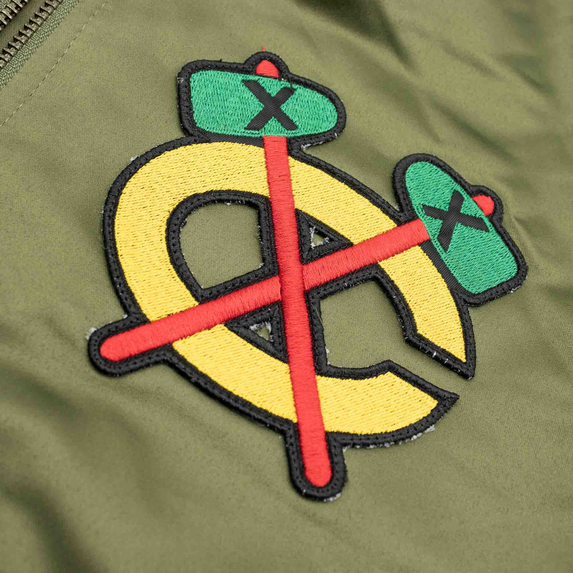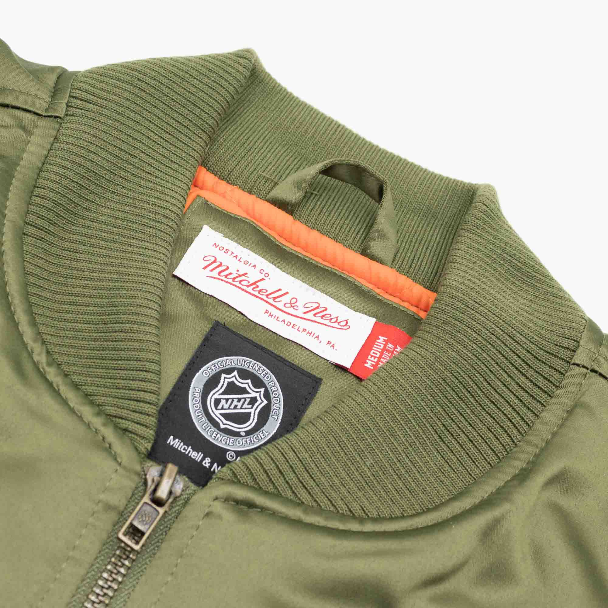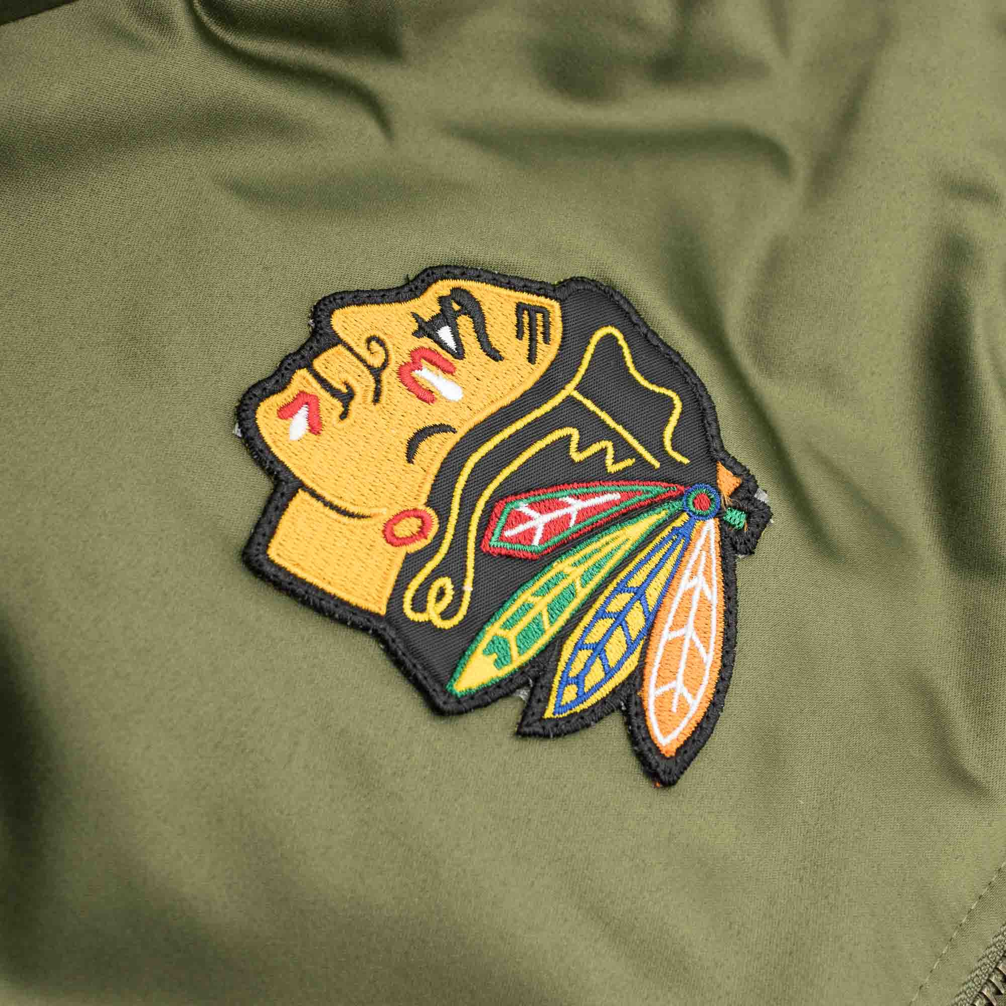 This heavyweight NHL satin jacket features an olive green outer shell combined with classic orange lining. Chicago Blackhawks team logo and alternate team logo embroidery on front. Mitchell & Ness logo embroidered on right sleeve cuff. Left sleeve features conference logo embroidery, right sleeve features Chicago Blackhawks team emblem. With large team wordmark embroidery on back.