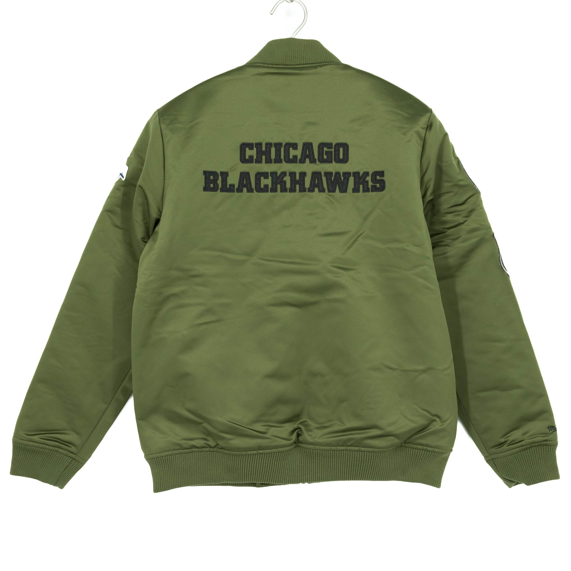 Mitchell & Ness NHL Men's Olive Varsity Satin Jacket from your Chicago Blackhawks.