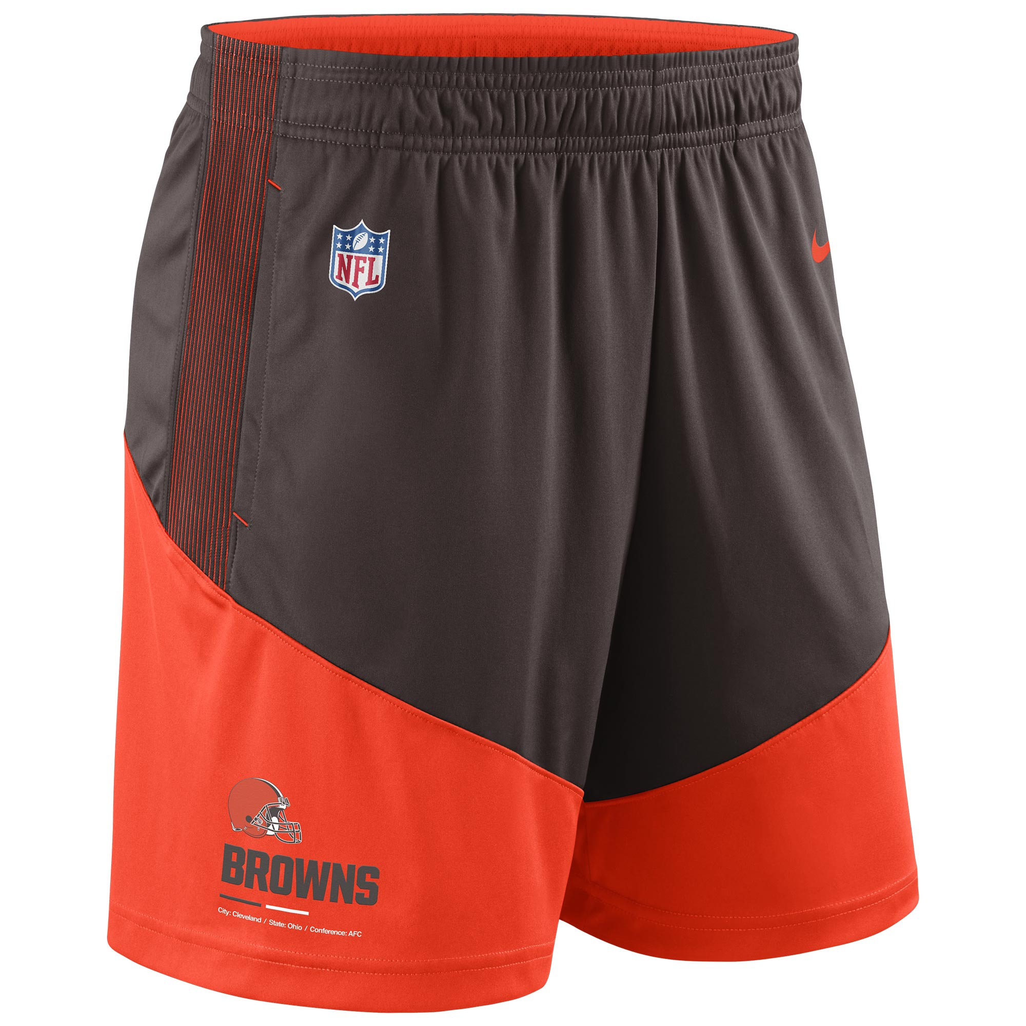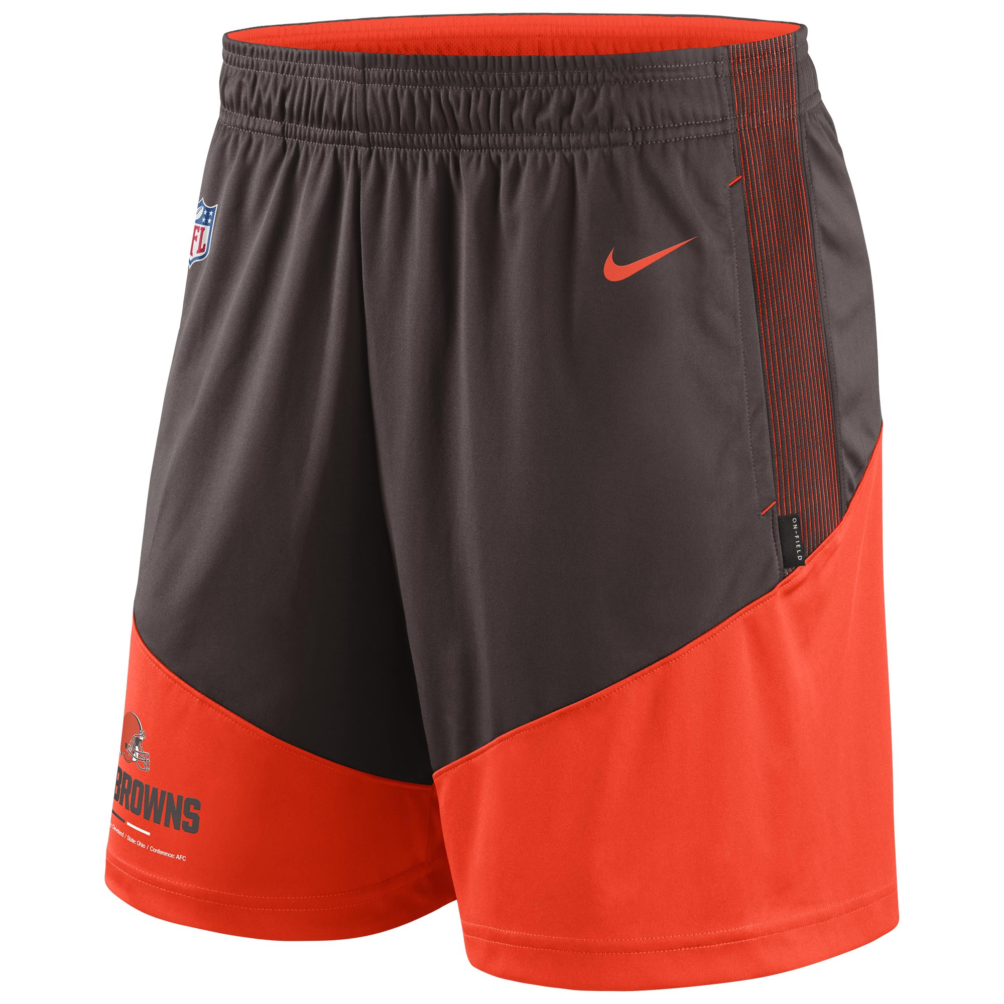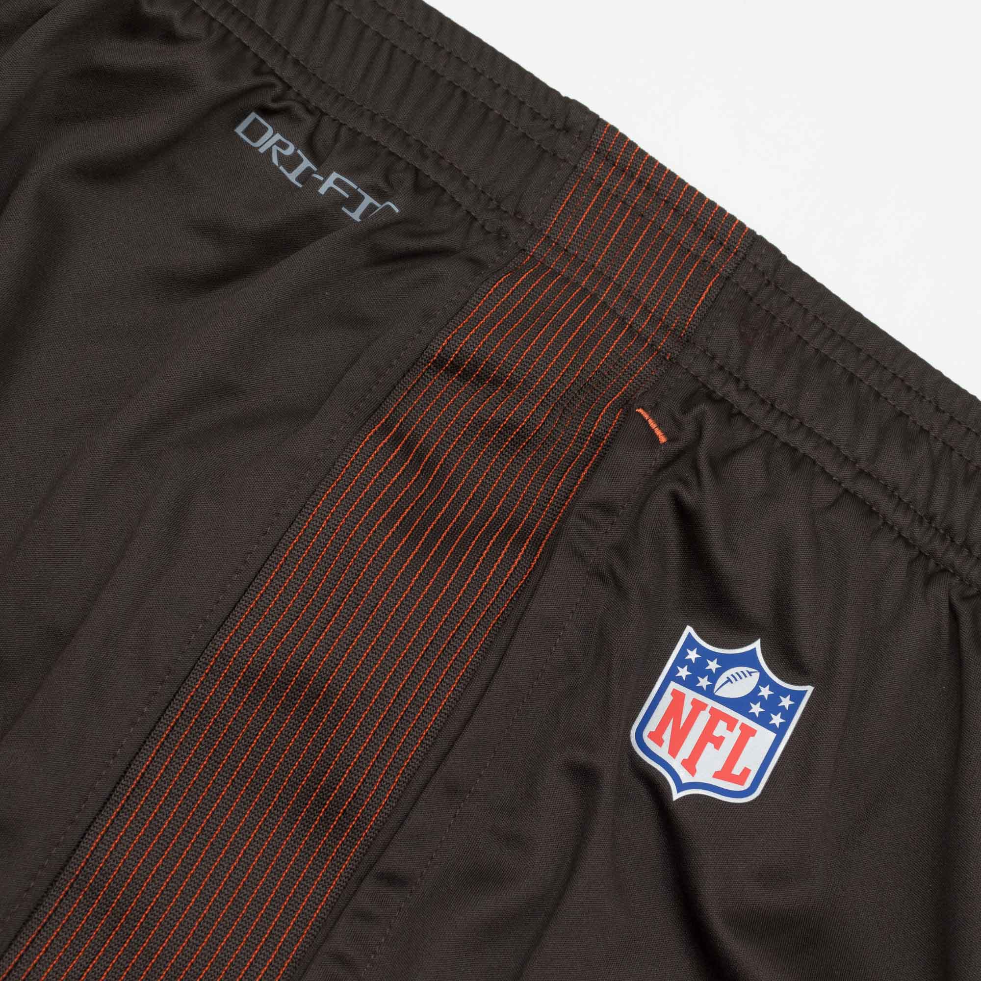 These 2022 Nike Sideline shorts are engineered to accommodate the needs of NFL players and coaches during Training Camp and On-Field work. With two side seam pockets to keep your stuff in place. Screen-printed Cleveland Browns team logo and wordmark including conference tag. Also featured are the official NFL Sideline Shield and the legendary Nike Swoosh. These NFL Men's shorts make use of the newest Nike Dri-FIT performance polyester fabric to help stay dry and comfortable no matter how hard you train.