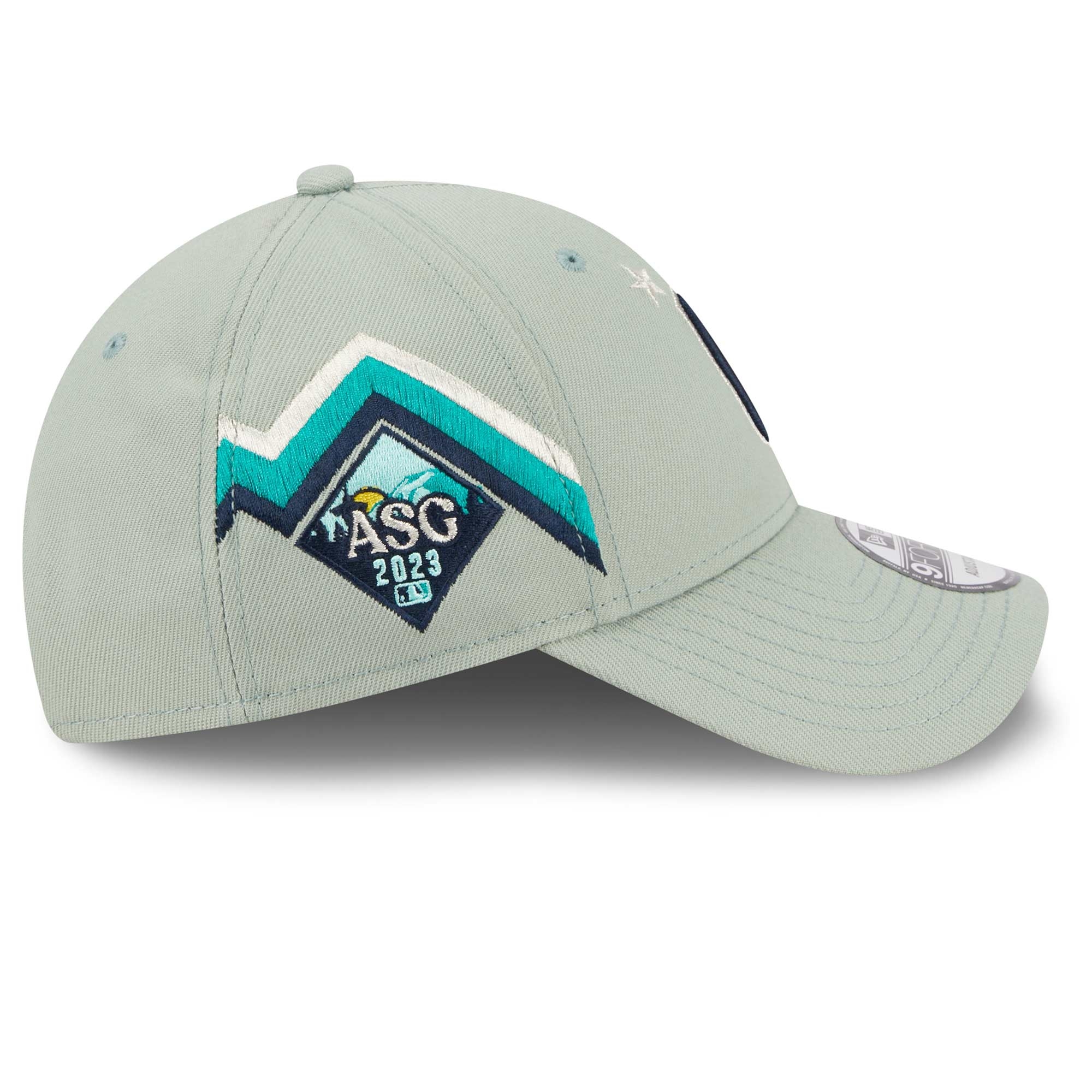 The mint green 2023 MLB All-Star Game Adjustable Cap celebrates Seattle with its special color scheme and provides unique team support. The front of the cap is decorated with a two-tone Cleveland Guardians team logo in a silver-blue look. The right side of the cap is embroidered with the 2023 ASG logo and dynamic stripes. The underside of the visor is navy blue.