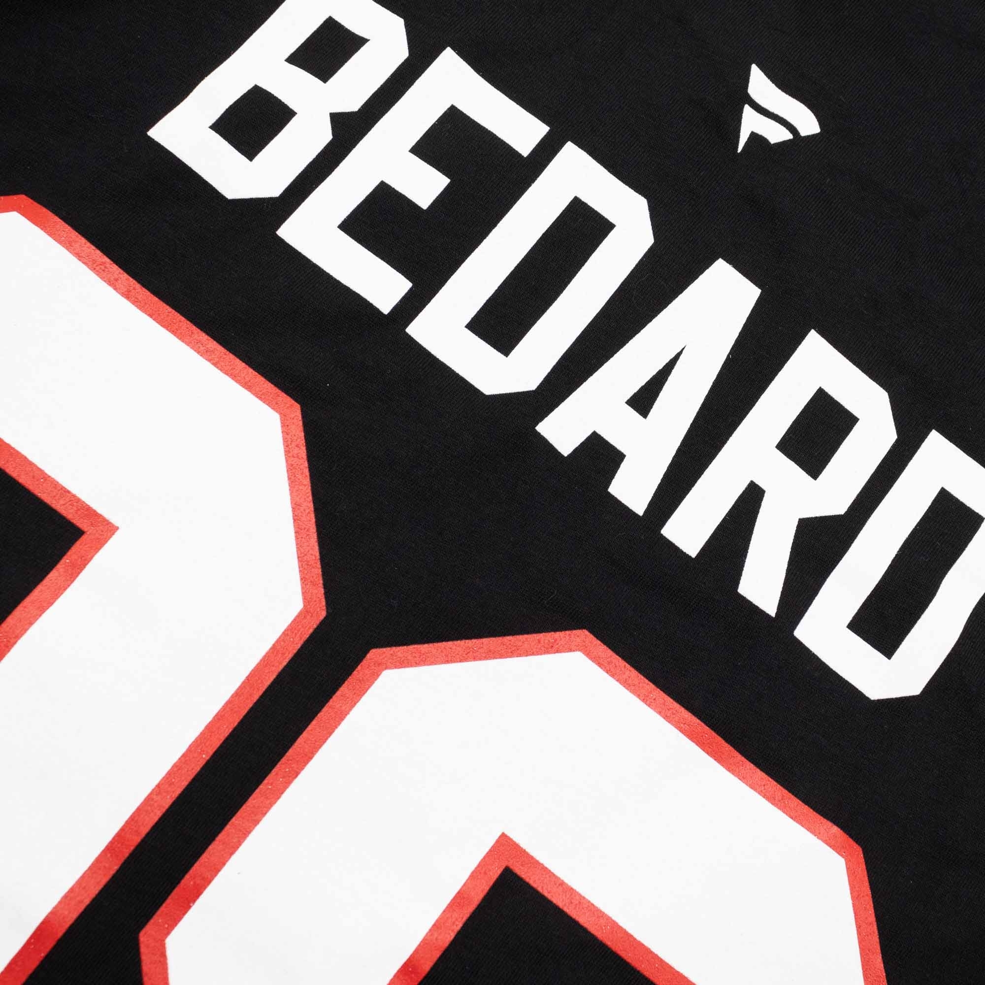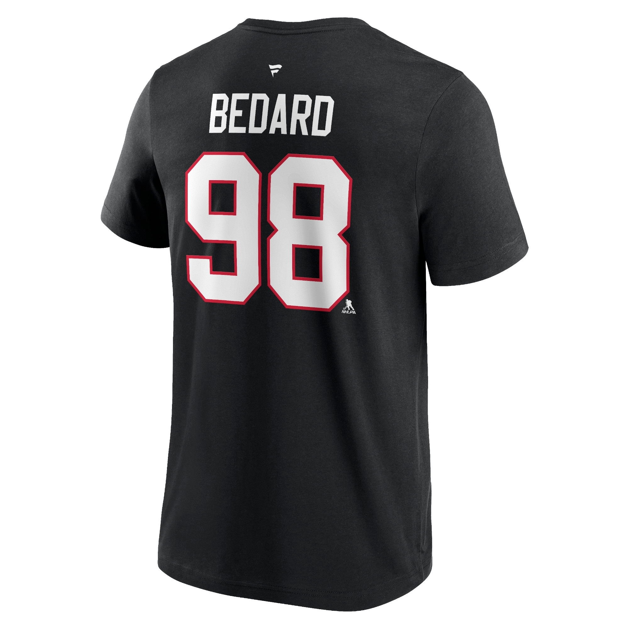 Support the Chicago Blackhawks with this stylish player T-shirt featuring the name and number of your favorite player, Connor Bedard! This T-shirt is the perfect fashionable and affordable alternative to the official NHL jersey. The player's number is displayed on both the front and back, with Connor Bedard's name printed on the back.
