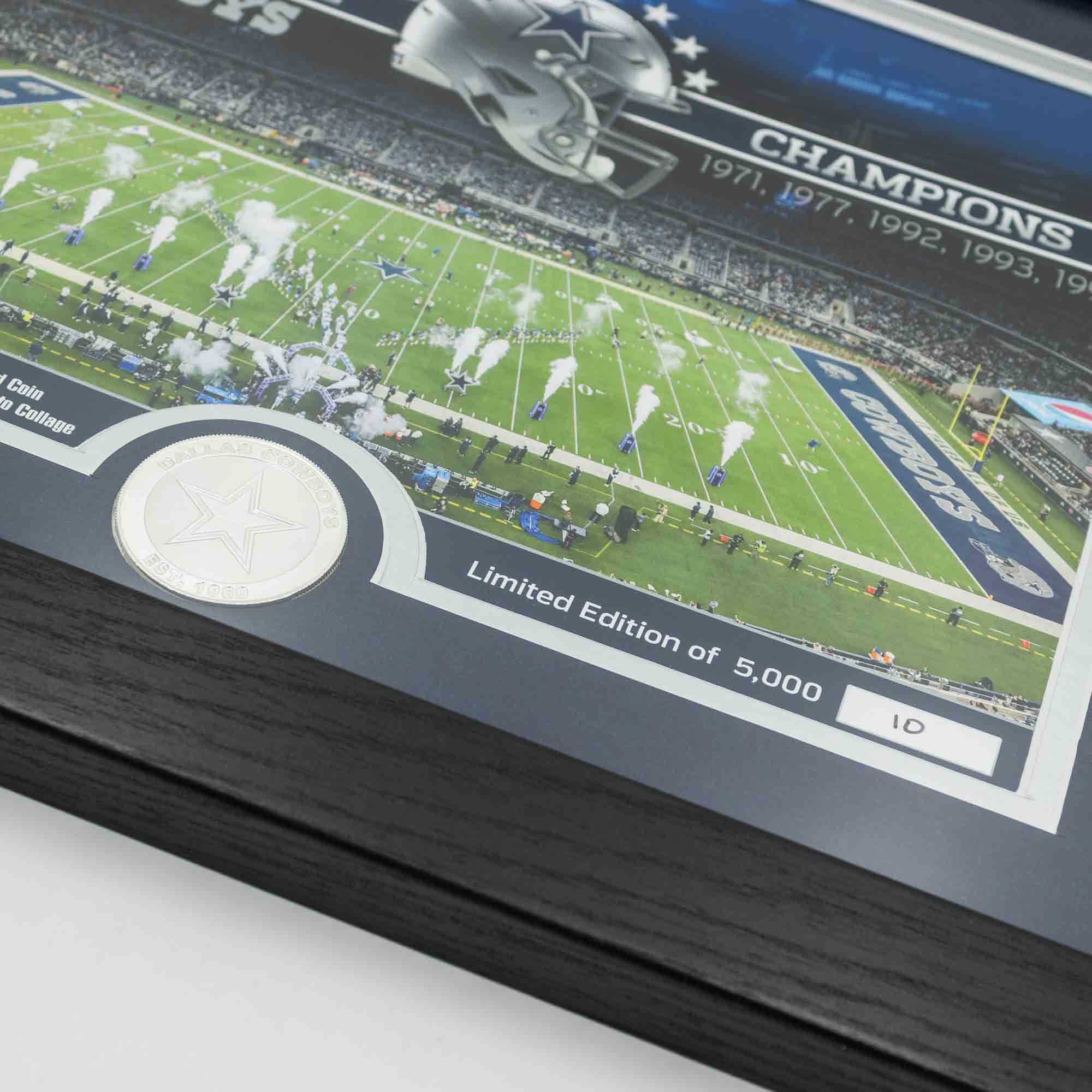 This limited edition collectible frame commemorates the Dallas Cowboys and their football arena! This 13" x 16" wood frame with double matting and a glass front panel features a hand numbered photo of the Dallas Cowboys stadium featuring team helmet and team wordmark. The uniquely arranged photo is combined with a 39mm minted solid bronze team coin.