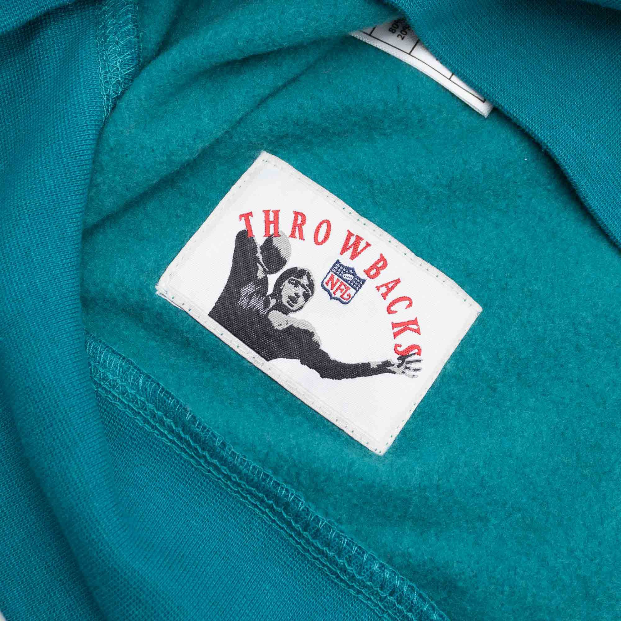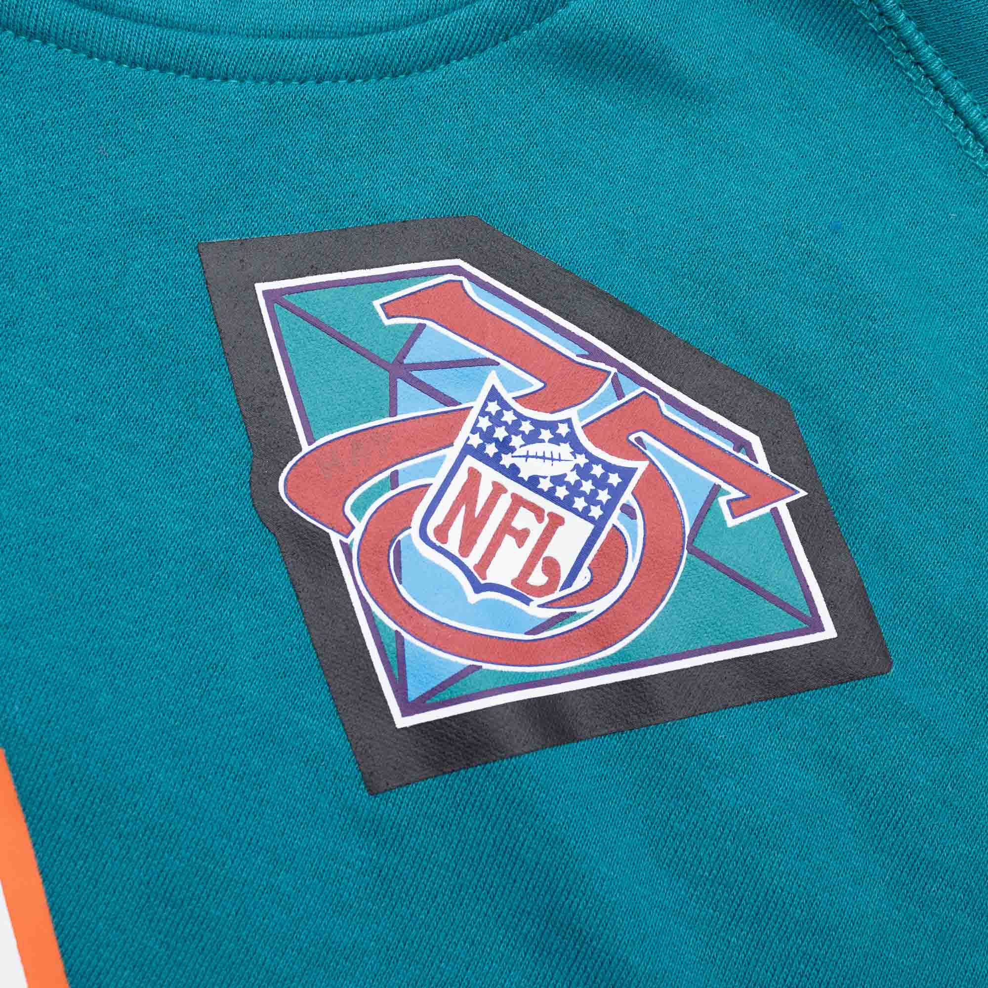 Premium NFL hooded pull-over long sleeve sweatshirt. Screen-printed Miami Dolphins, NFL 75th Anniversary Logo and player number on front, player name and number on back. Mitchell & Ness script embroidery on right cuff. With hood, drawcord strings and front pocket.
