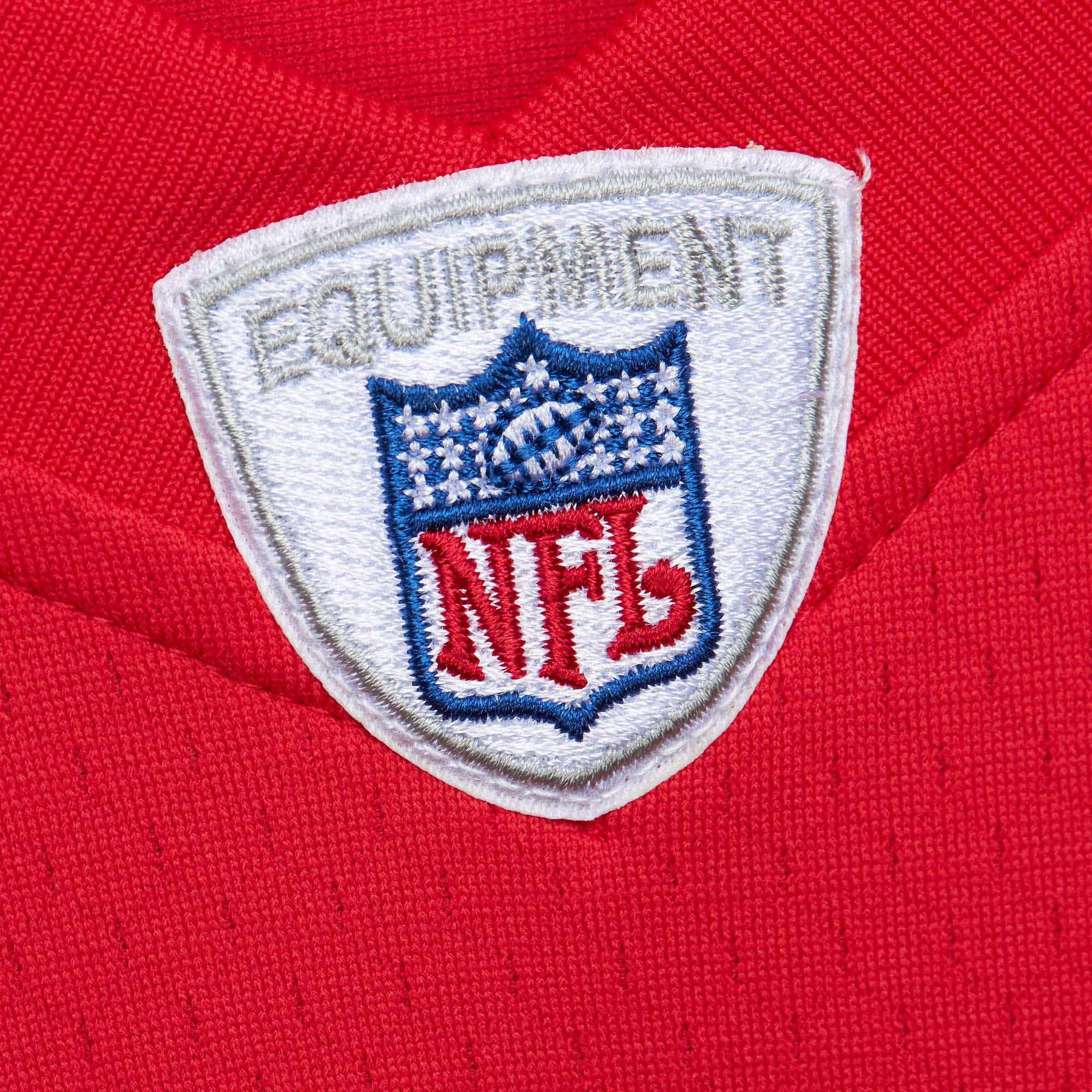 All numbers and letters are meticulously stitched, reflecting the official NFL design of the 2002 Kansas City Chiefs jerseys. The NFL Shield at the collar and the Mitchell & Ness label (Legacy Collection) at the hem underscore the authenticity of this throwback piece.
