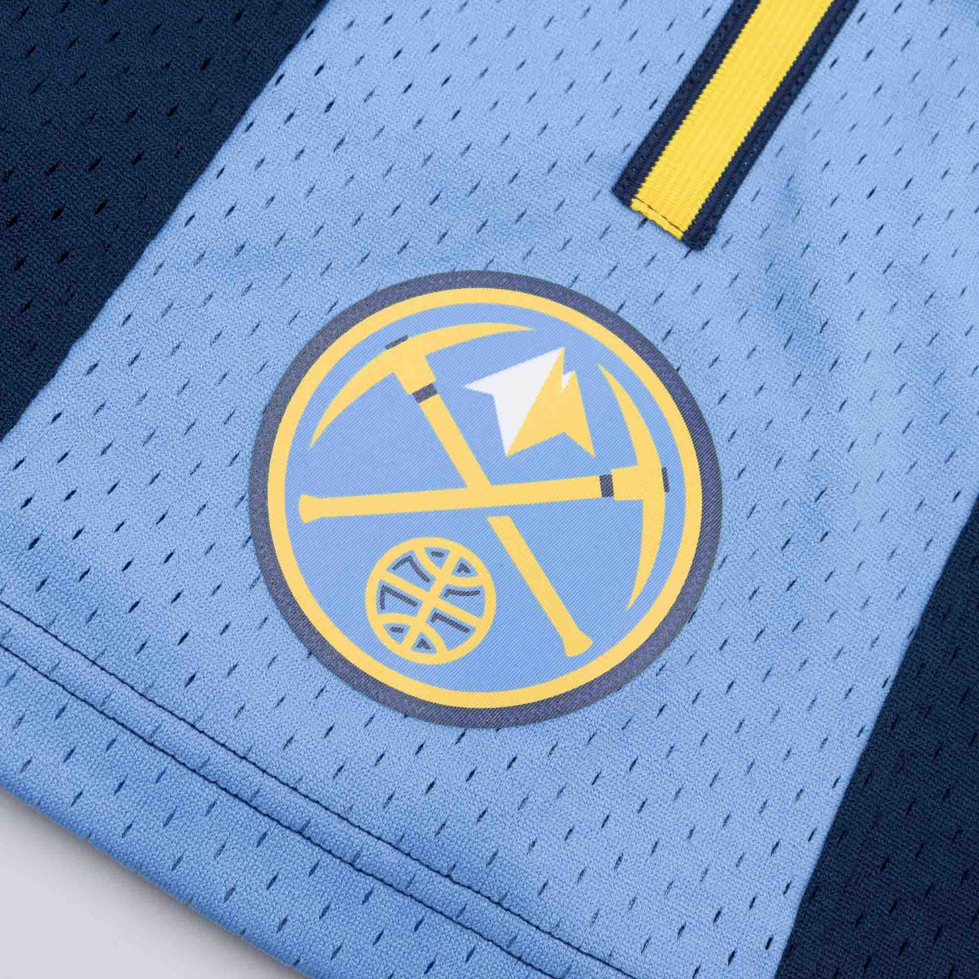 Celebrate the golden era of hoop uniforms with the Mitchell & Ness Swingman shorts. These Denver Nuggets shorts feature 100% poly textured mesh, a knit rib waistband, heat seal screen printed twill logos, cotton drawstring and twill NBA logo.