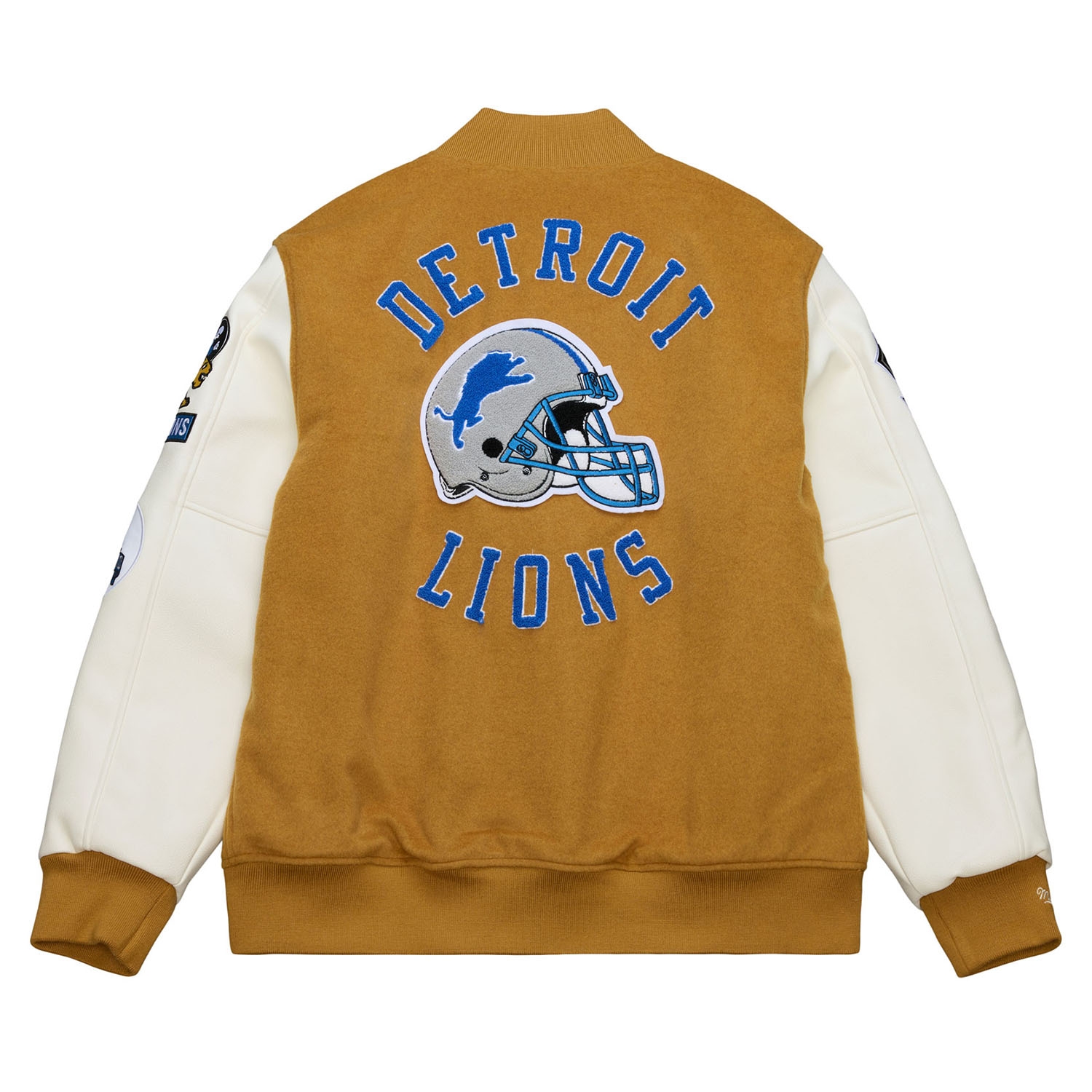 Show your passion for the Detroit Lions with this premium Mitchell & Ness varsity jacket in the Vintage Dusted Design. This piece blends classic college-jacket styling with iconic NFL graphics and a unique retro aesthetic, highlighted by the distinctive Dusted Ochre body color.