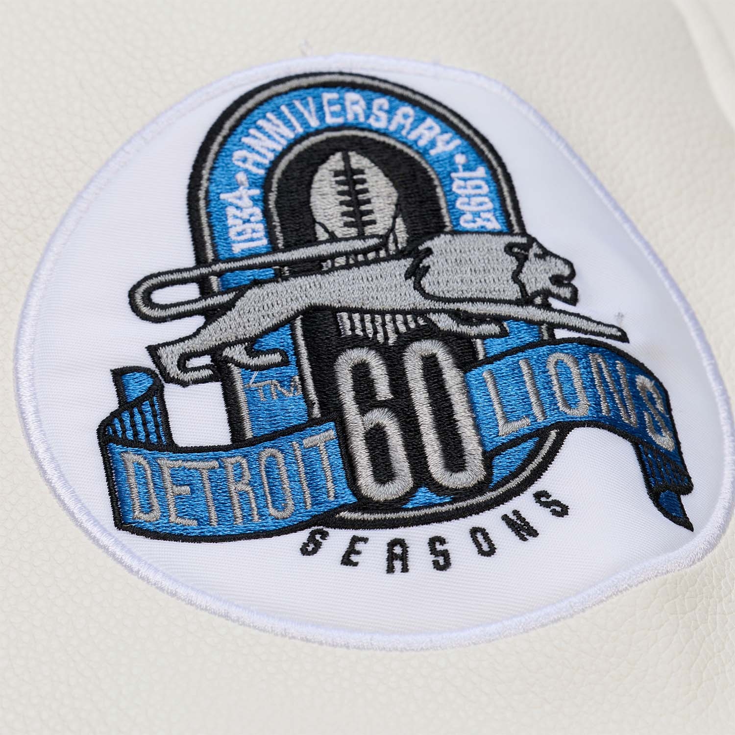 Mitchell & Ness NFL Men's Vintage Dusted Varsity American Football Jacket with faux leather sleeves and stiched team patches from your Detroit Lions.