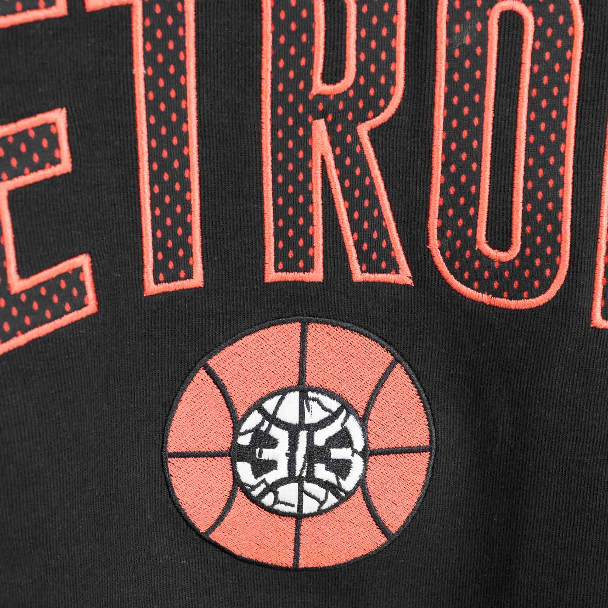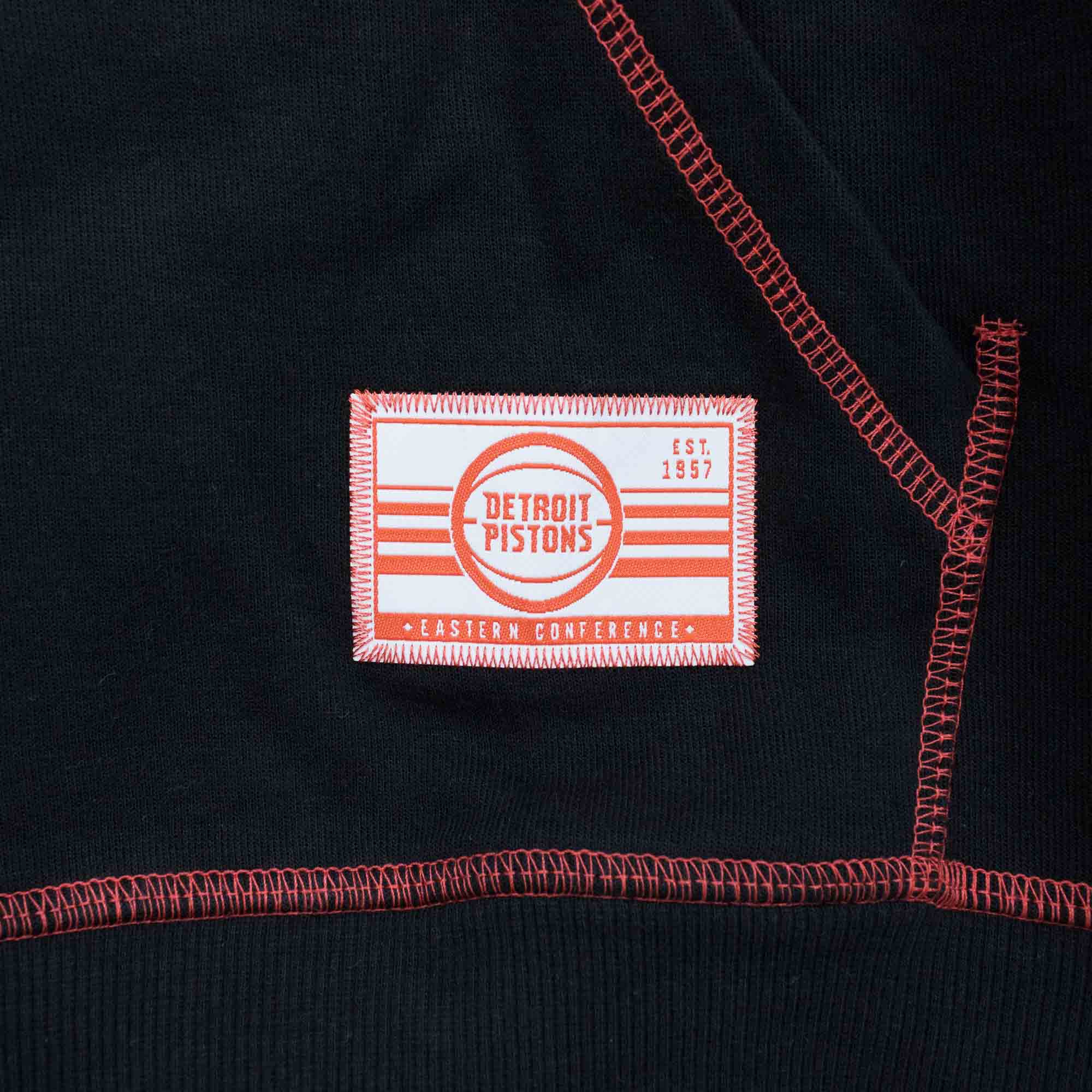 The Detroit Pistons 2023 City Edition Black Hoodie features a mesh applique Detroit wordmark and embroidered team logo at the chest with a team jock tag at the kangaroo pocket.