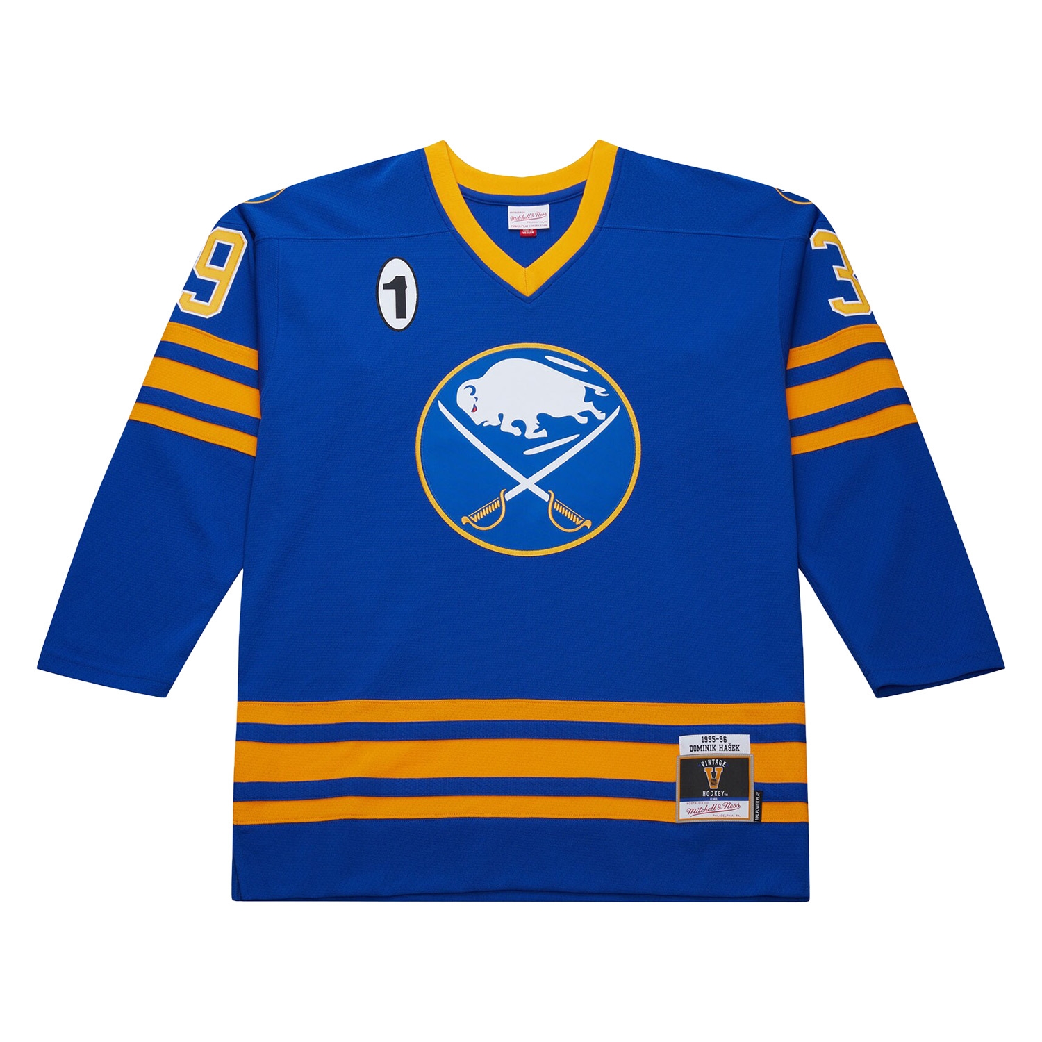 - Vintage Hockey: Official retro design from the 1995-96 season in traditional royal blue and gold with the iconic Sabres crest on the chest.