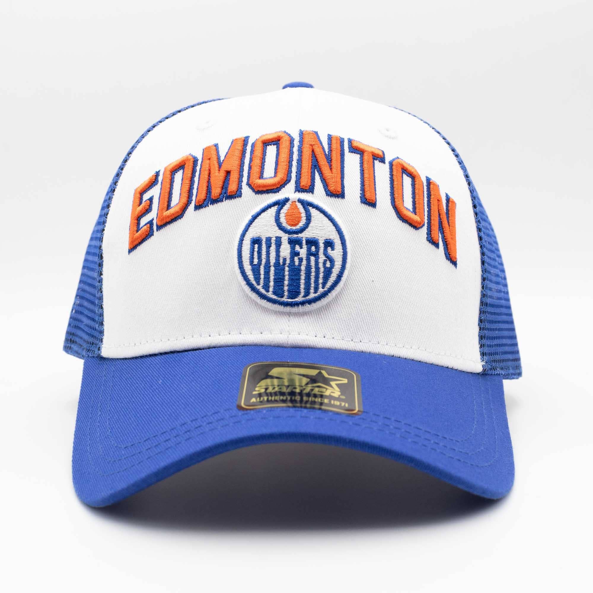Classic NHL Trucker hat with EDMONTON wordmark and Oilers team logo embroidery (raised) on front. White cotton front and team colored mesh-back and virsor. Starter wording on snap.