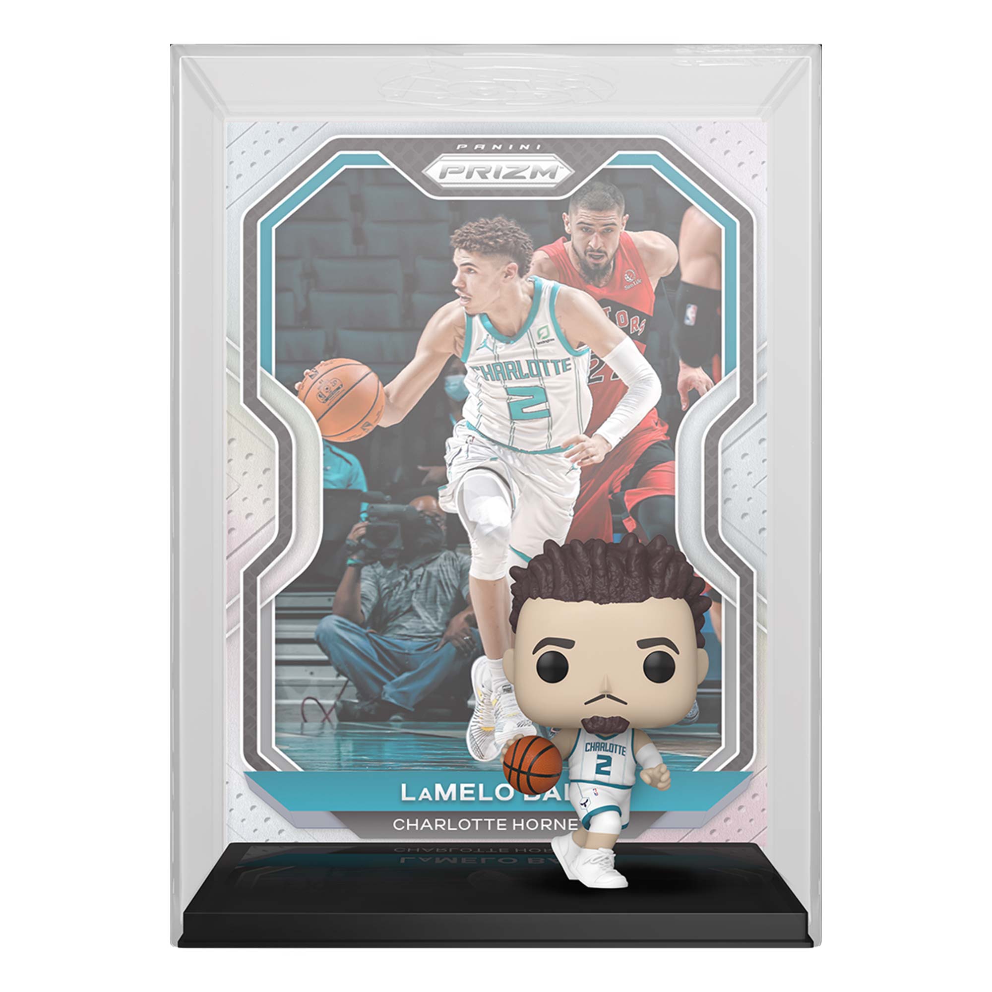 Commemorate an iconic sports trading card: Panini Prizm for your NBA collection with the Pop! figure of LaMelo Ball. The collectible features a Pop! LaMelo Ball figure, wearing his white Charlotte Hornets uniform, which matches the included trading card art, and comes pre-packaged in a protective case that can be hung on your wall! This Trading Card action figure is a perfect fit for any shelf, desk or NBA fan-cave.