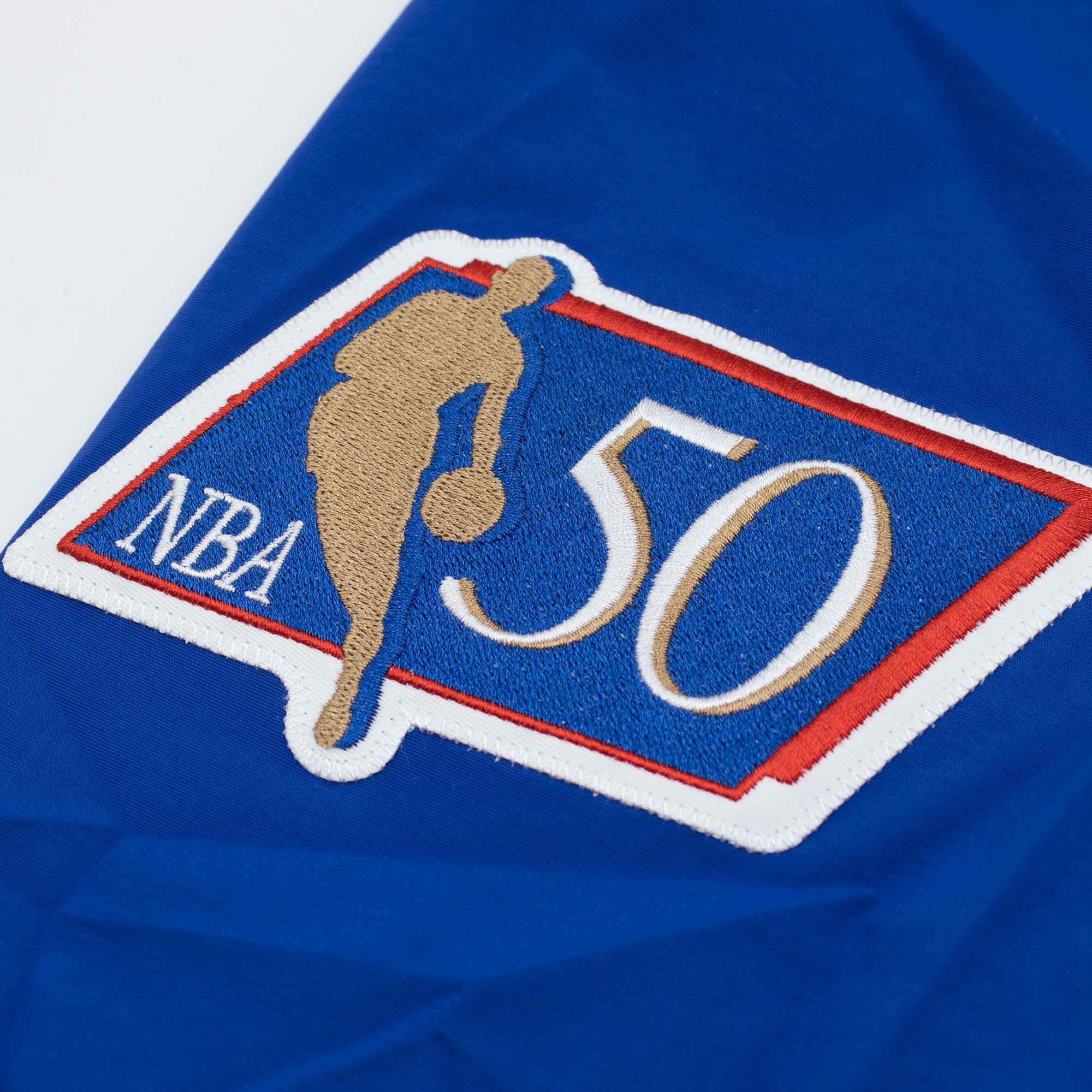 The basketball jacket features mesh lining to keep you cool and feeling fresh. An embroidered NBA league logo is found on the upper right chest, while the team name and year ID tag is sewn into the back waistband. Large WARRIORS wordmark embroidered on front. Golden State Warriors team logo on left sleeve and 50th Anniversary NBA logo on right sleeve. Other features include 1×1 rib trim on the collar, sleeves and waistband, side pockets, as well as a center snap closure. Mitchell & Ness lettering embroidered on right cuff. This jacket is tailored fit, meaning it fits slimmer in the body.
