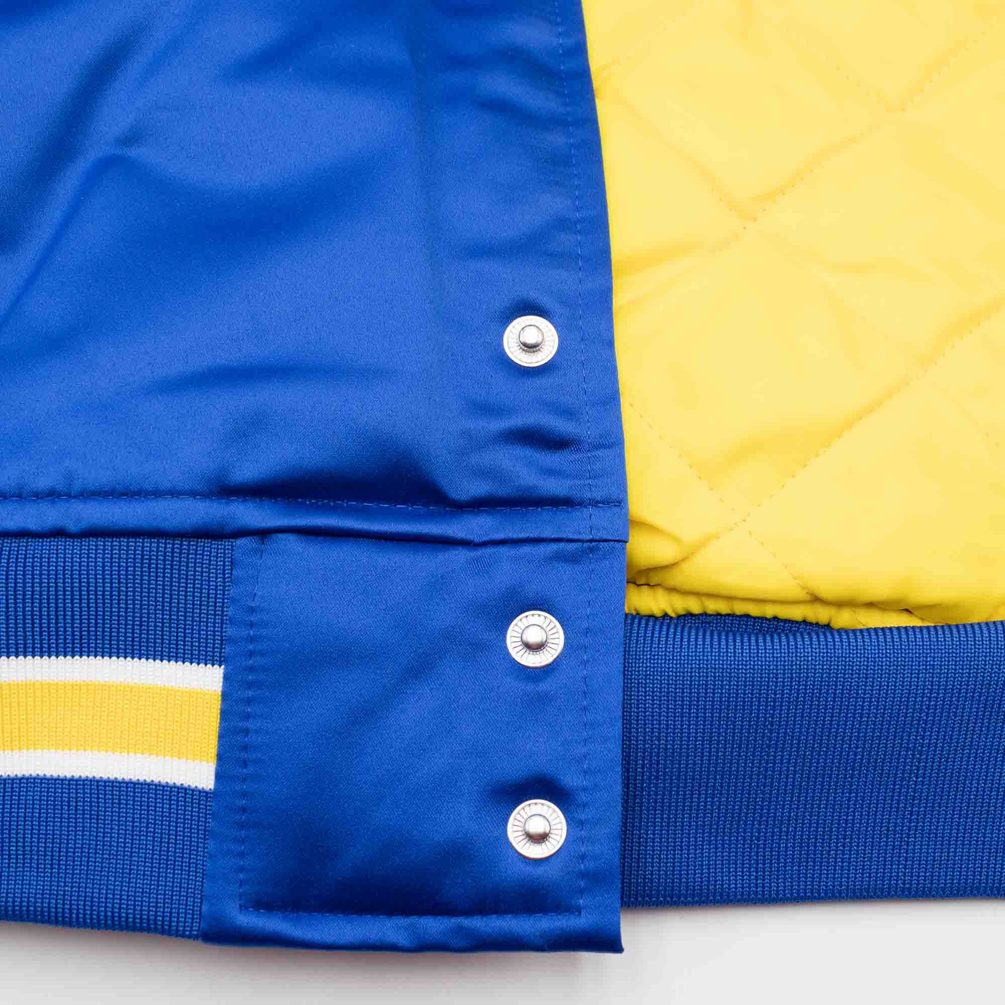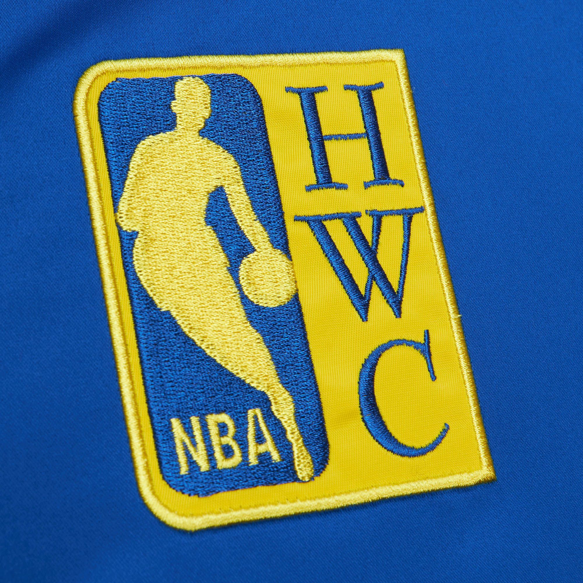 This heavyweight NBA satin jacket features Golden State Warriors classic team logo and NBA HWC logo embroidery on front. Mitchell & Ness logo embroidered on right sleeve cuff. Contrast color self-fabric taping on sleeves.