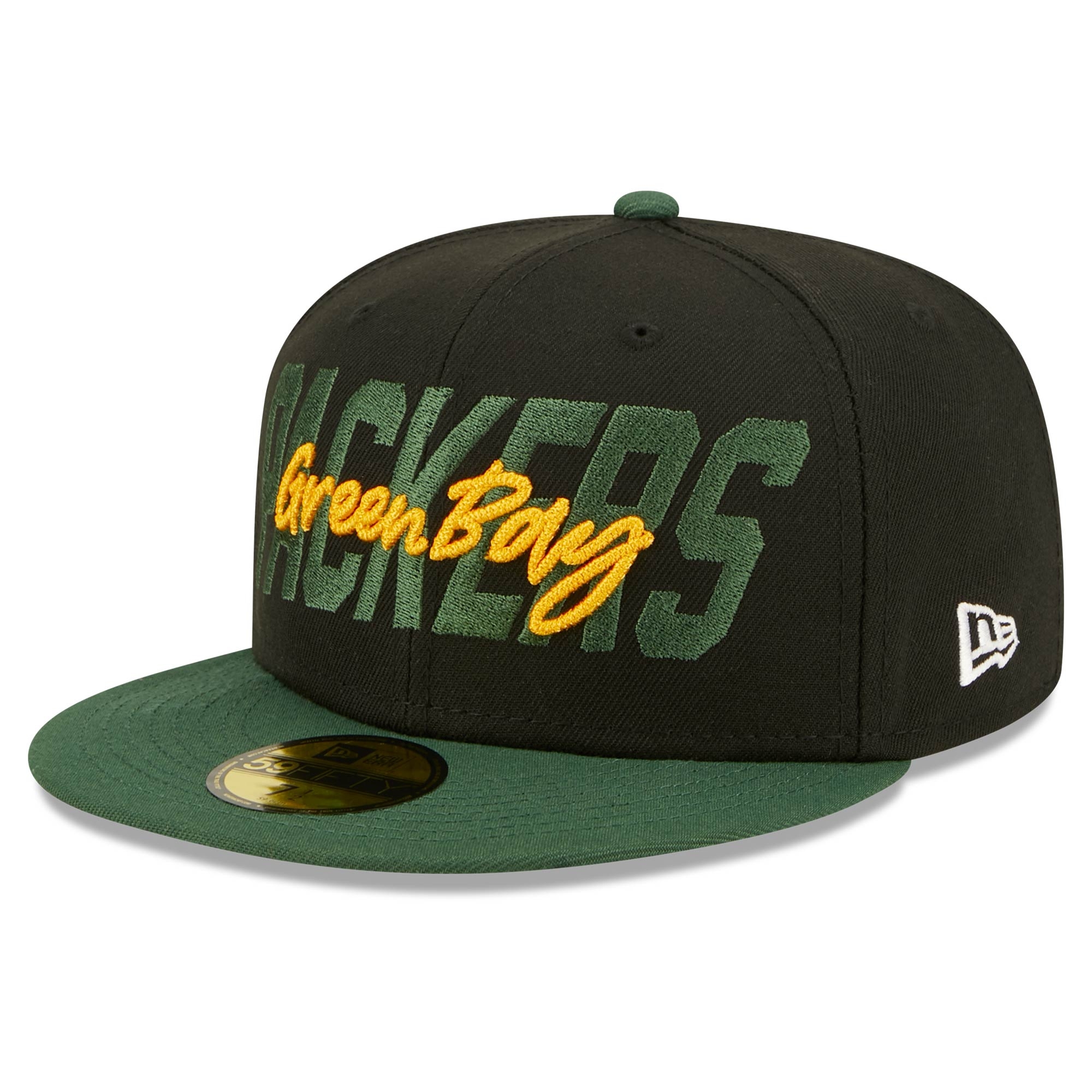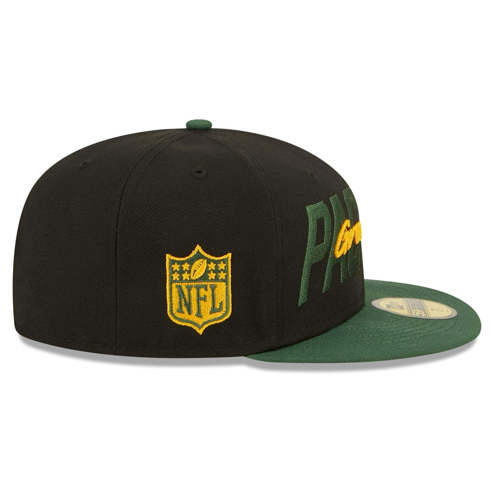 The 2022 NFL Draft Fitted Hat by New Era comes with a sporty team script on front and team colored NFL shield on right cap panel. Closed back features official Green Bay Packers team logo.