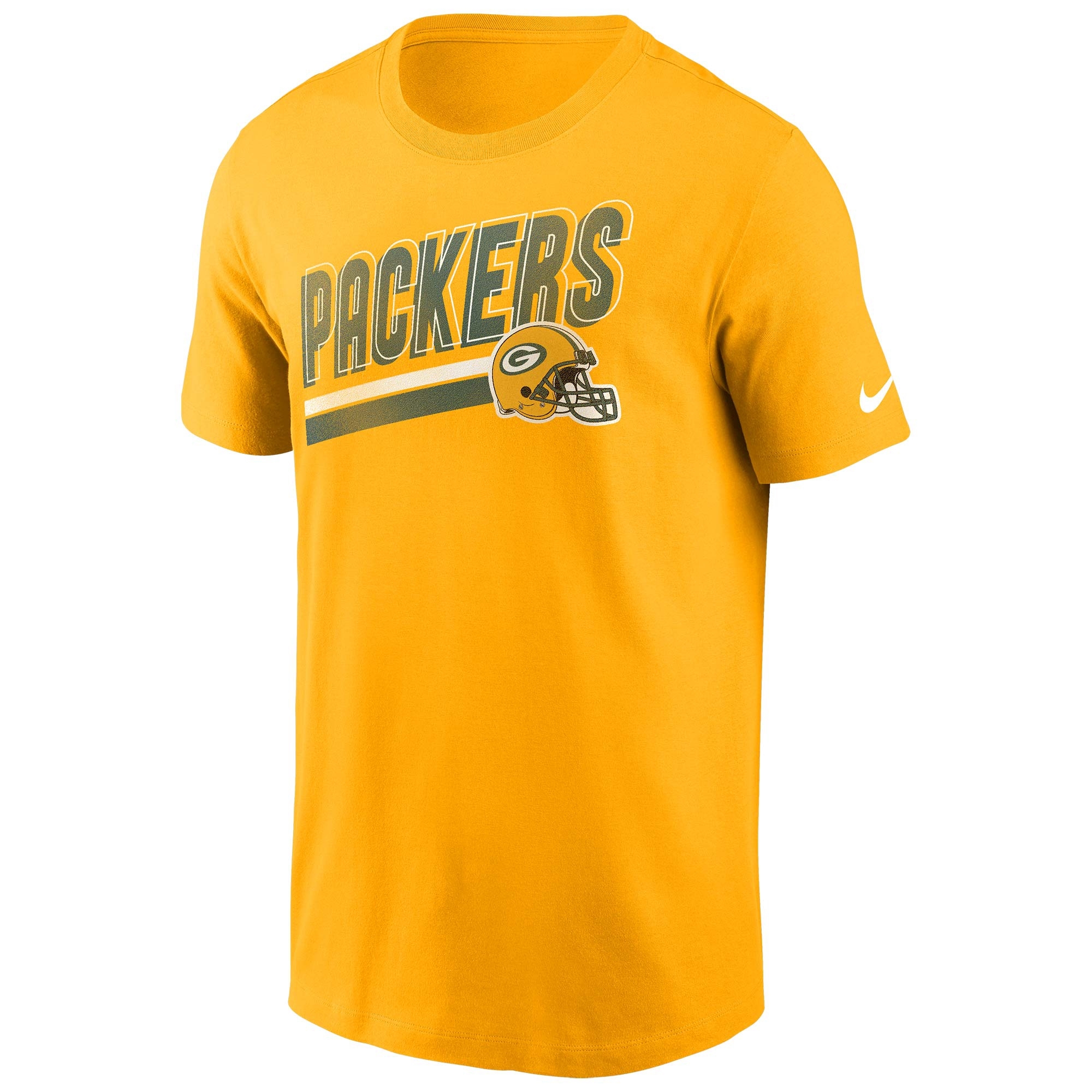 Suit up for NFL gamedays with this Nike Essential Cotton t-shirt. With Green Bay Packers team name and football helmet front decoration. Nike Swoosh on left sleeve.