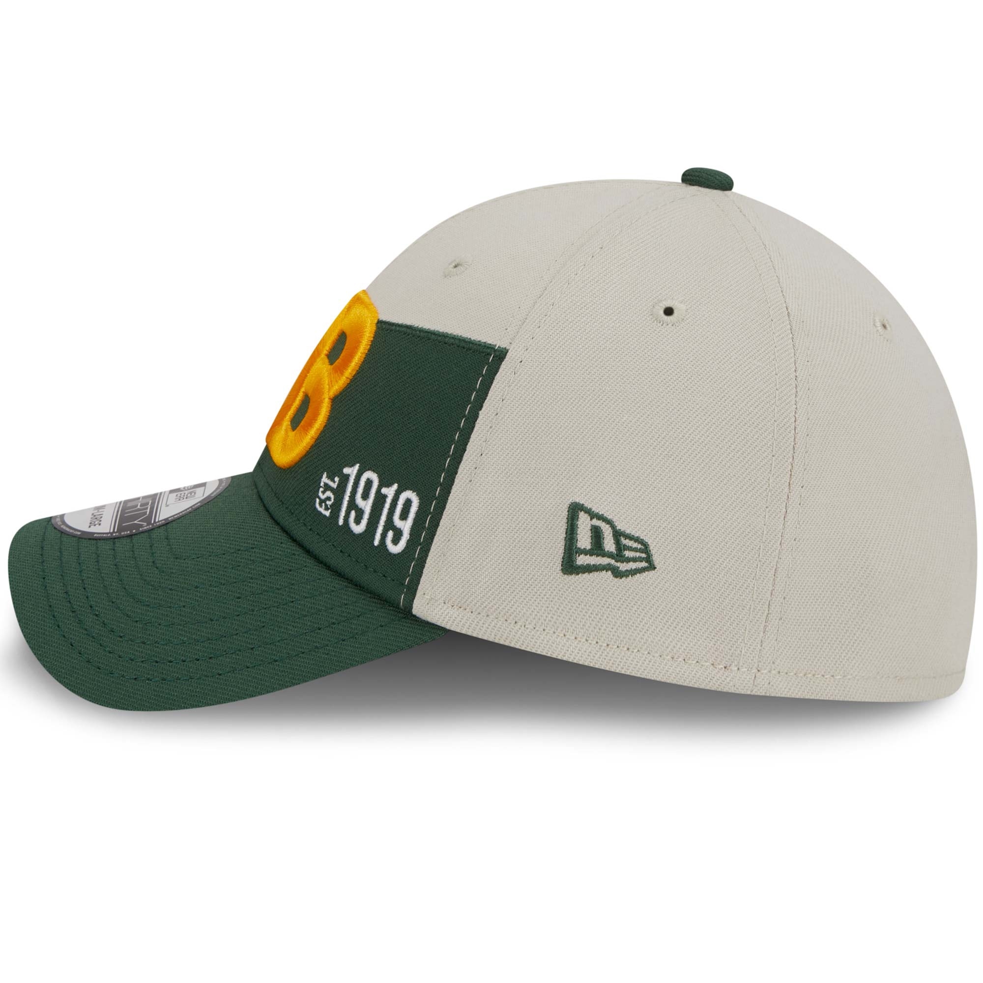 The 2023 NFL Sideline headwear collection offers a throwback look on modern NFL Gamedays! This two-tone Green Bay Packers cap impresses any live long football fan with the combination of classic team colors combined with a gray base color. The cap's front features the retro team logo and the establishment date. Closed back features official NFL shield embroidery. The underside of the brim is gray, and the sweatband is black.