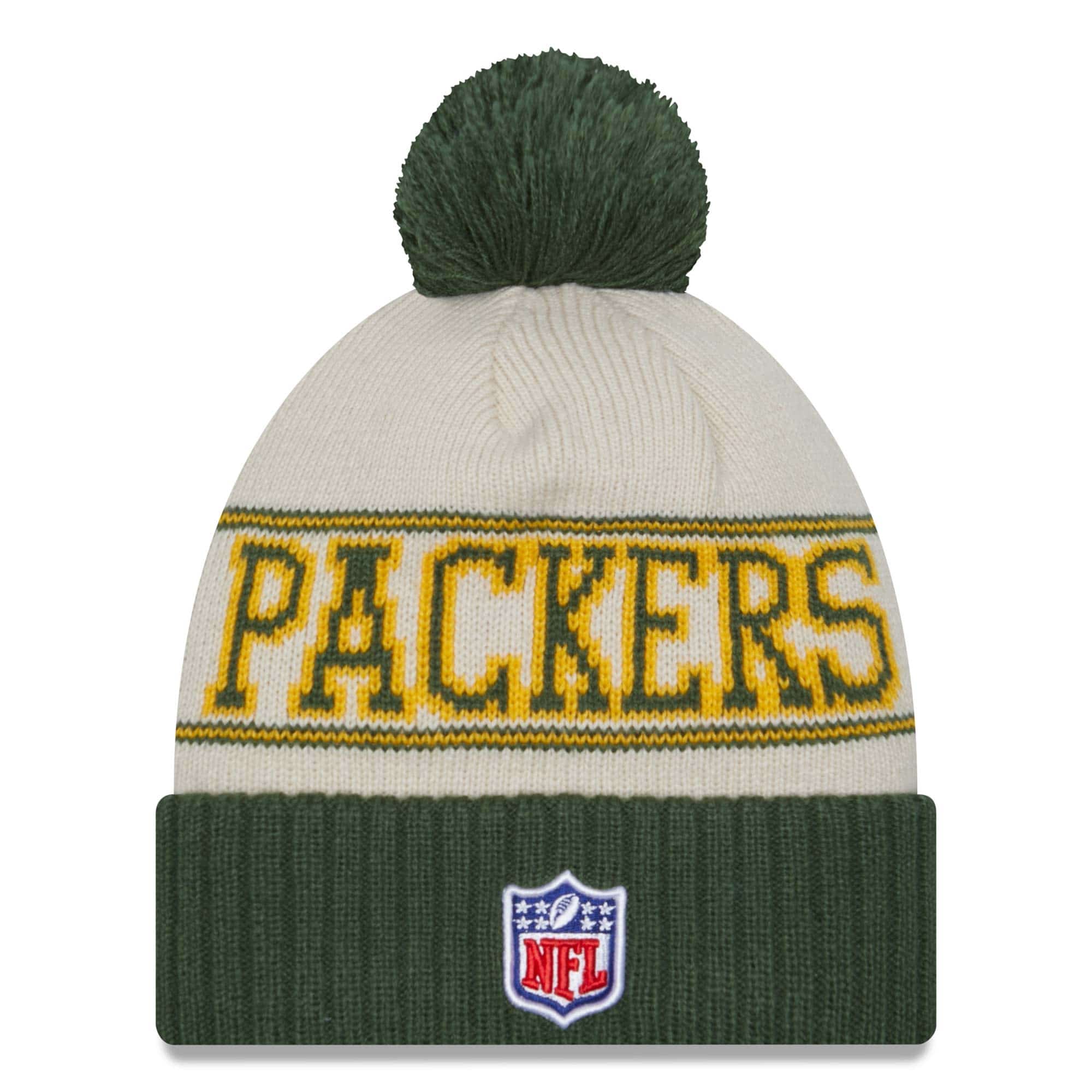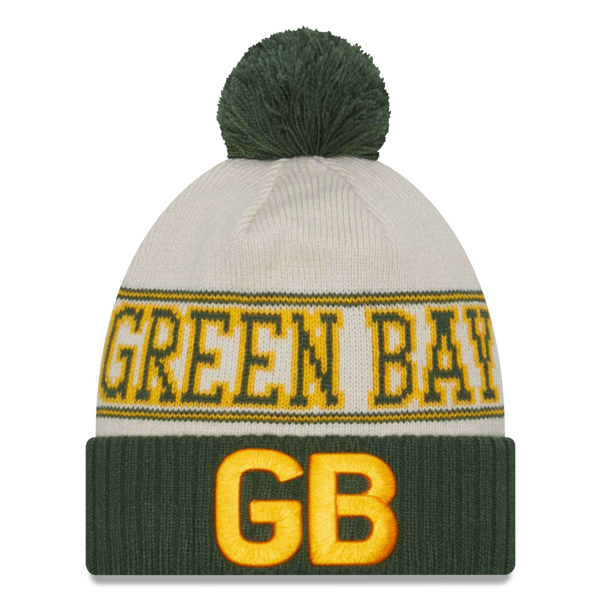 New Era American Football Historic Throwback Knit Hat with Pom from your Green Bay Packers. Part of the official 2023 NFL Sideline Collection.