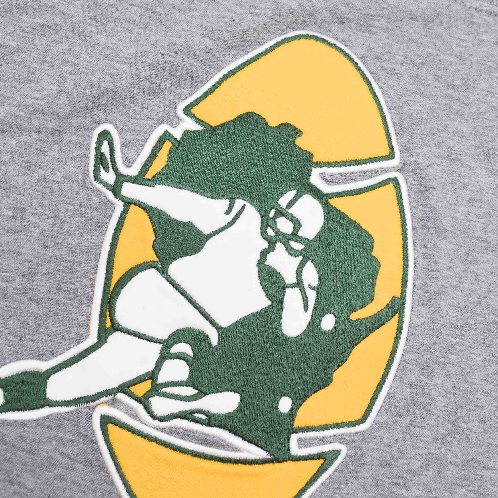 This throwback NFL t-shirt features classic embroidered Green Bay Packers team logo patch on front. Mitchell & Ness Conference patch at lower left hem. Premium soft cotton fabric. Color blocked sleeves.
