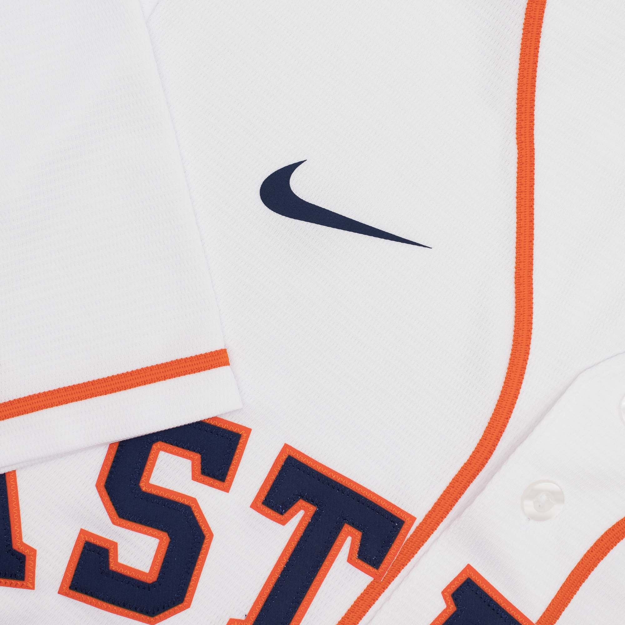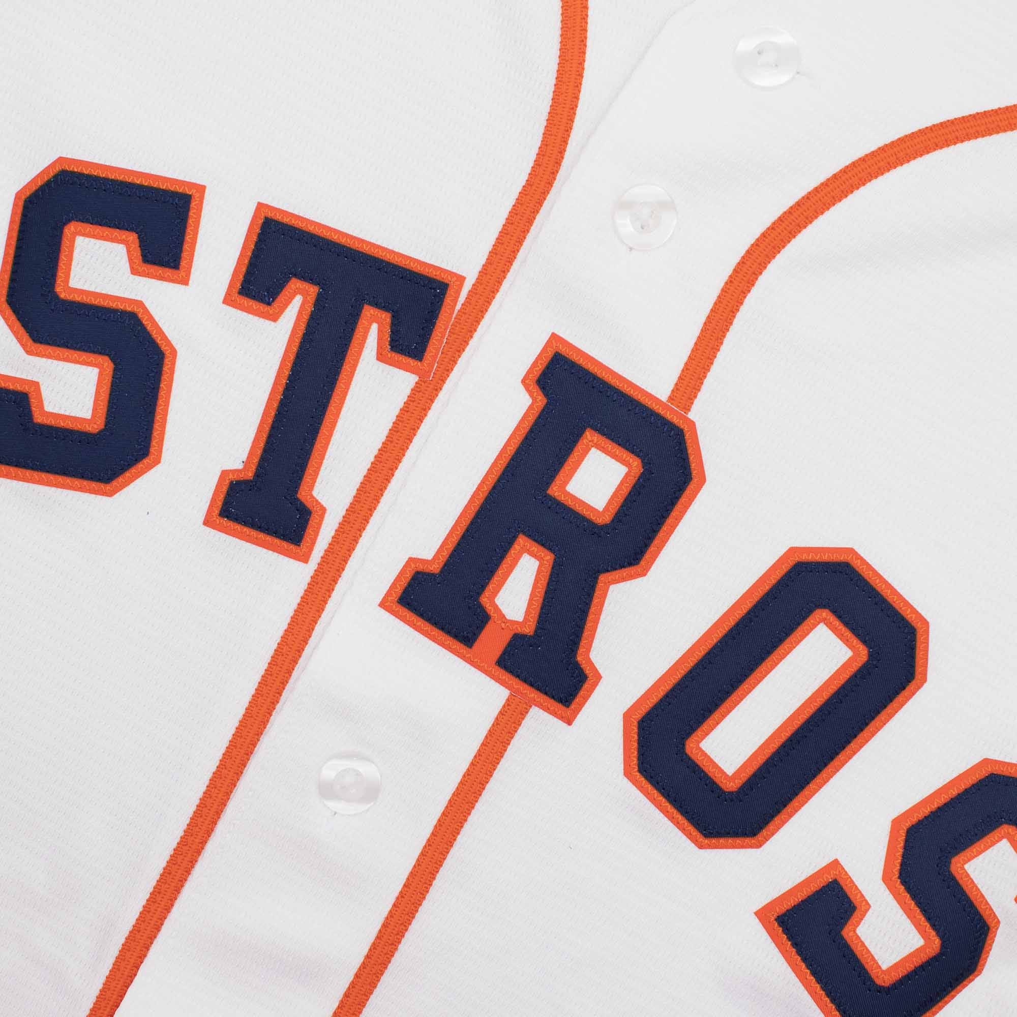 This Nike MLB jersey features lightweight fabric and breathable button front with Houston Astros color and styling which replicates the on-field jerseys worn by MLB players. A printed tackle twill decoration across the full or left chest makes the official team logo pop against the braid seams. This modern fit jersey also features a center back neck MLB silhouetted batter patch. A tagless neckline provides extra comfort. MLB Genuine Merchandise locker tag is located on the bottom left corner of the front.