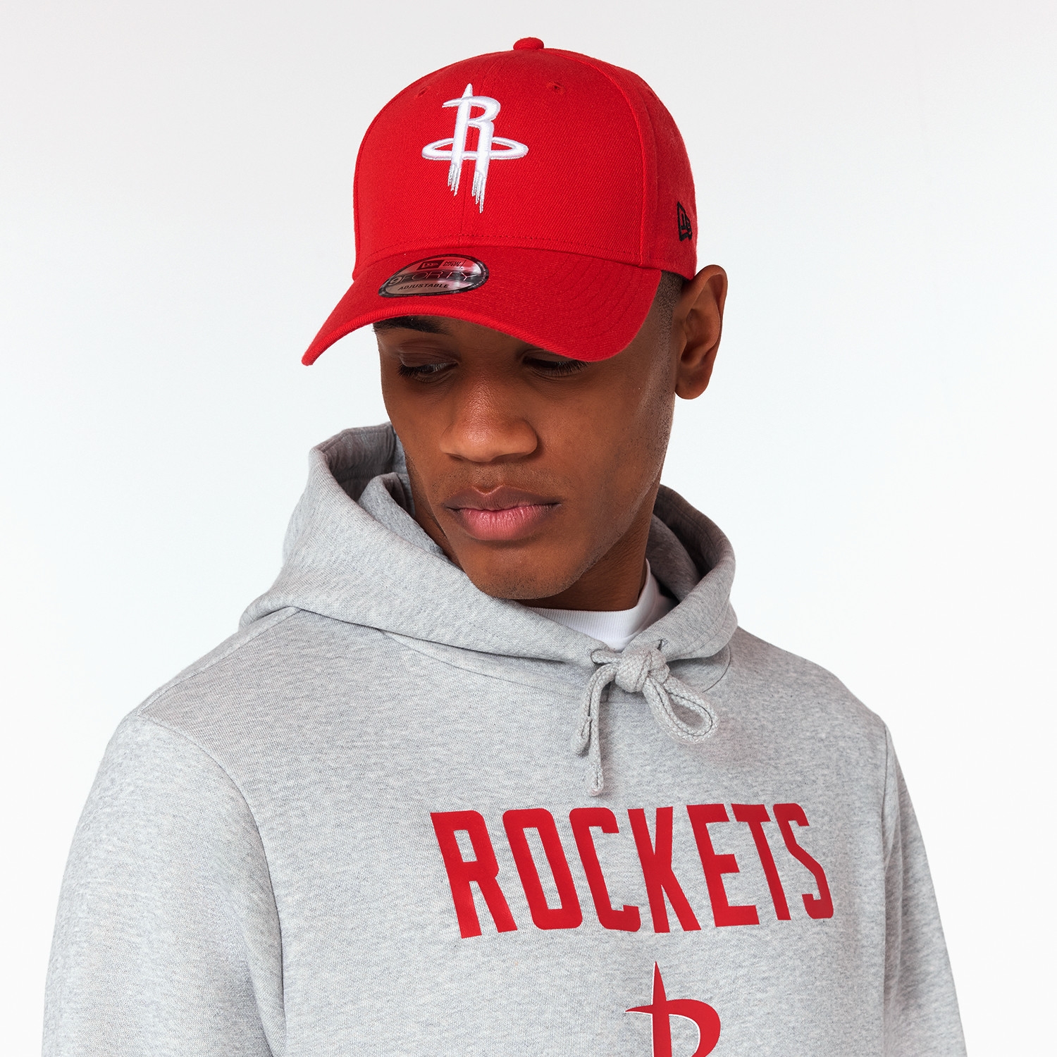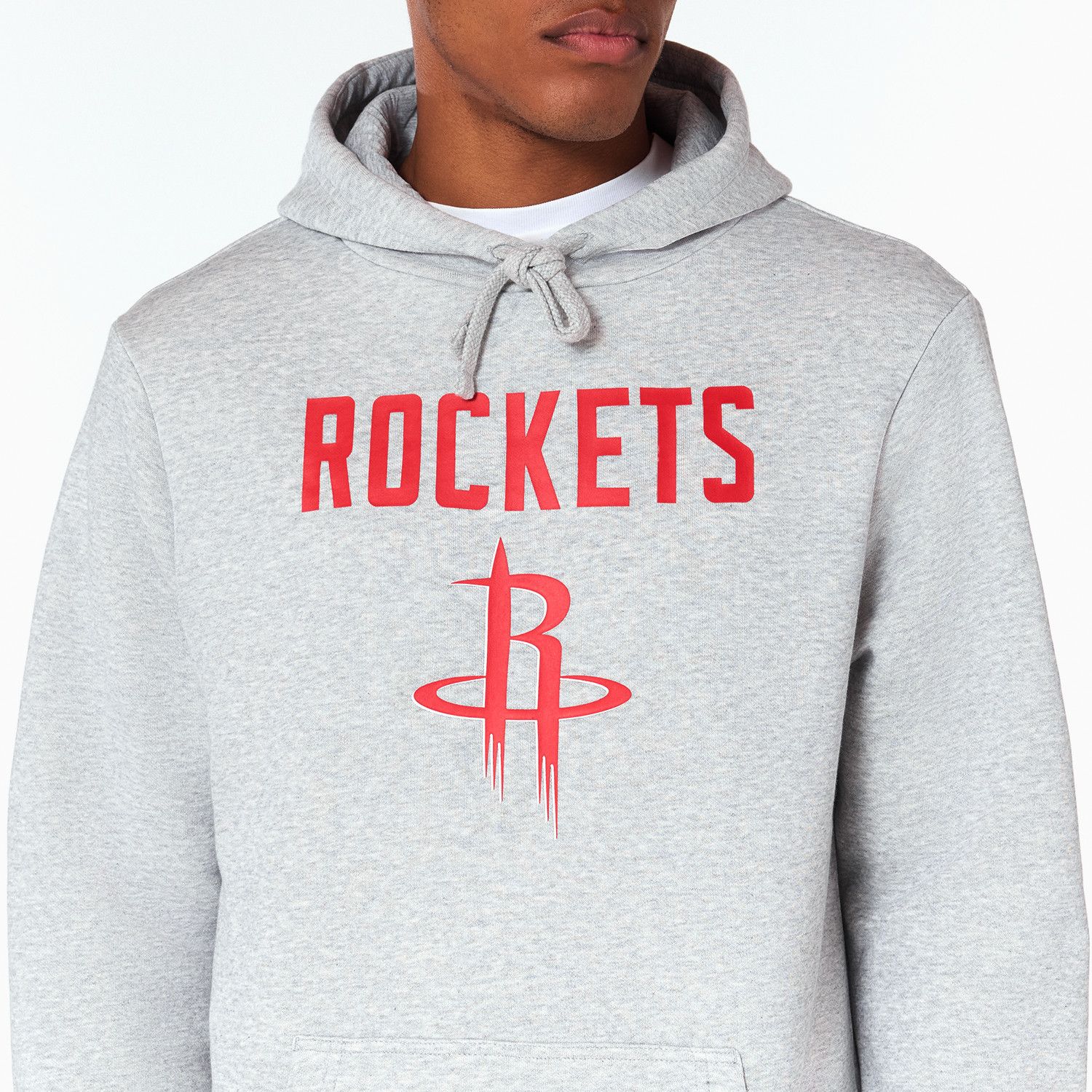 Premium Pull-over long sleeve hooded sweatshirt by New Era. Screenprinted Houston Rockets team logo and team wording on center front chest. Team colored New Era flag embroidery on left cuff. With kangaroo hand pocket, attatched hood and drawcord strings. Rib crew neck with interior taping for a comfortable fit. French terry lining on inside.