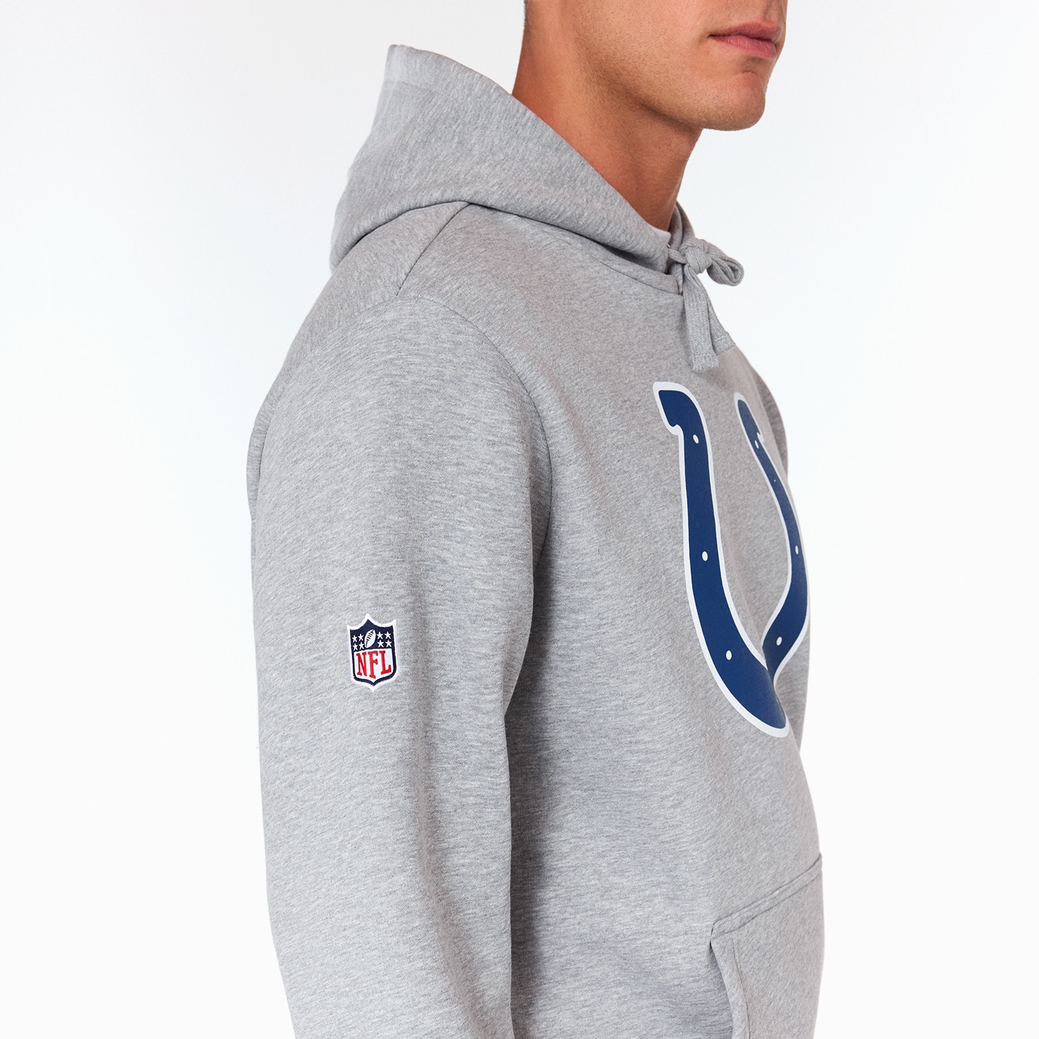 Pull-over long sleeve hooded sweatshirt. 1x1 knit rib in cotton/spandex blend. Screenprinted Indianapolis Colts team logo on center front chest. New Era flag embroidery on left cuff and NFL shield logo embroidered on right sleeve. With kangaroo hand pocket, attatched hood and drawcord strings. With rib crew neck with interior taping for a comfortable fit.