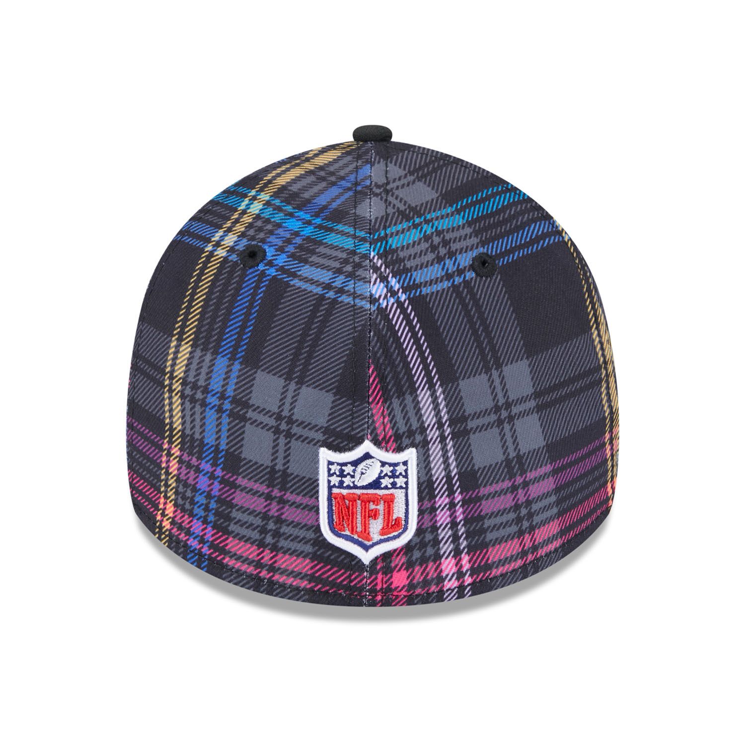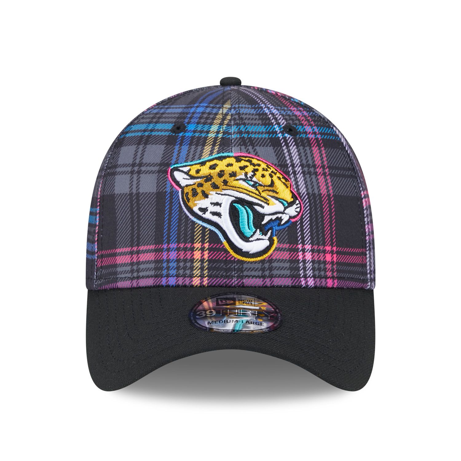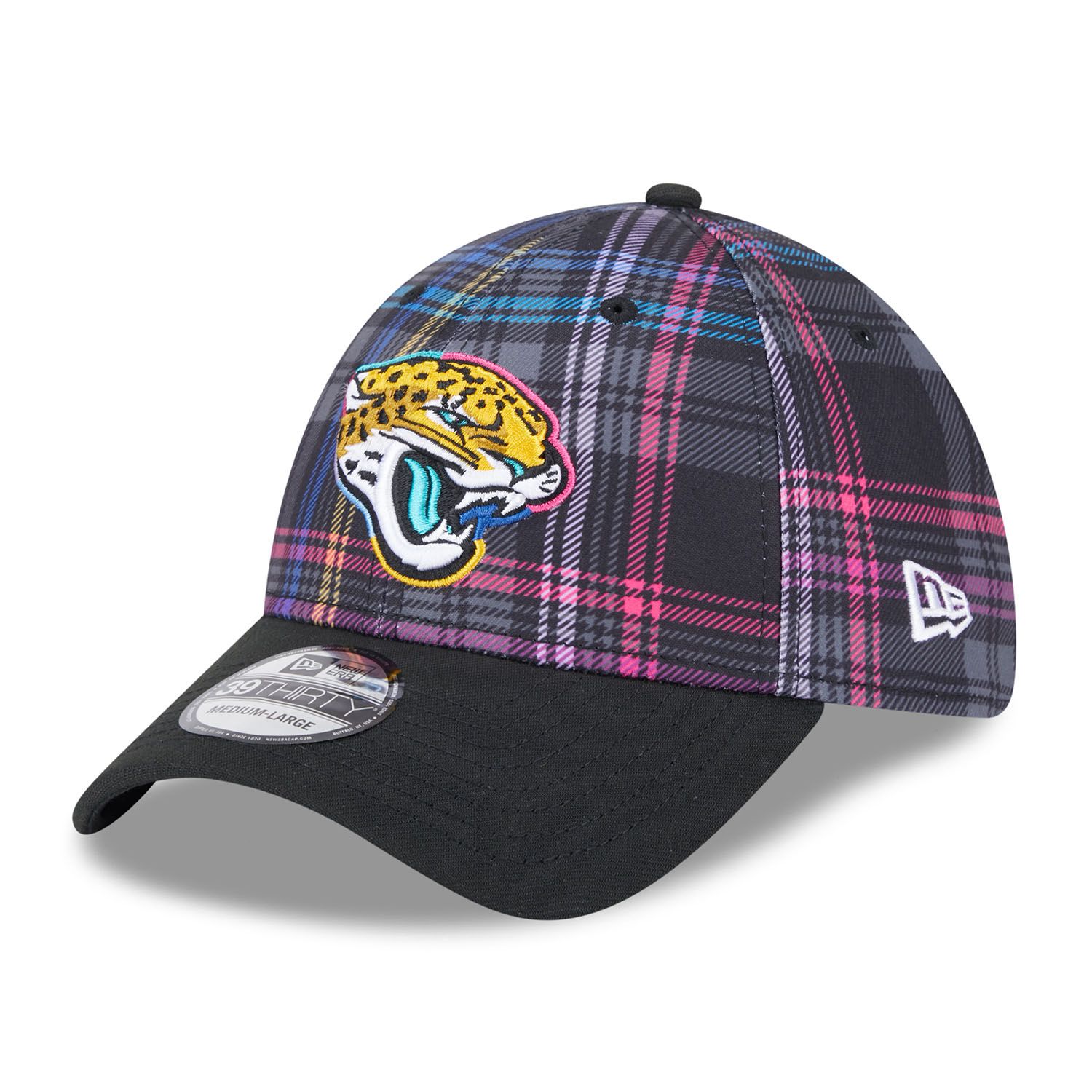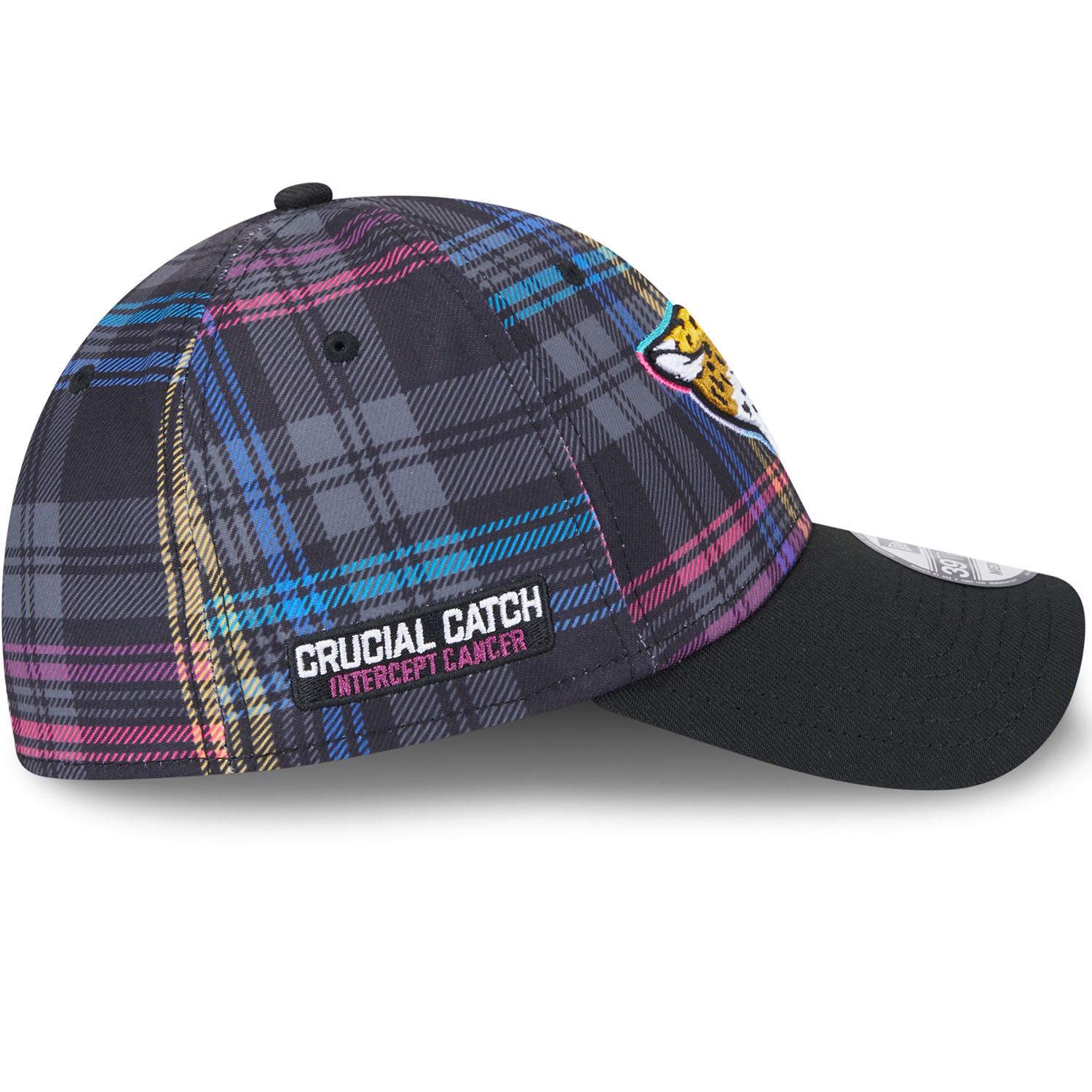 Support the global fight against cancer with the official New Era 2024 NFL Crucial Catch On-Field Cap. This stretch-fitted NFL cap is worn on the sidelines during the 2024-25 Crucial Catch campaign in October. The front of the cap is embroidered with the brightly accented Jacksonville Jaguars team logo. The right side features the "CRUCIAL CATCH - INTERCEPT CANCER" patch, while the back is adorned with the embroidered NFL logo. The sublimated plaid design on all six panels in the signature Crucial Catch colors gives it a unique look.