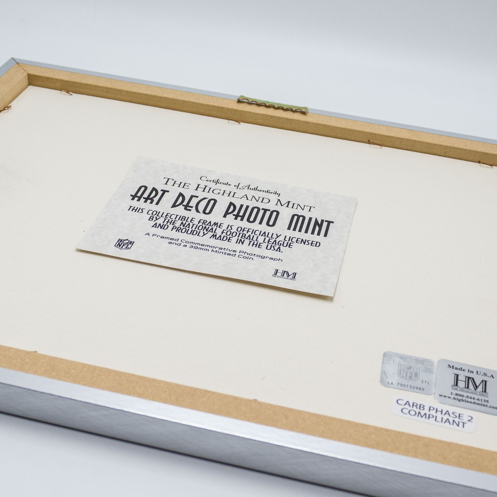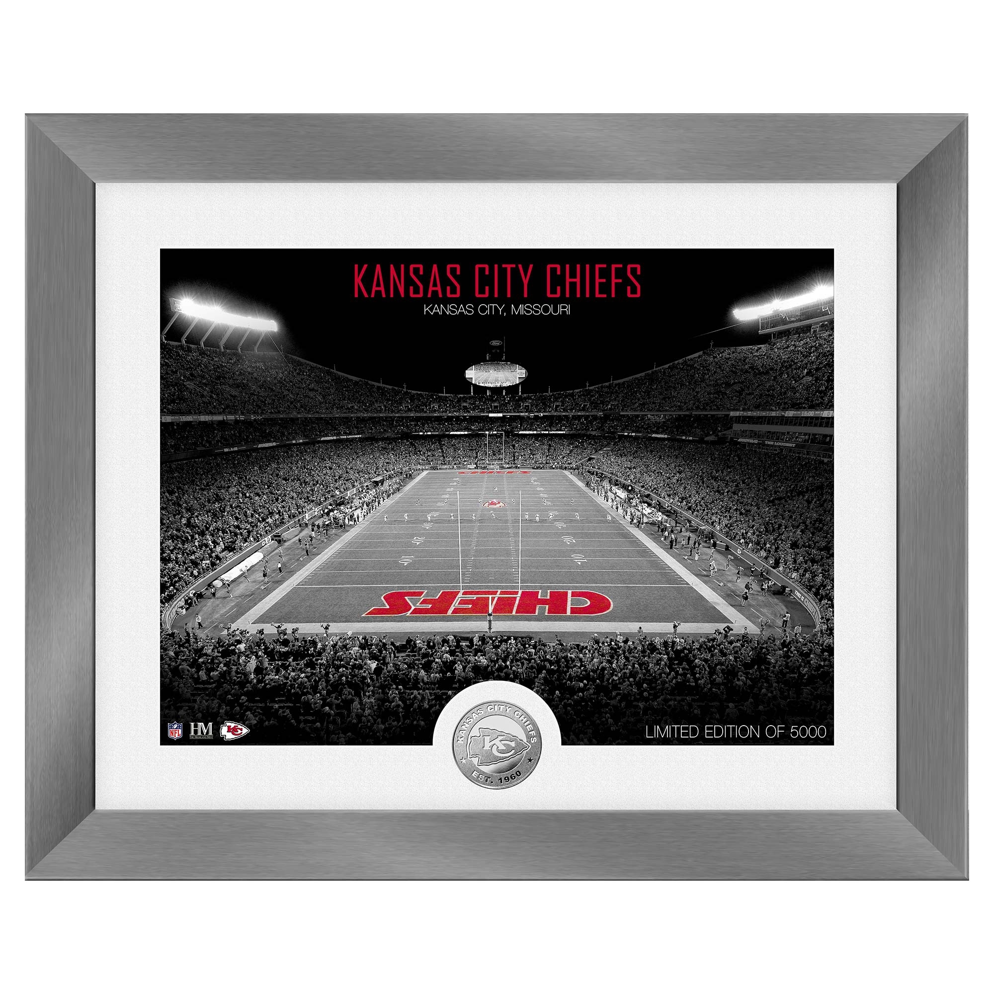 This limited-edition collectible frame features Kansas City Chiefs home field combined with a minted team coin. The silver frame and white matting features a terrific black and white stadium photo with the end zone selectively colored. The photo is matted under glass with a 39mm minted silver-plated team coin. Officially licensed by the NFL and a limited edition of 5000 each Art Deco Photo Mint is accompanied with a certificate of authenticity.