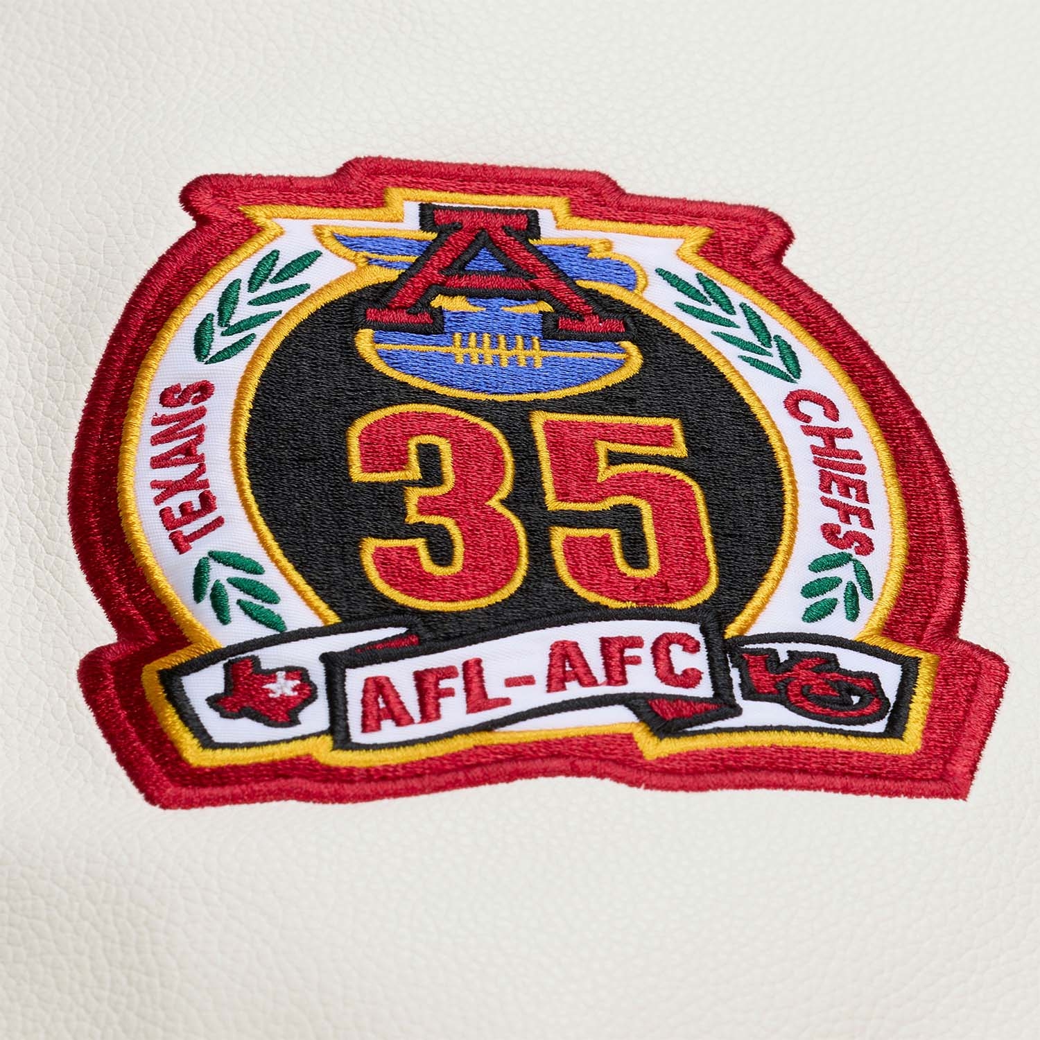 Mitchell & Ness NFL Men's Vintage Dusted Varsity American Football Jacket with faux leather sleeves and stiched team patches from your Kansas City Chiefs.