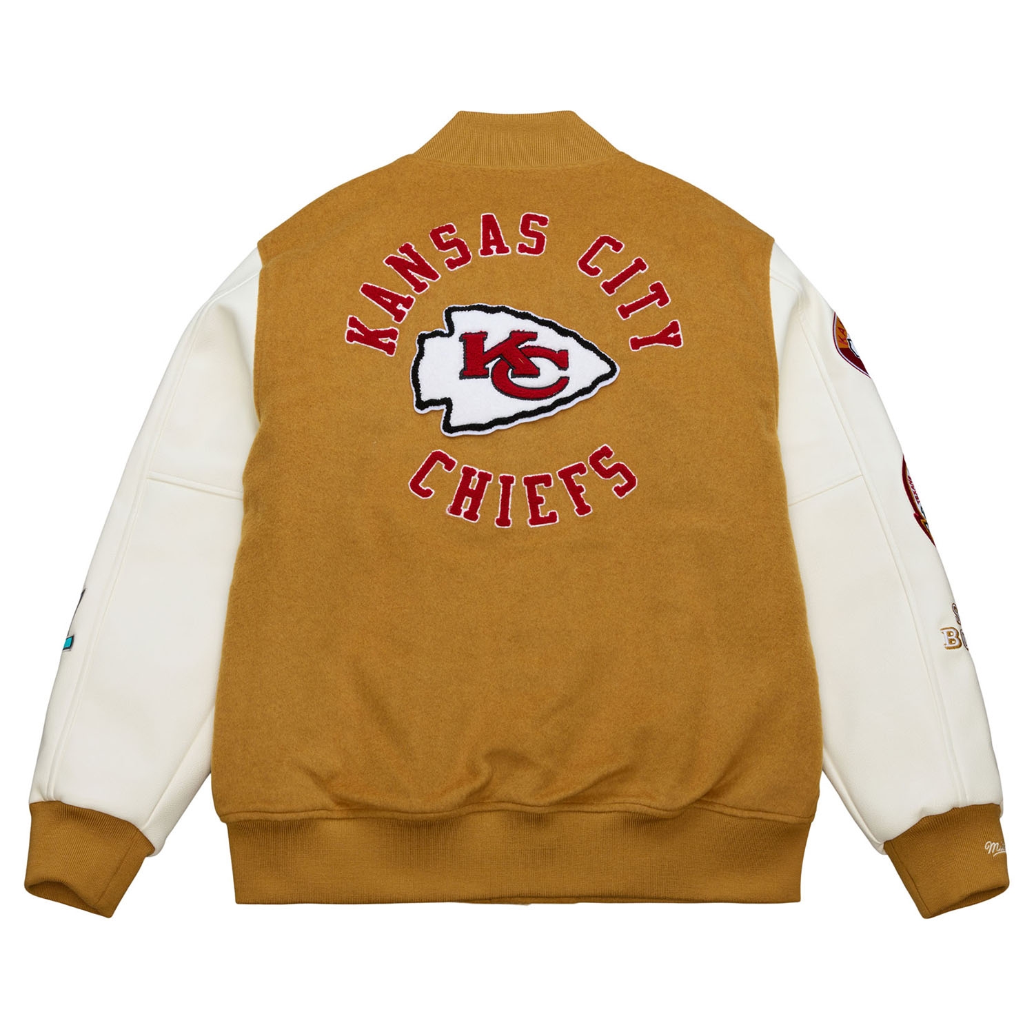 Show your passion for the Kansas City Chiefs with this premium Mitchell & Ness varsity jacket in the Vintage Dusted Design. This piece blends classic college-jacket styling with iconic NFL graphics and a unique retro aesthetic, highlighted by the distinctive Dusted Ochre body color. The sleeves are made of textured faux leather with intricately embroidered team patches.