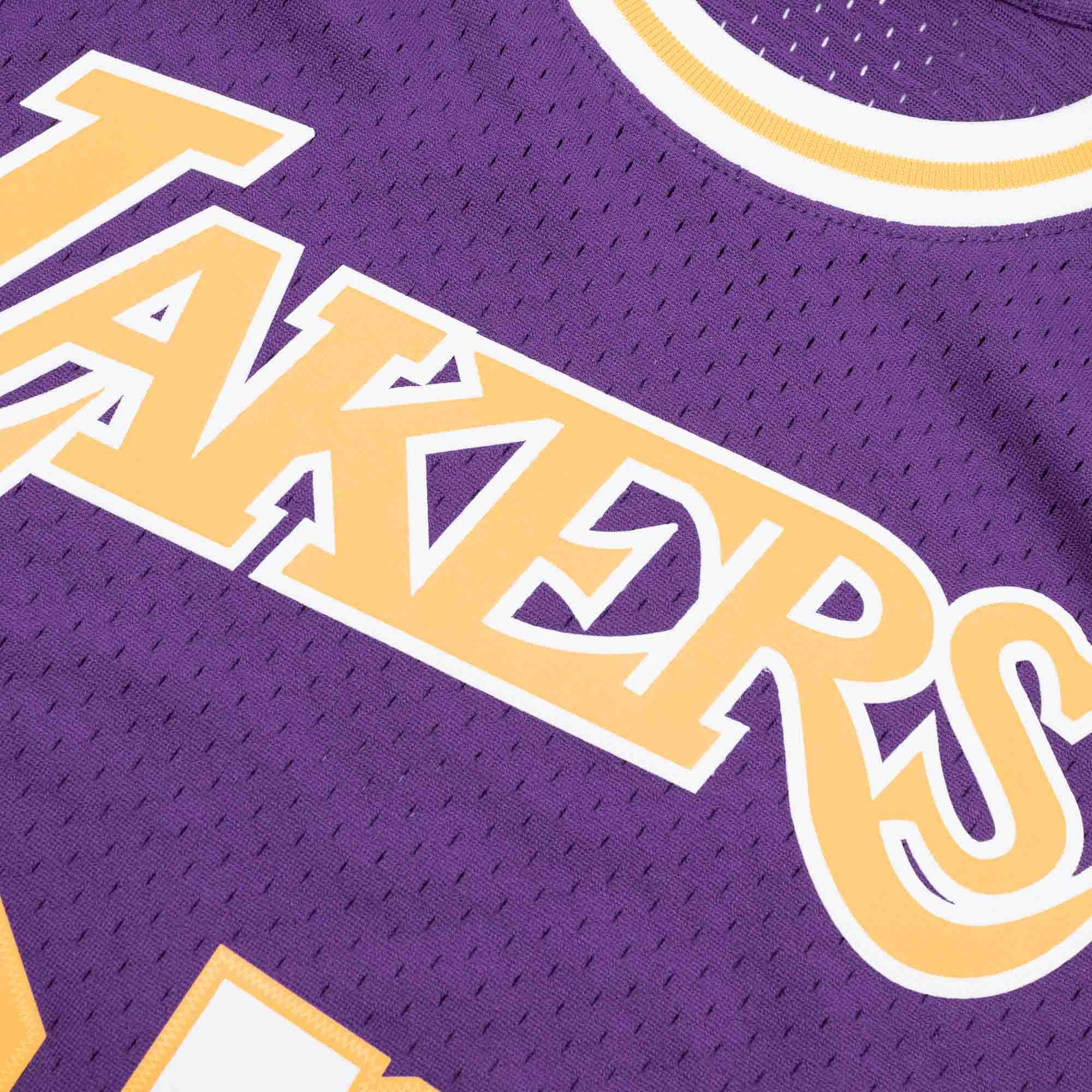 Rep your favorite team and player anytime in the NBA Swingman Hardwood Classics Jersey, replicating what the LA Lakers have worn on the court during that era. With heat seal screen printed twill logo, name and number applications. The body is made from 100% polyester mesh. Woven Hardwood Classics-Mitchell & Ness jocktag at front lower left.