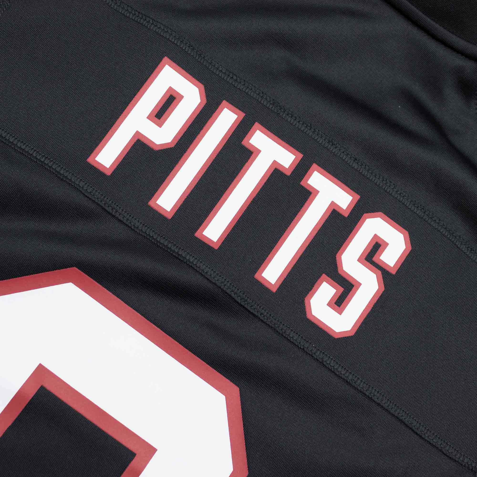Rep your favorite team and player anytime in the NFL Game Jersey, inspired by what they're wearing on the field and designed for total comfort. The jersey features screen-printed Kyle Pitts Atlanta Falcons graphics letting everyone know who you cheer for: Rise Up Falcons! Featuring strategic ventilation for breathability, woven jock tag at front lower left, NFL shield at V-neck.
