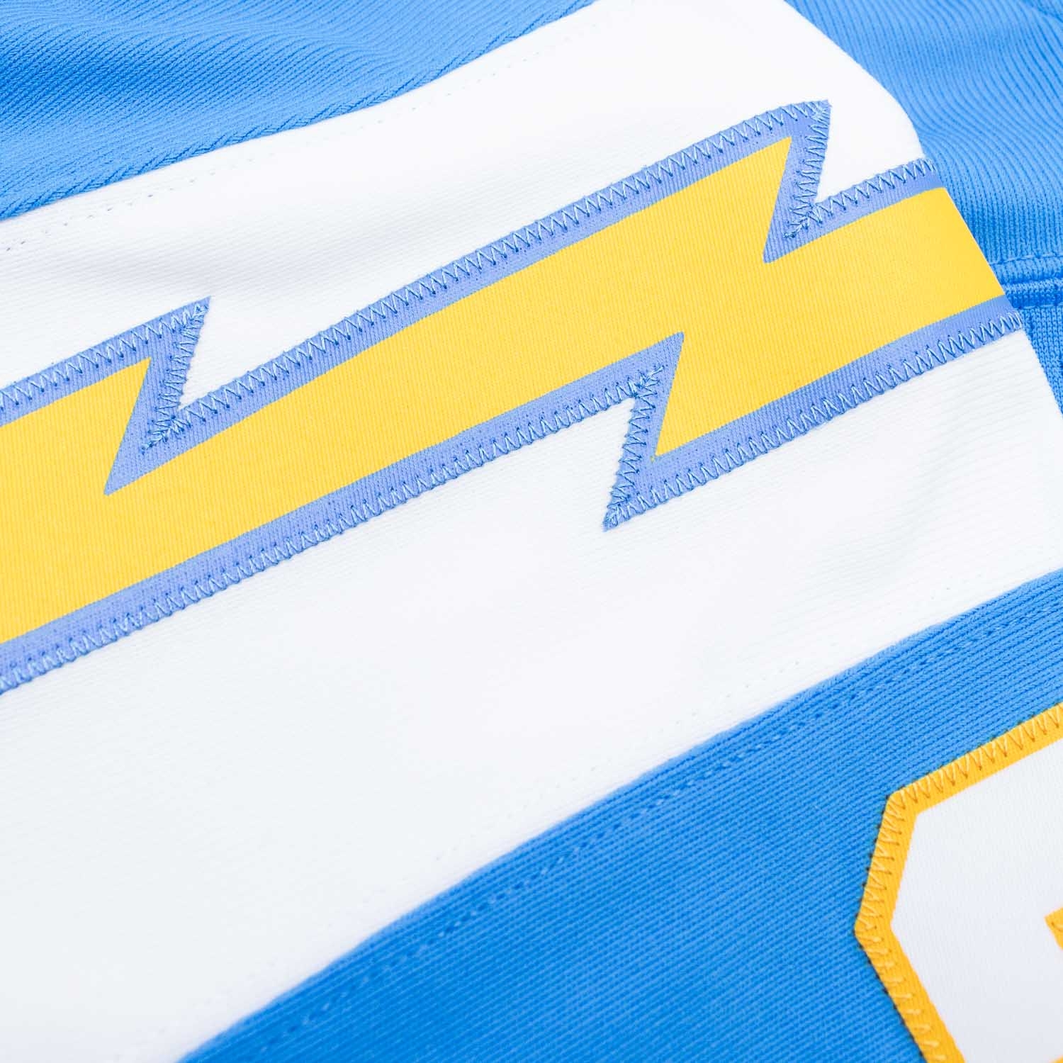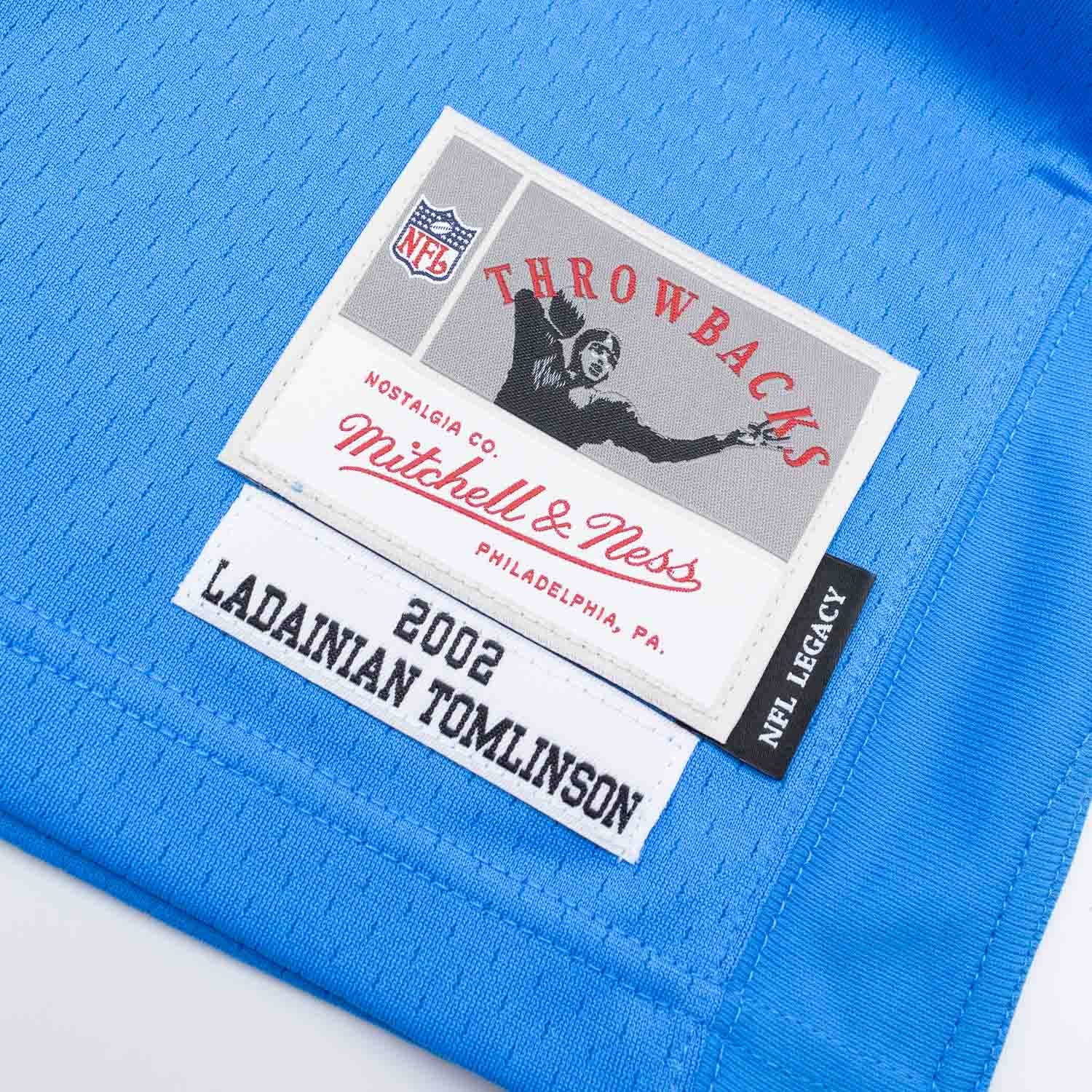 All numbers and letters are stitched on with high-quality embroidery, and the design elements reflect the official NFL design of the San Diego Chargers from 2002. The NFL logo is stitched on the collar, and the Mitchell & Ness Legacy Collection label is located on the hem.