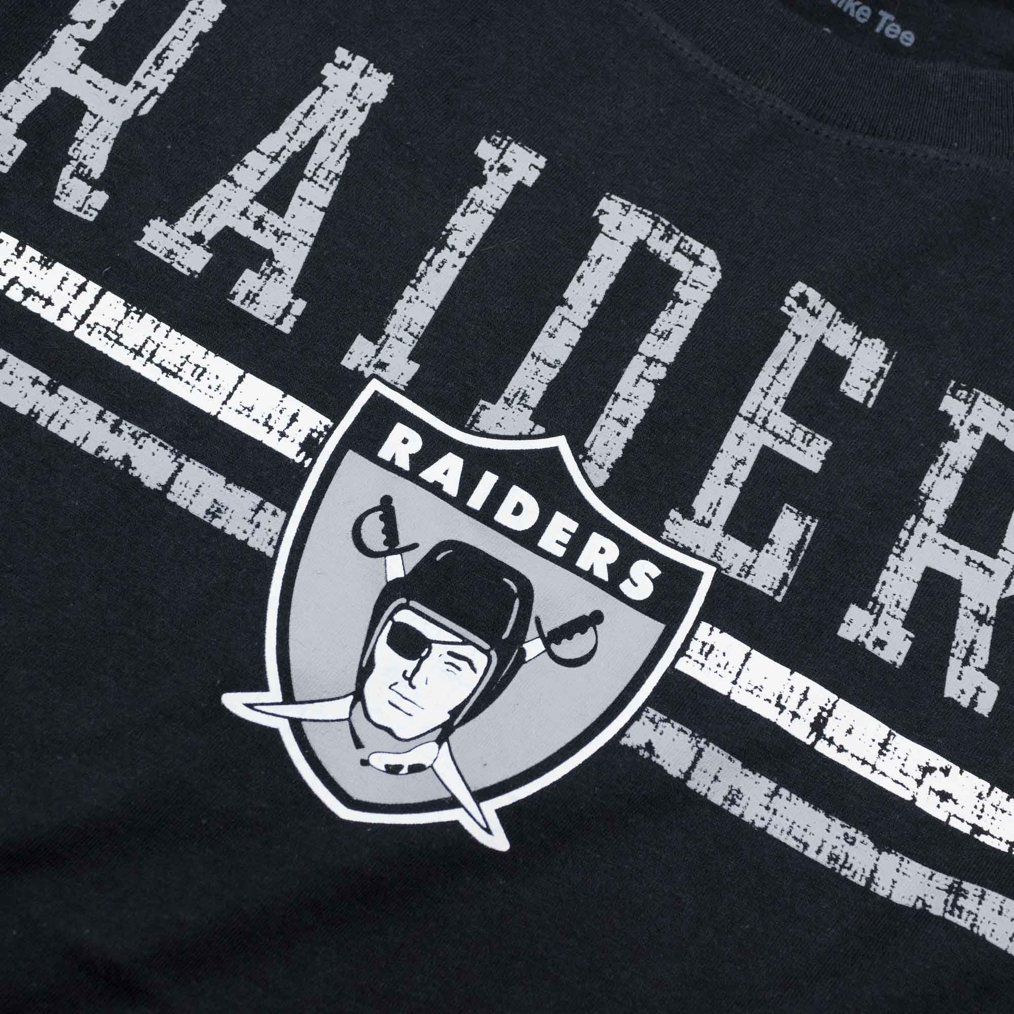 Throwback Football! Celebrate the good old times with the classic NFL look. This Nike tee features classic distressed Las Vegas Raiders team logo and wordmark decoration on front. With vintage Nike Swoosh decoration on left sleeve. The full cotton fabric and tagless neckline helps you to stay comfortable.