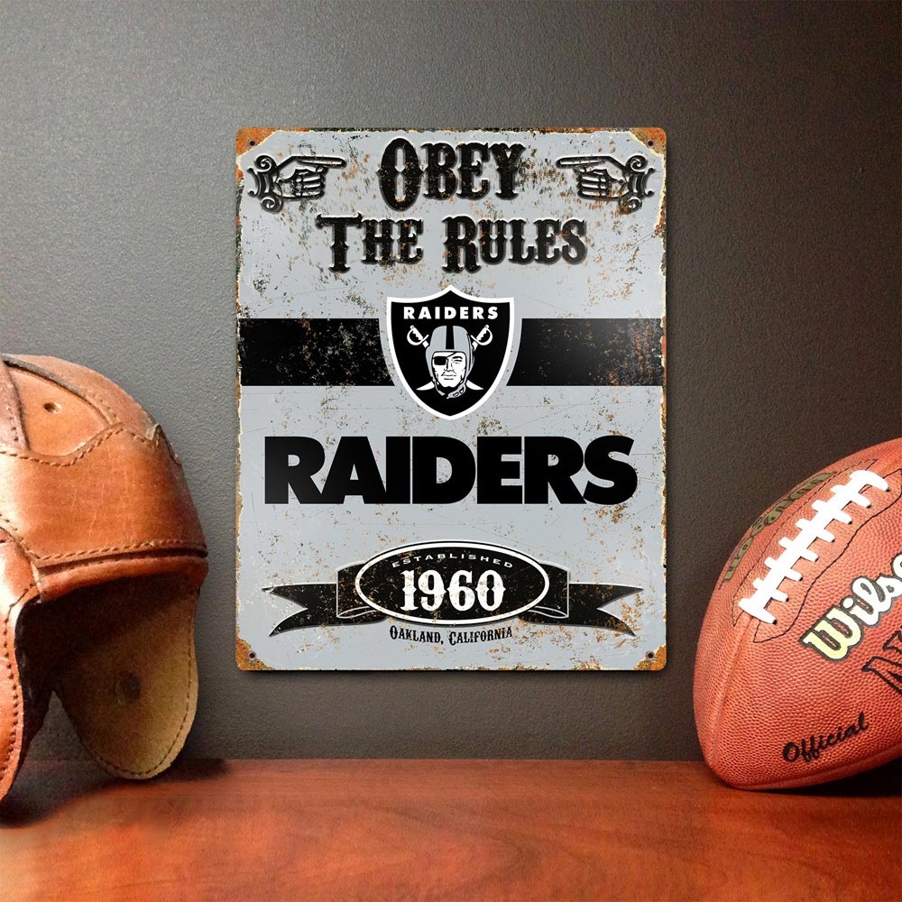 Party Animal NFL Vintage Obey The Rules Metal Sign from your Las Vegas Raiders. Indoor/Outdoor.