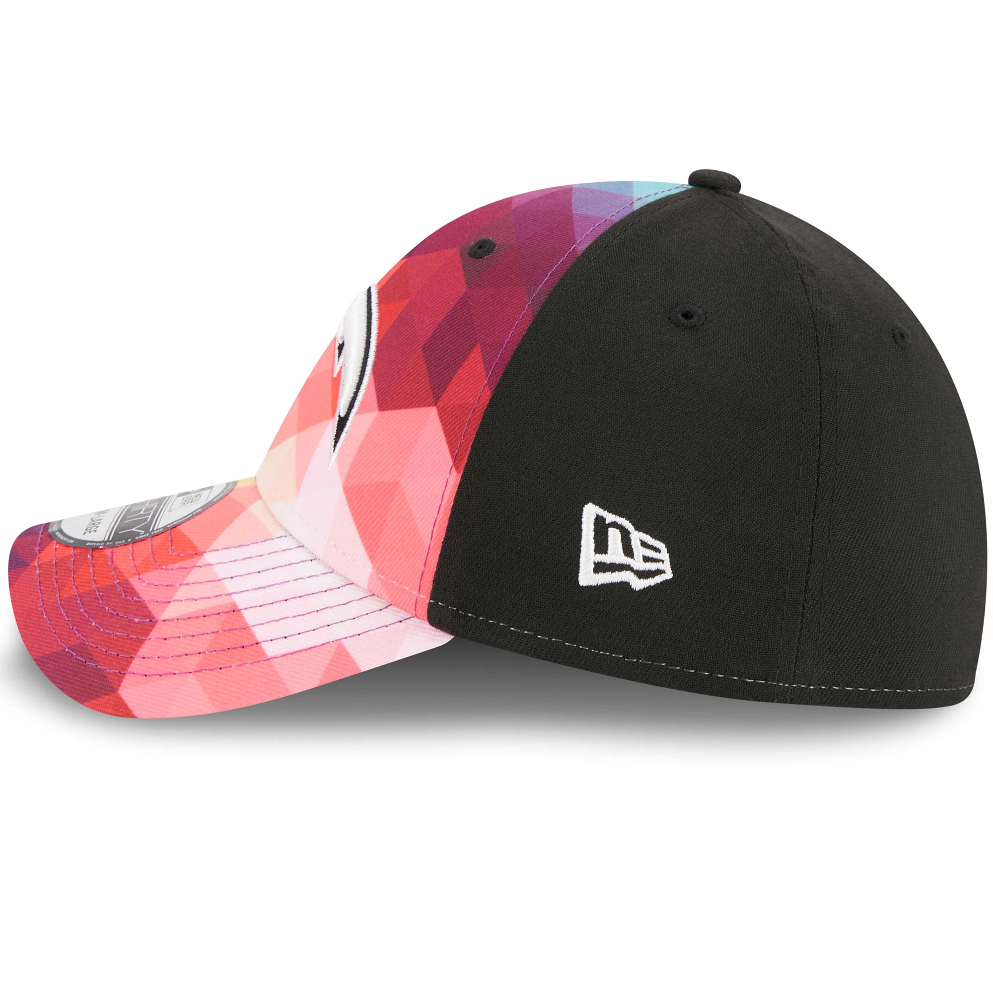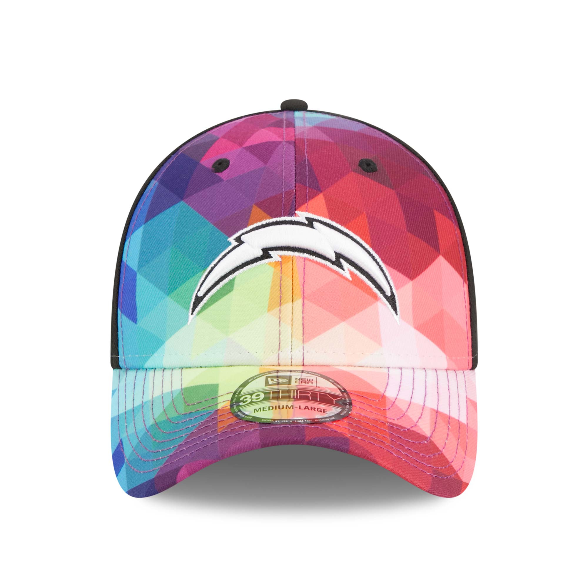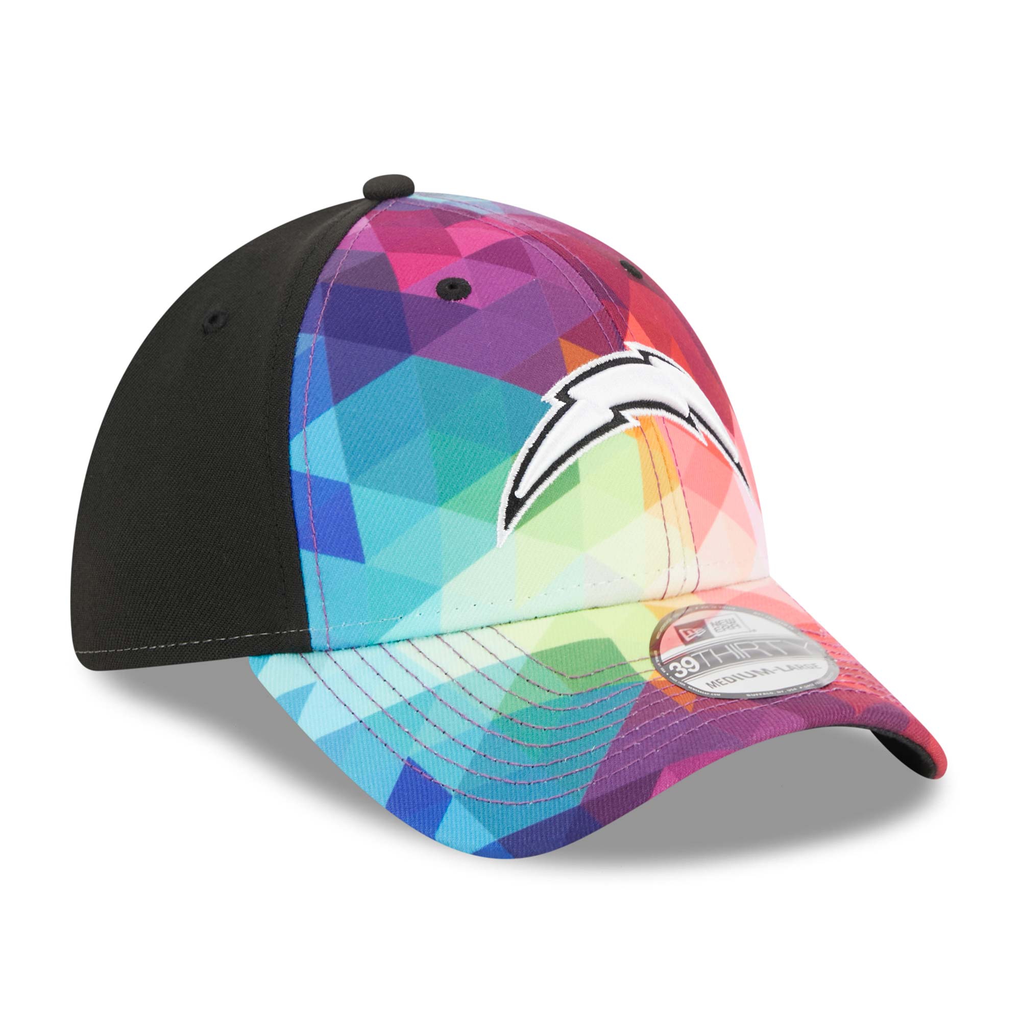 Support the fight against cancer with this official On-Field 2023 NFL Crucial Catch Sideline Hat by New Era. The Los Angeles Chargers Crucial Catch Stretch Fitted Cap features a colorful patterned front. Embroidered black and white team logo at the front. With Crucial Catch Intercept Cancer patch on closed back.