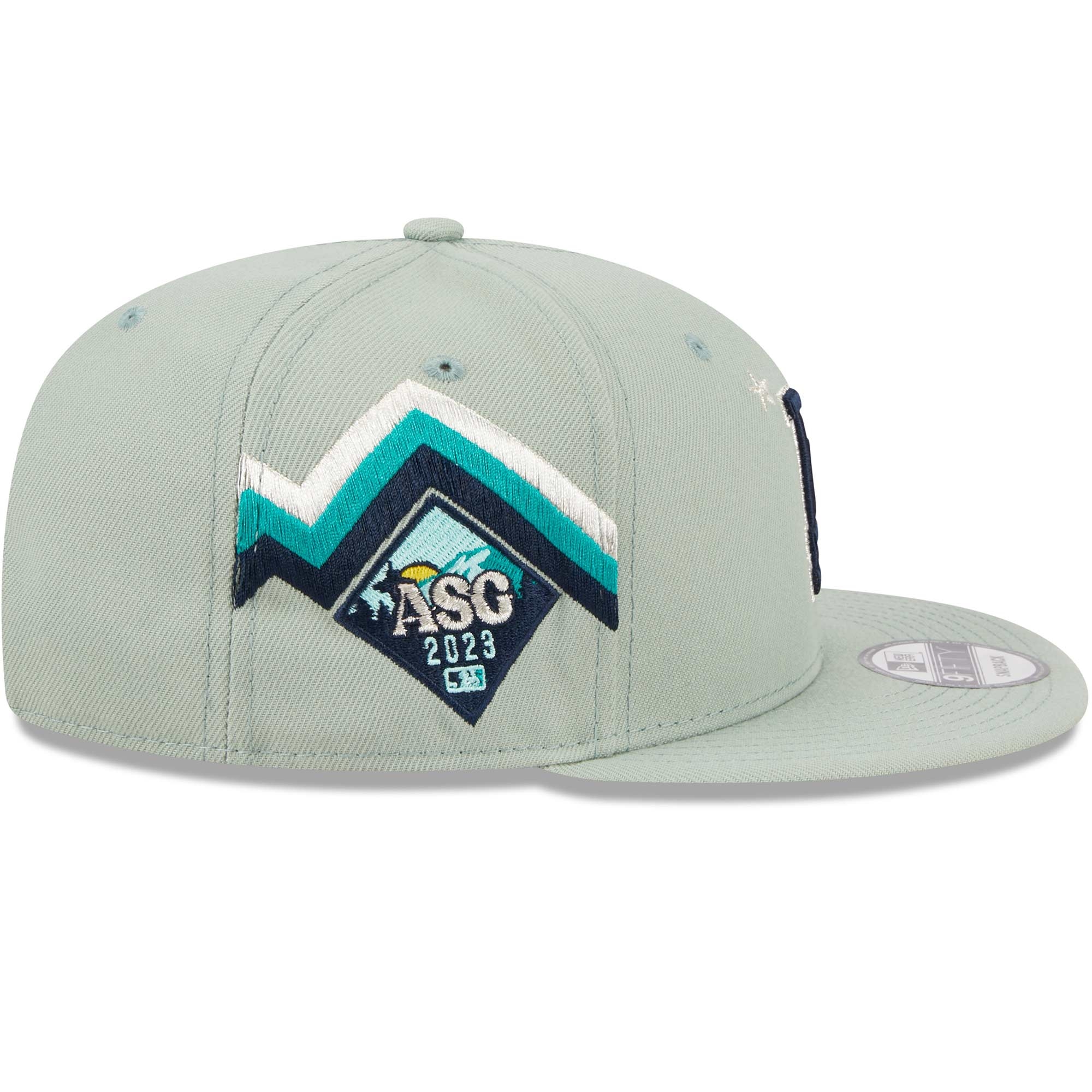 The mint green 2023 MLB All-Star Game Adjustable Cap celebrates Seattle with its special color scheme and provides unique team support. The front of the cap is decorated with a two-tone Los Angeles Dodgers team logo in a silver-blue look. The right side of the cap is embroidered with the 2023 ASG logo and dynamic stripes. The underside of the visor is navy blue.