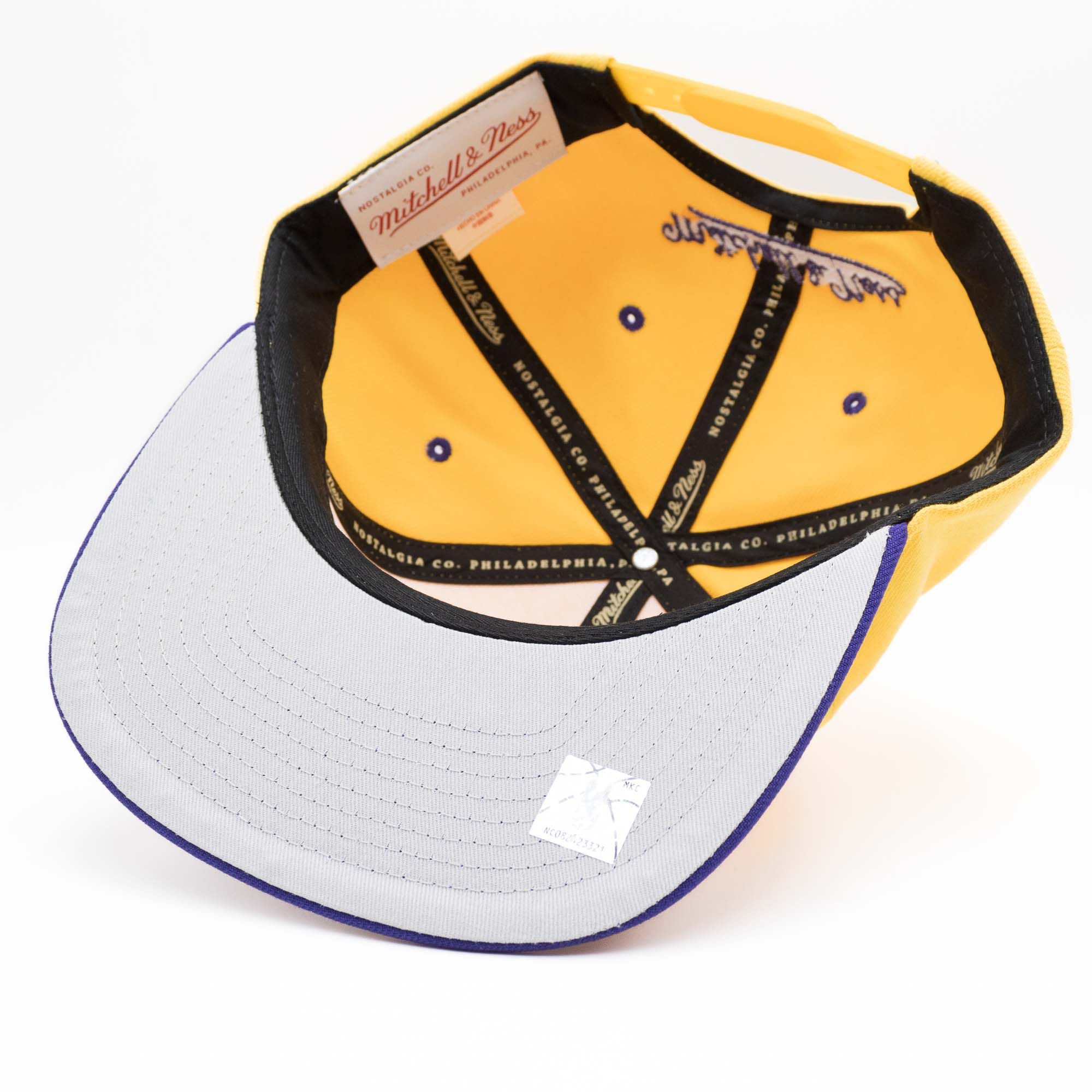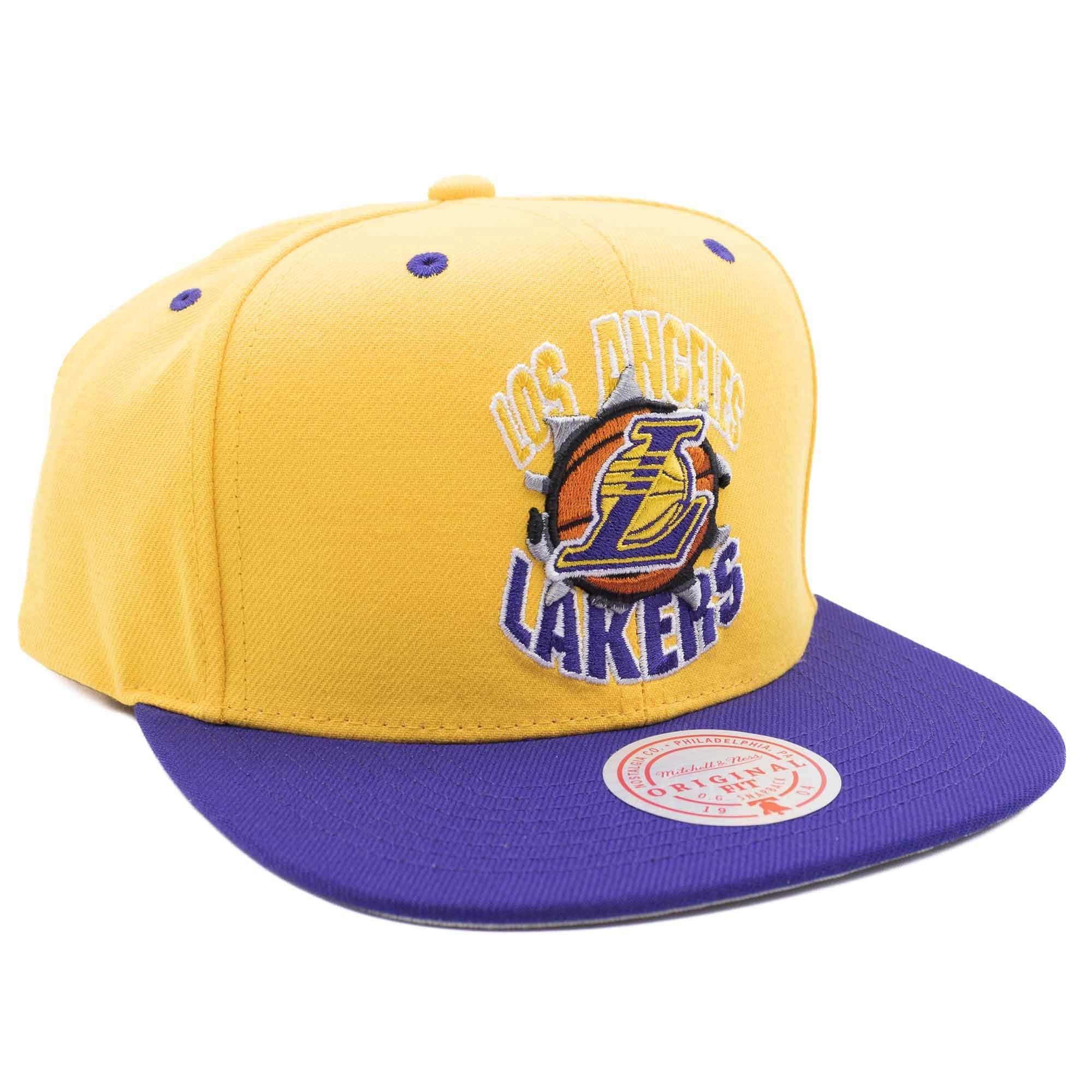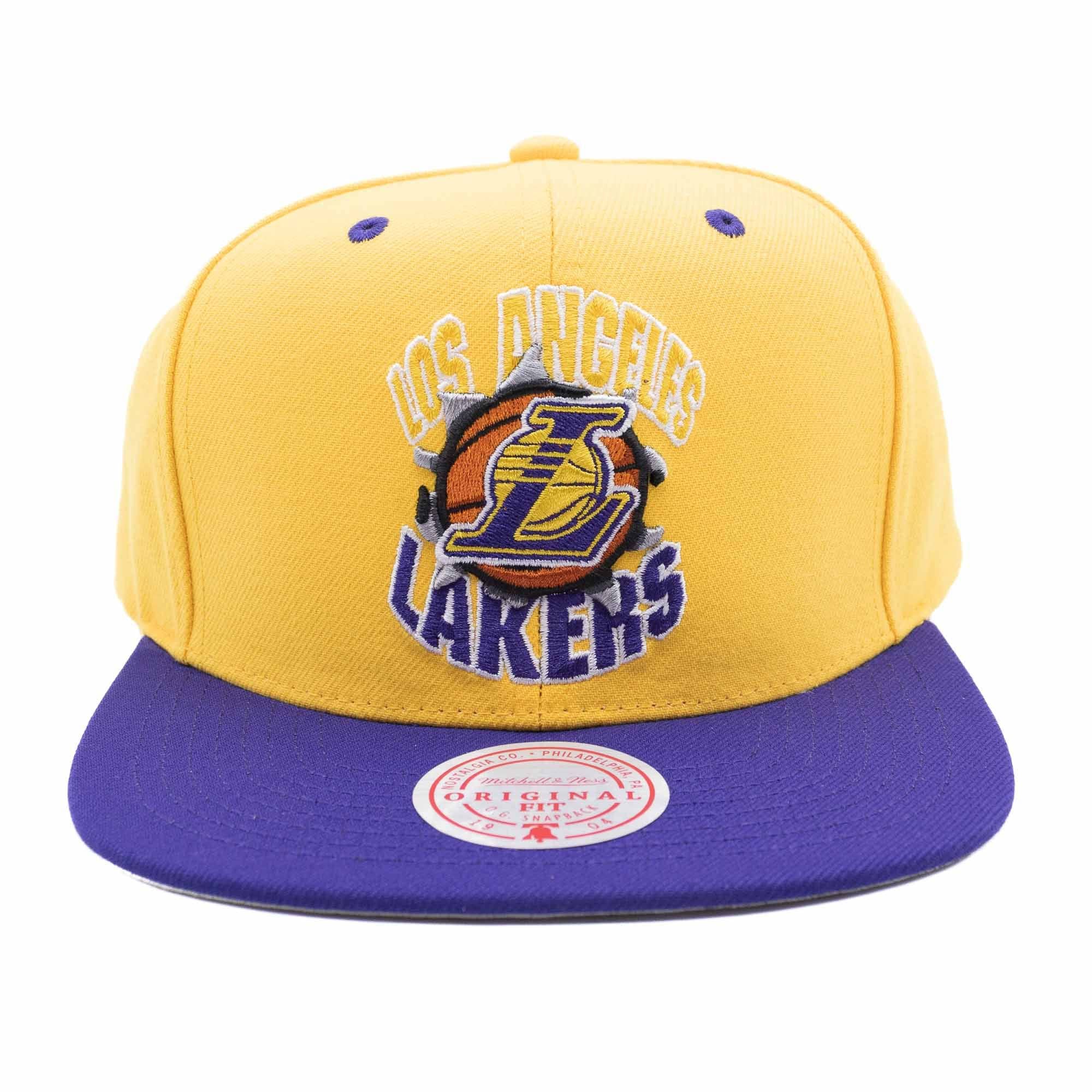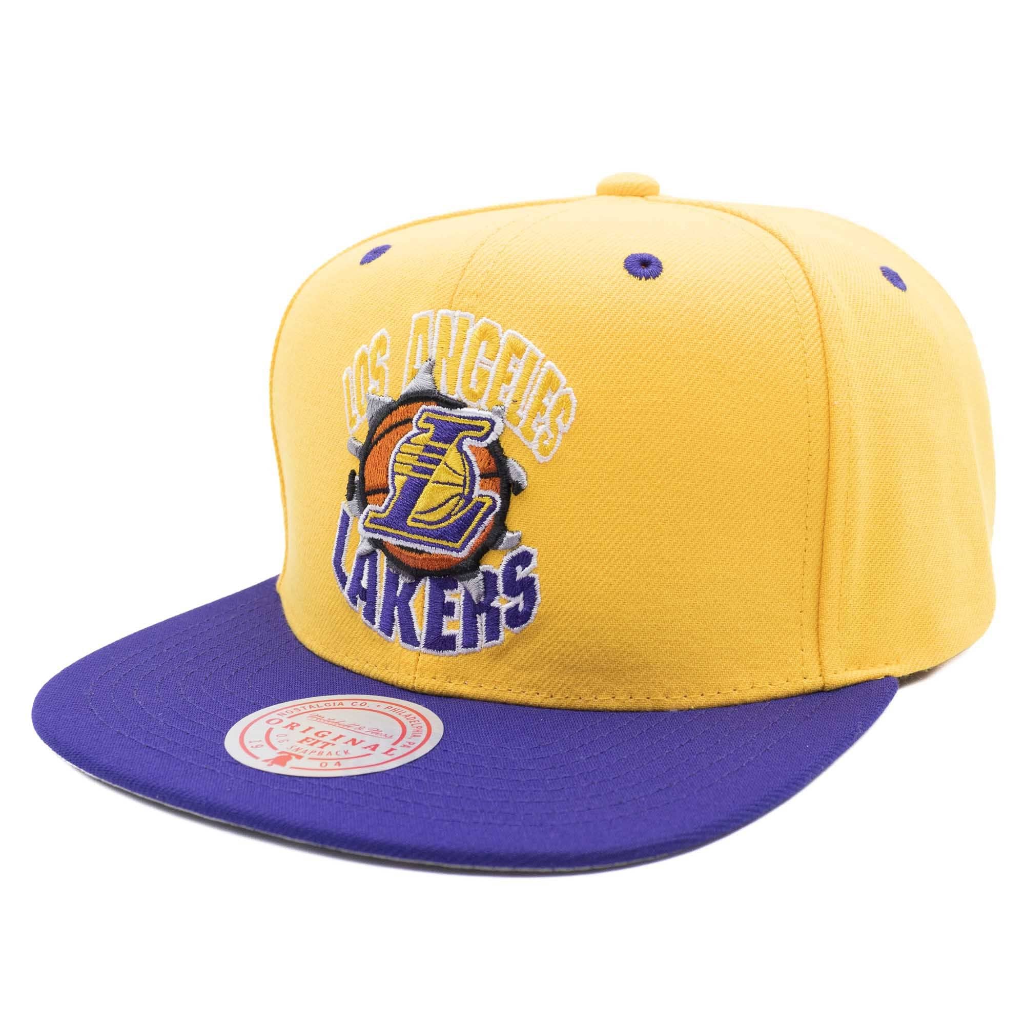 BREAKTHROUGH! Leave the old stuff behind and break into new style universes with the brand new Mitchell & Ness Snapback NBA Cap. Structured cap features Los Angeles Lakers team logo breaking through the structured front. Two color design for your throwback ambitions. Back is embroidered with the Mitchell & Ness lettering. Underside of the visor is classic gray.