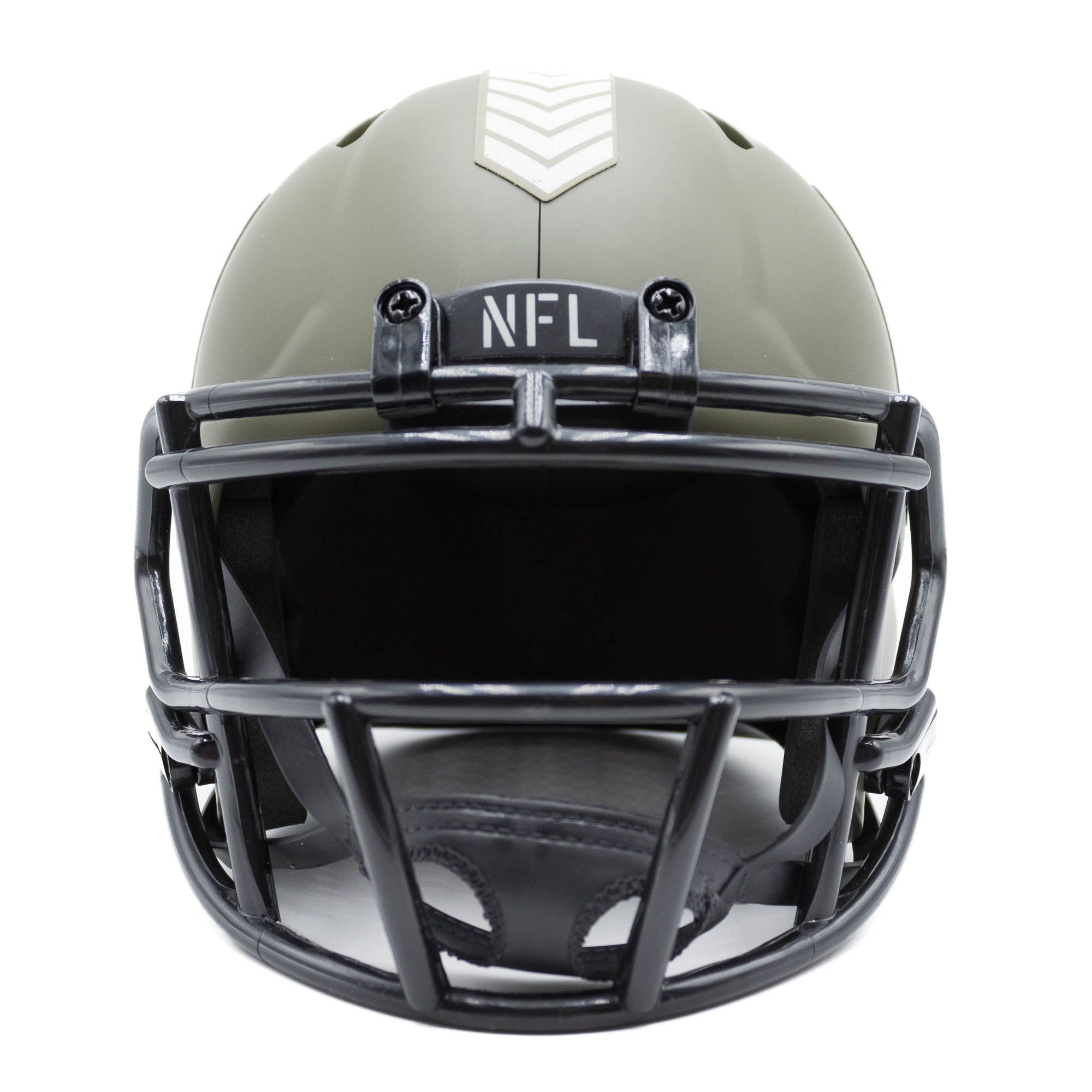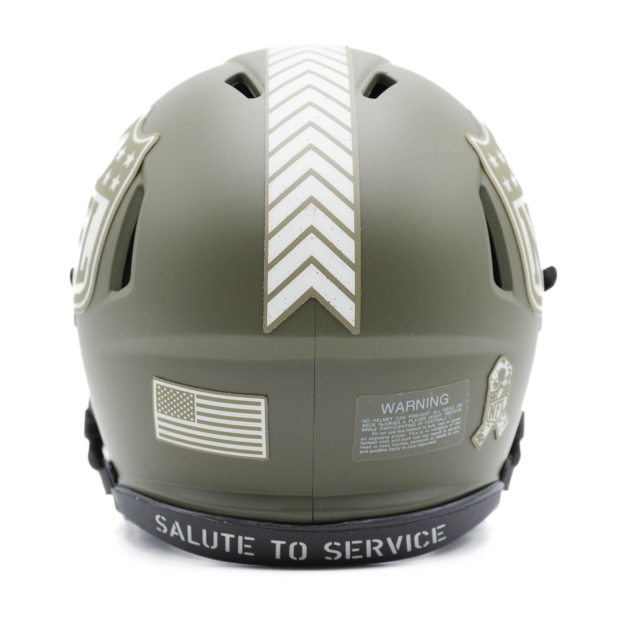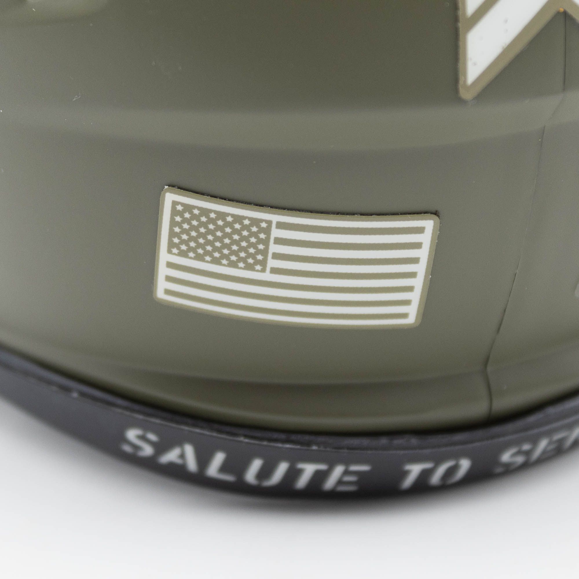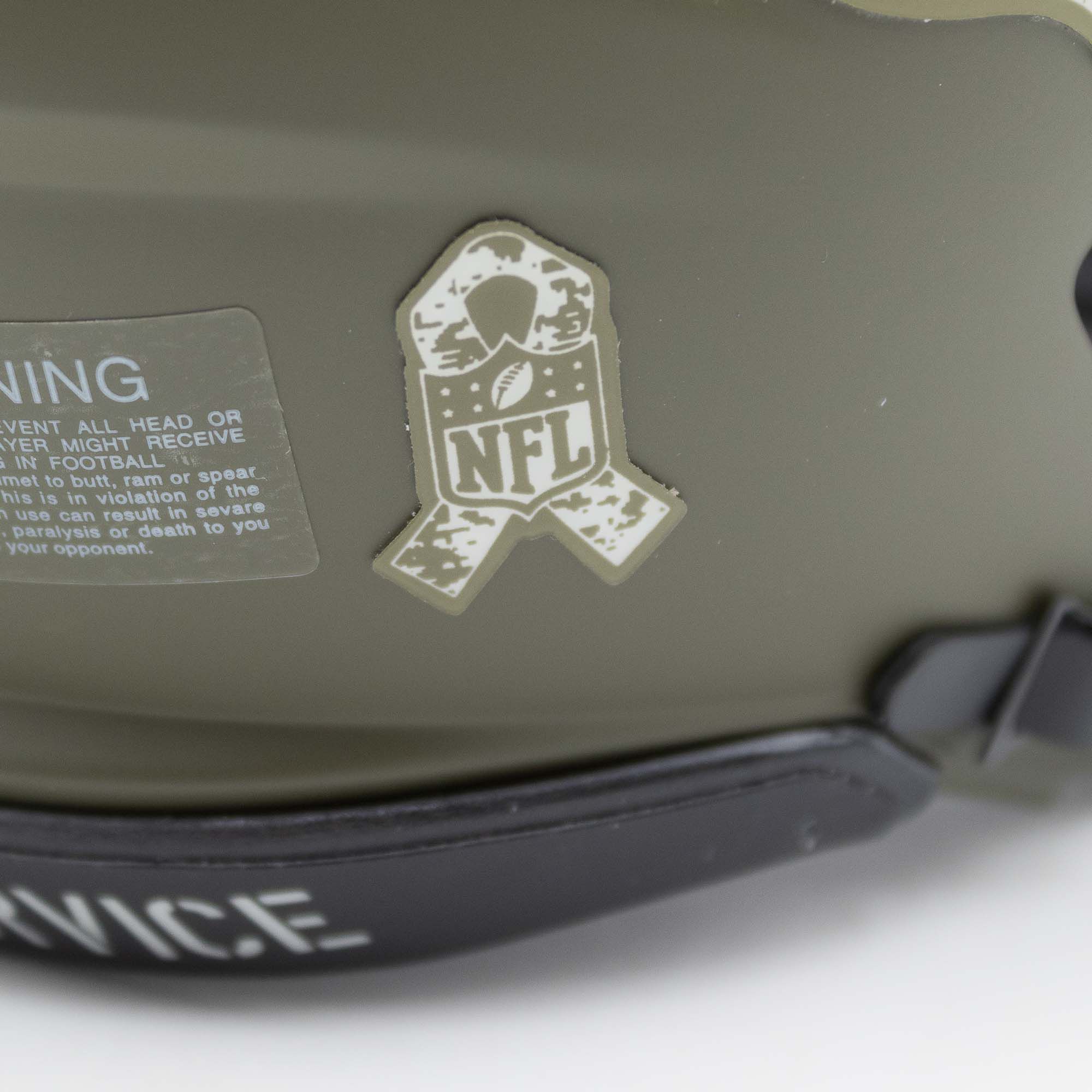 The NFL takes pride in supporting military personnel and remains committed to raising awareness for the sacrifices they make on our behalf. All royalties from the NFL's Salute to Service campaign are donated to the NFL's military non-profit partners including: USO, Pat Tillman Foundation and Wounded Warrior Project. Support the cause with the official 2022 Salute to Service Riddell Mini Helmet. The most popular collectible in history is now available in an military inspired design. This mini helmet offers a matte shell and special edition colors. It's a must-have for the serious collector and any football fan. Includes interior padding and a 4-pt. chinstrap. Ideal for autographs.