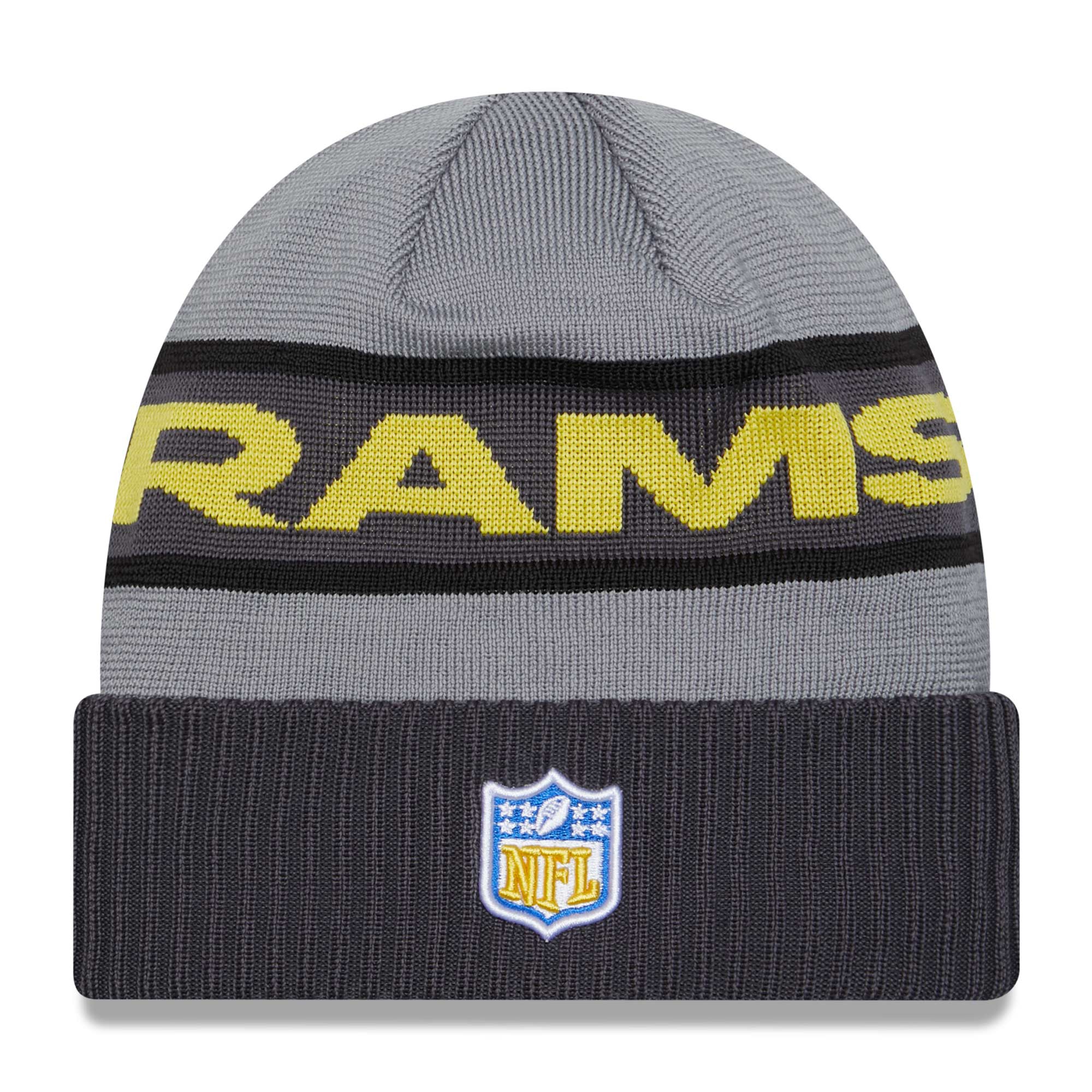 New Era Tech Knit Cuffed Beanie from your Los Angeles Rams. Part of the Gray Colorway 2023 NFL Sideline Collection.