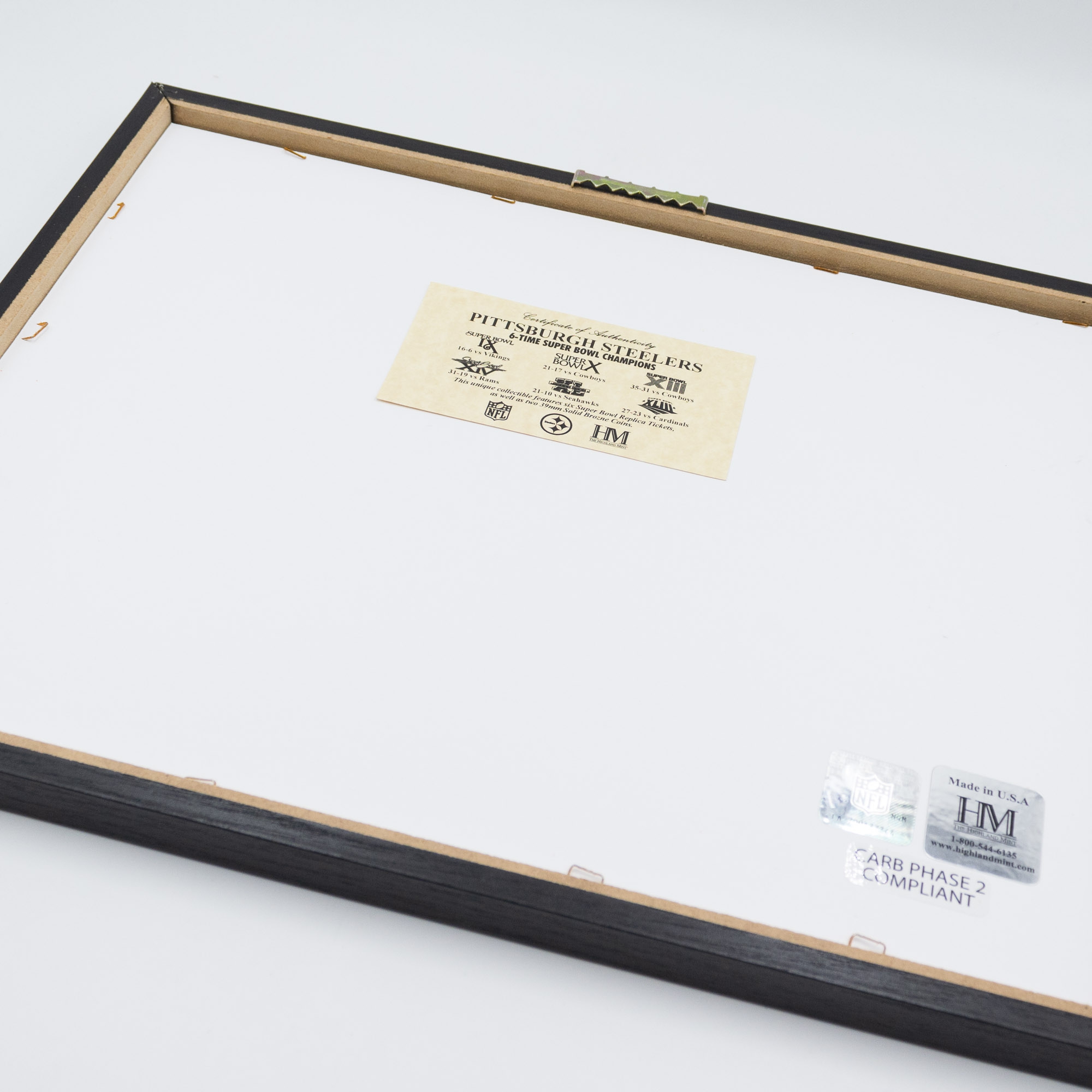 This limited-edition collectible frame features Los Angeles Rams Super Bowl Tickets collection combined with two minted team coins. The black wood frame and team colored matting features all Super Bowl Tickets and the championship card from your favorite franchise. The photo is matted under glass with two 39mm minted bronze coins. Officially licensed by the NFL each Super Bowl Ticket Photo Mint is accompanied with a certificate of authenticity.