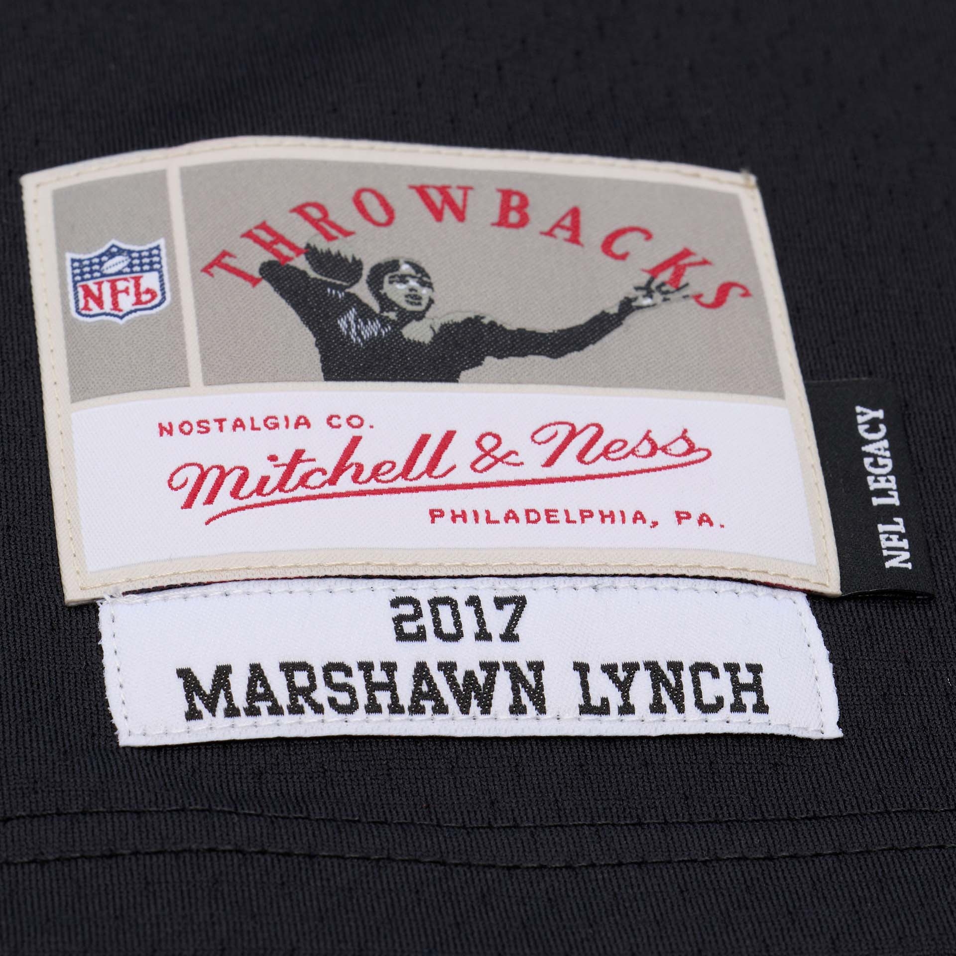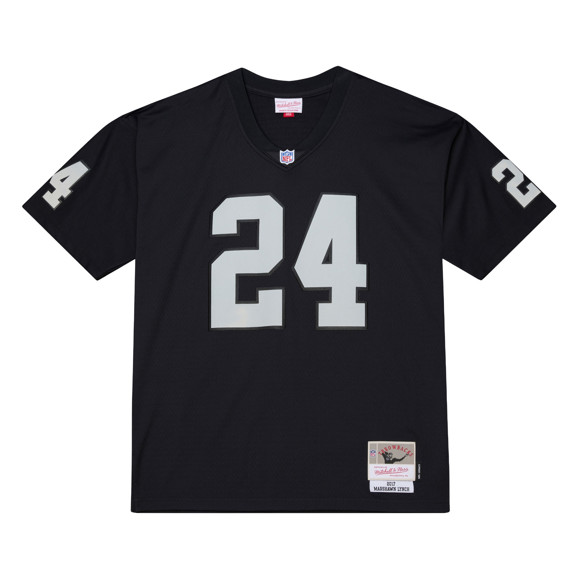 Experience "Beast Mode" in Silver & Black with the official Mitchell & Ness Legacy Throwback Jersey of Marshawn Lynch from the 2017 NFL season. This jersey commemorates Lynch's emotional return to his hometown of Oakland and represents hard-nosed power football in classic Raiders style. An absolute must-have for Raiders fans and collectors of authentic NFL jerseys.