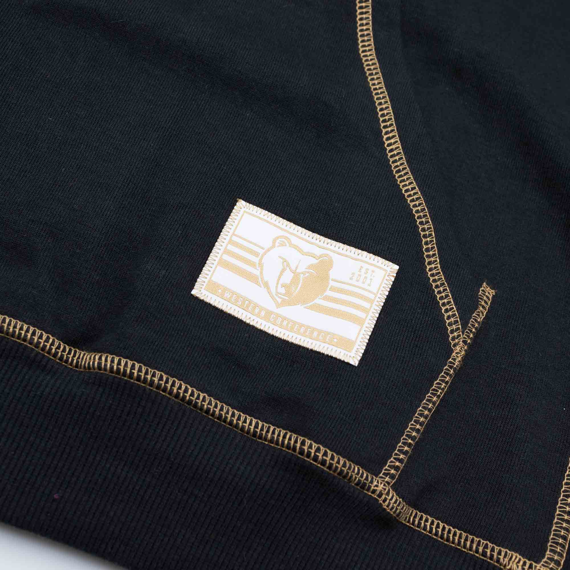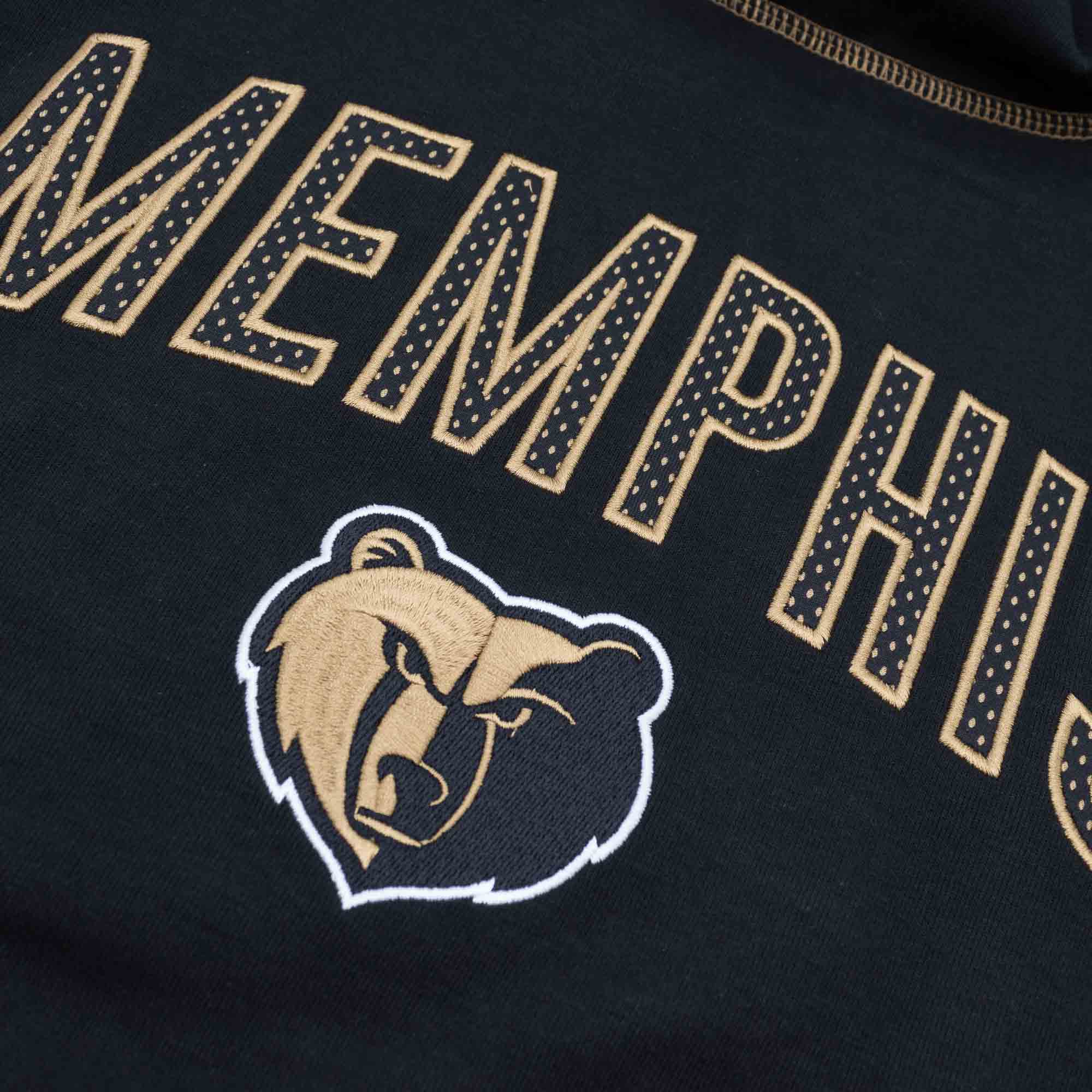 The Memphis Grizzlies 2023 City Edition Black Hoodie features a mesh applique MEMPHIS wordmark and embroidered team logo at the chest with a team jock tag at the kangaroo pocket.