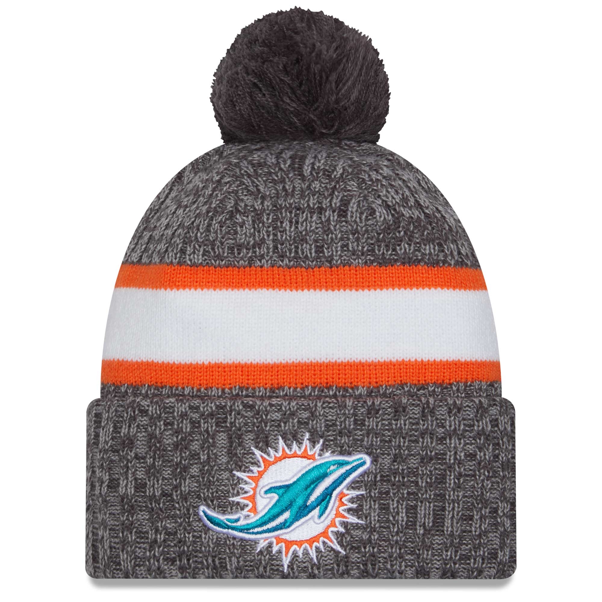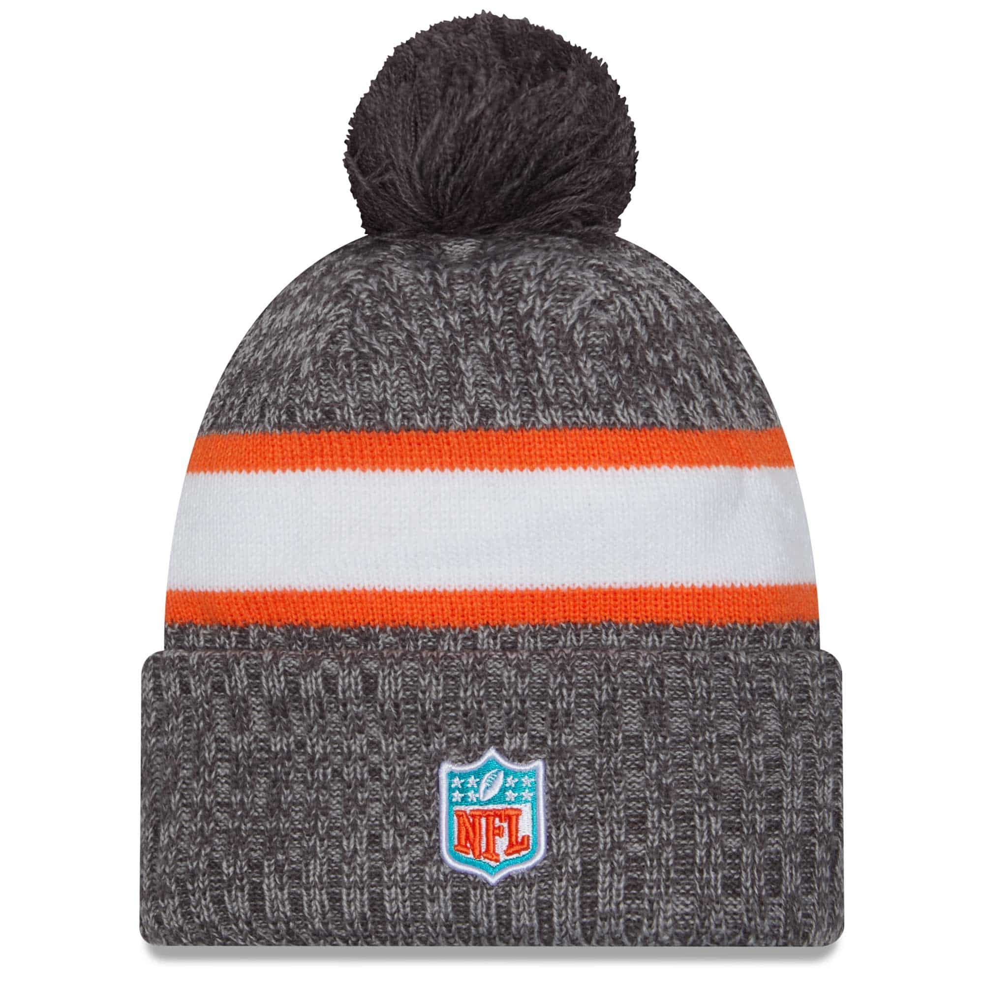 New Era American Football Knit Hat with Pom from your Miami Dolphins. Part of the Gray Colorway 2023 NFL Sideline Collection.
