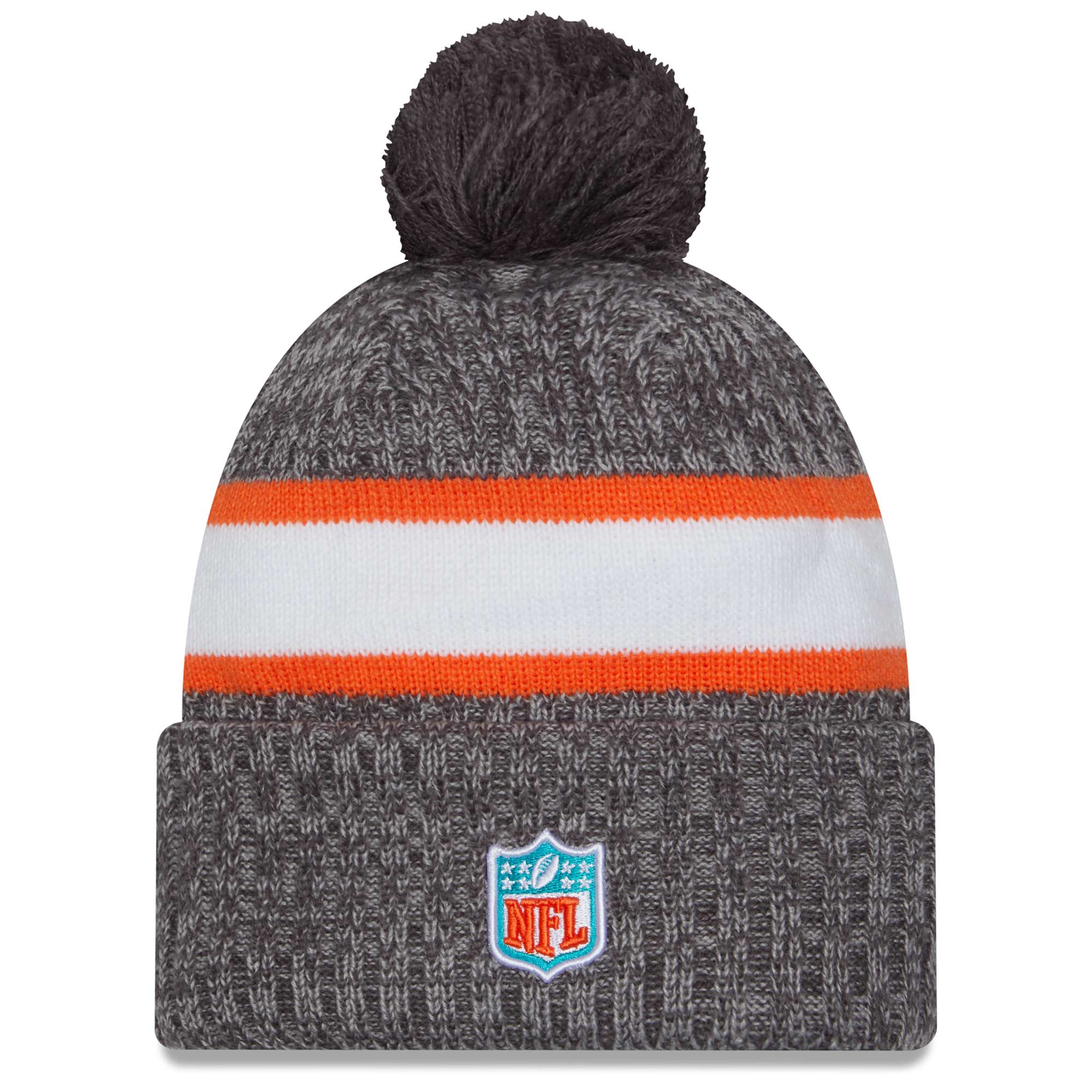 New Era American Football Knit Hat with Pom from your Miami Dolphins. Part of the Gray Colorway 2023 NFL Sideline Collection.