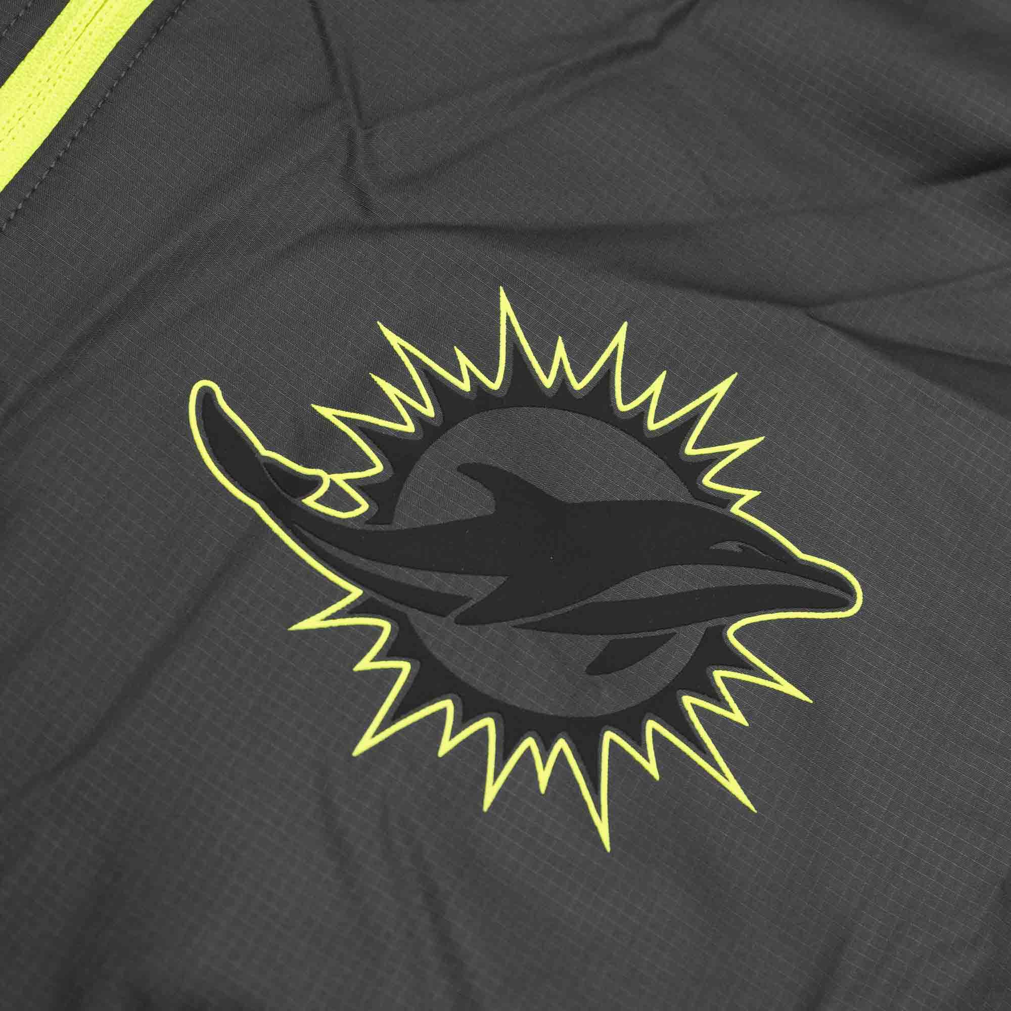 Amp up your style! The Nike VOLT Collection comes with neon yellow Miami Dolphins accents on a black background. Perfect for any fashionable football fan, the Nike Dri-FIT jacket is a lightweight outer layer designed with sweat-wicking technology and team graphics on the chest and sleeve to help you stay comfortable as you proudly support your team.