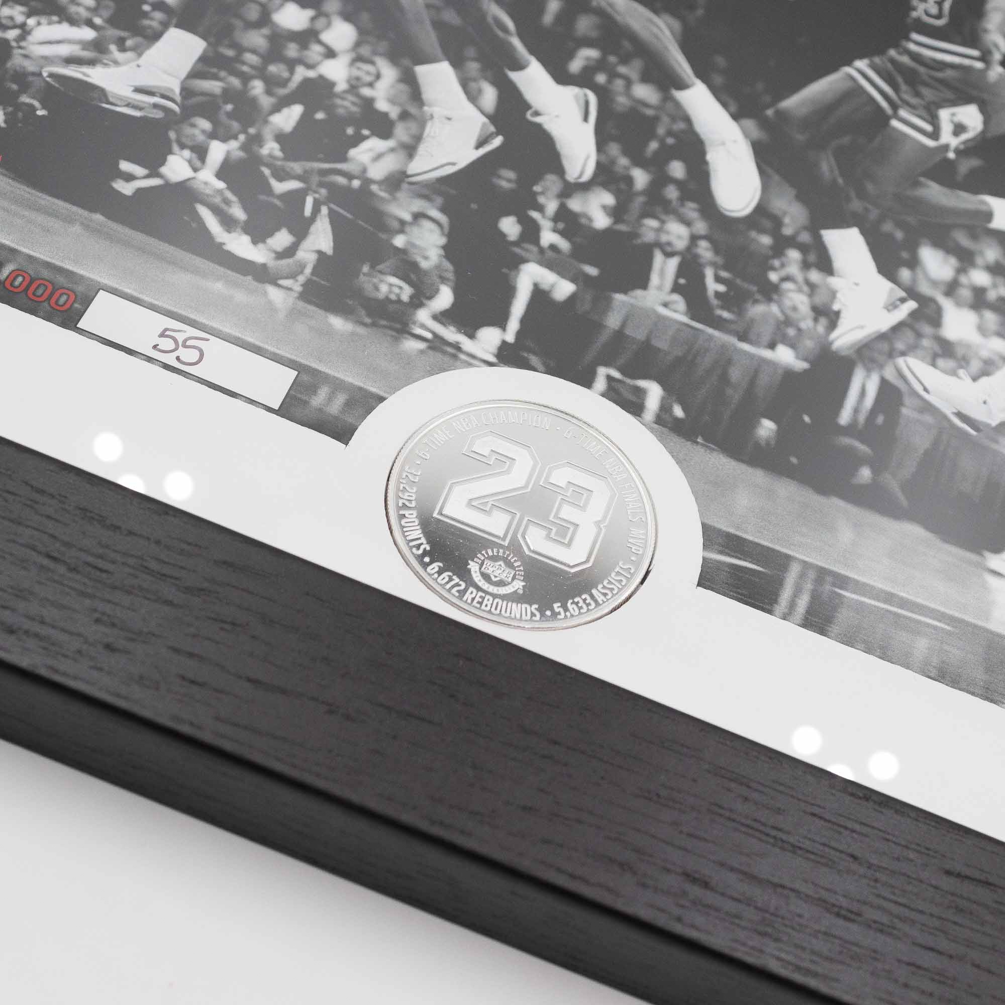 This limited edition collectible frame commemorates NBA legend Michael Jordan's unforgettable dunk during the 1988 All Star Game dunk contest. Featured in a 13"x16" silver frame with white matting under glass is a individually hand numbered 8"x 11" photo of the dunk with multiple photos as he glided through the air. Matted with the historic photo is a 39mm silver plated minted Michael Jordan 23.