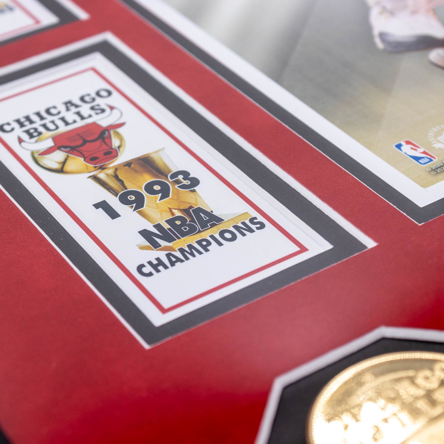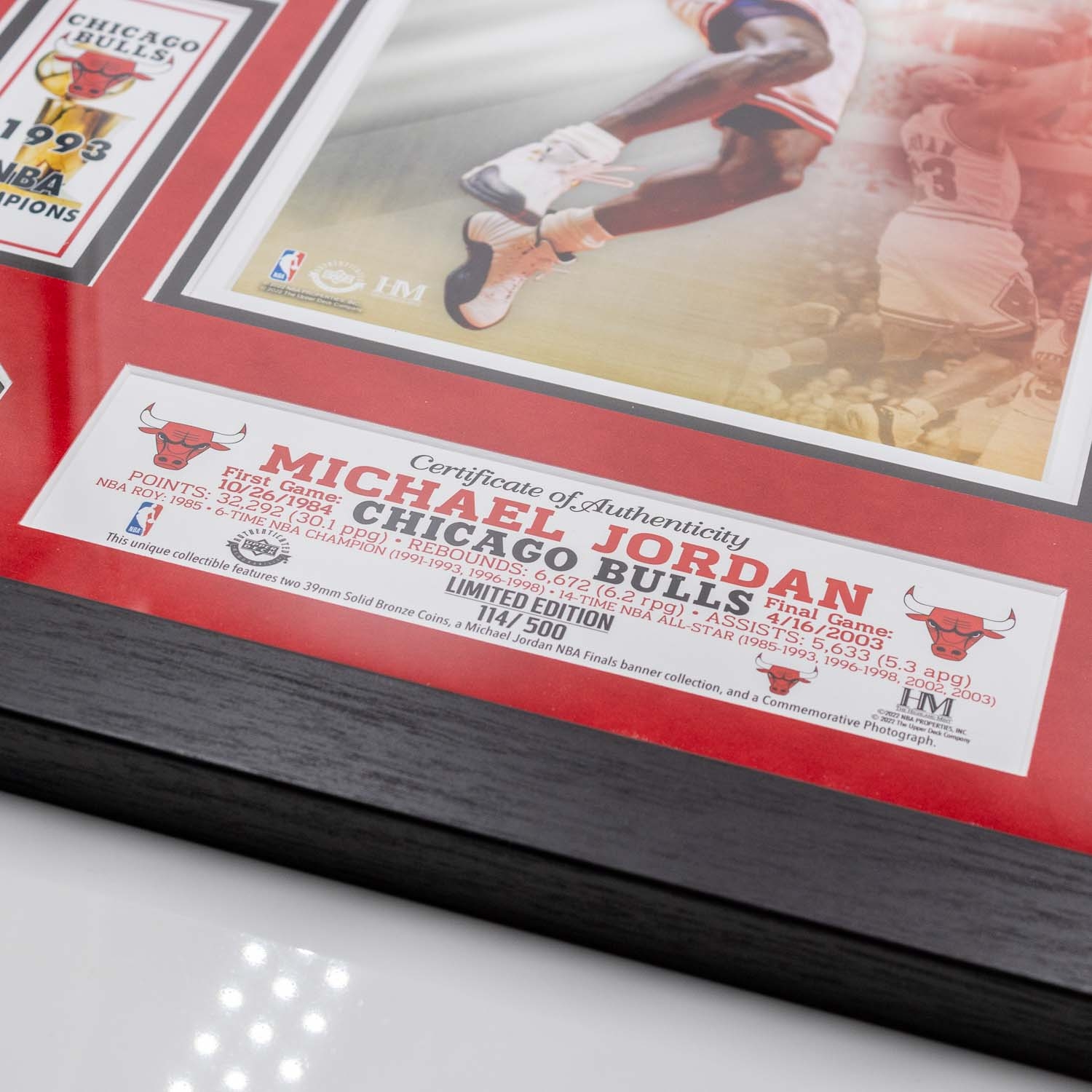 Highland Mint NBA Frame from Legend Michael Jordan with Two Minted Bronze Coins - 6x NBA Finals Champ Banner Collection.